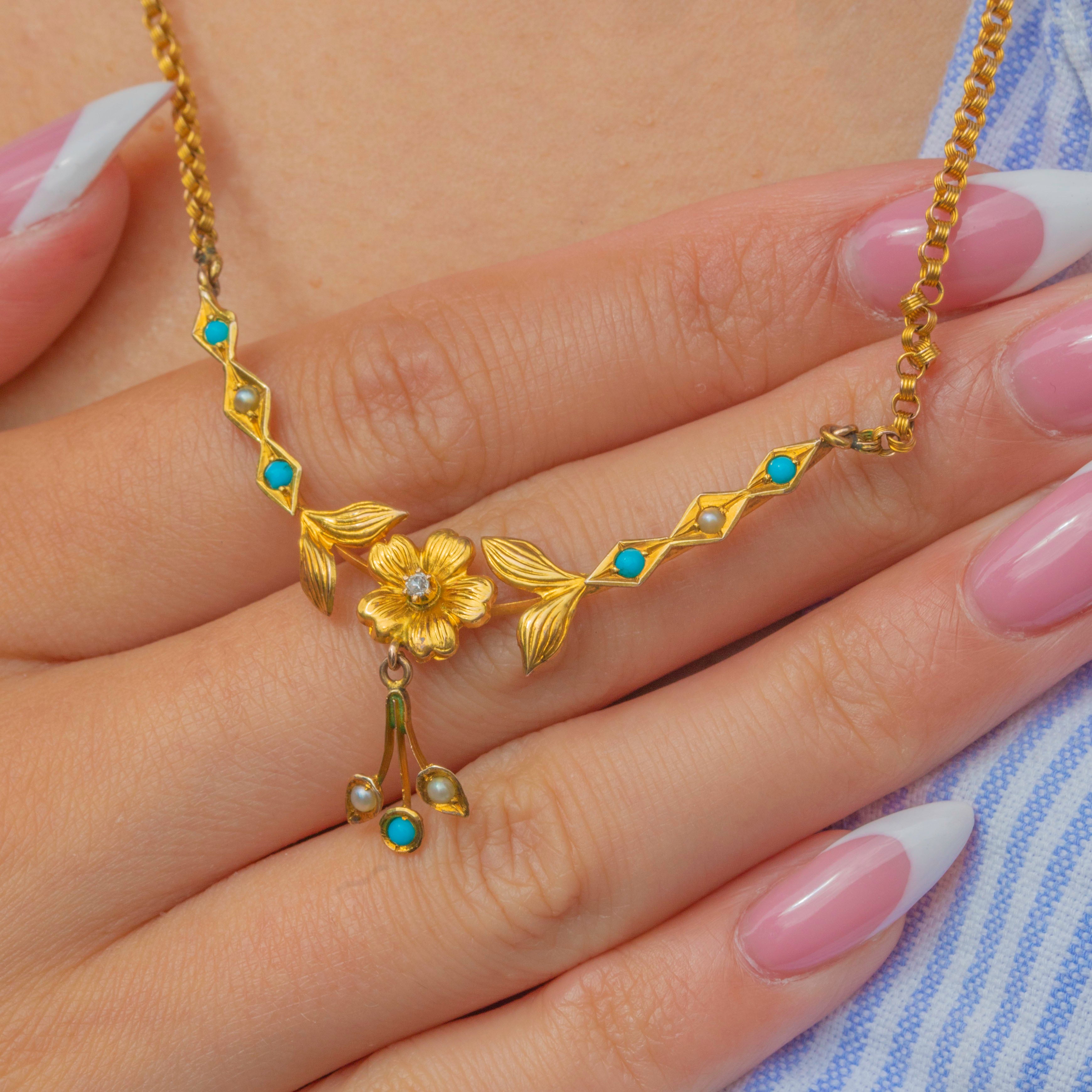 This Antique Victorian necklace in 9ct Gold is adorned with bright Turquoise cabochons and creamy natural Pearls in a delicate floral and foliate design. At the centre, a finely detailed Gold flower is set with a glistening Diamond accent, with a graceful drop featuring two Pearls and a Turquoise for added movement and charm. The articulated sections create a beautiful drape along the neckline, with the rich yellow Gold adding warmth and elegance.