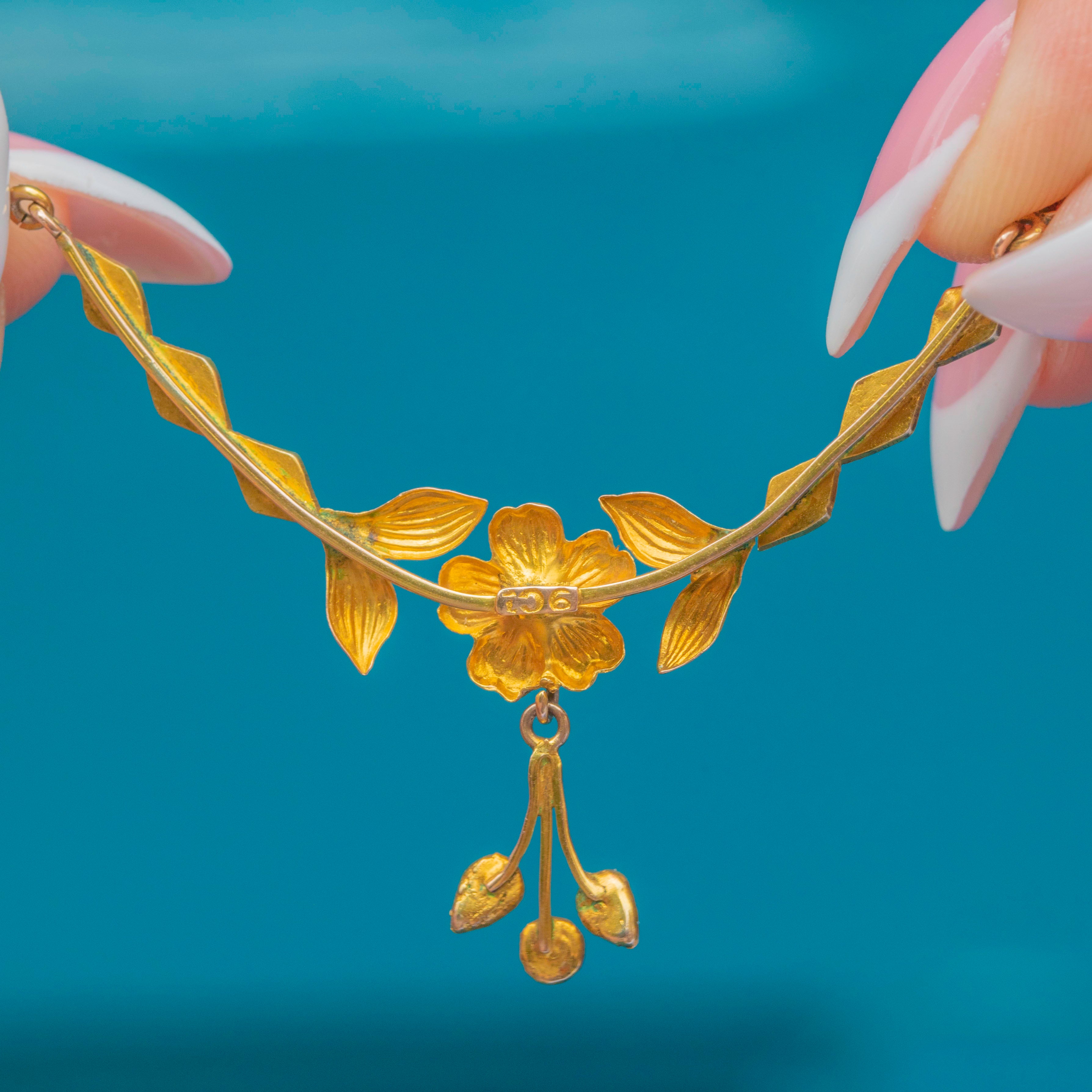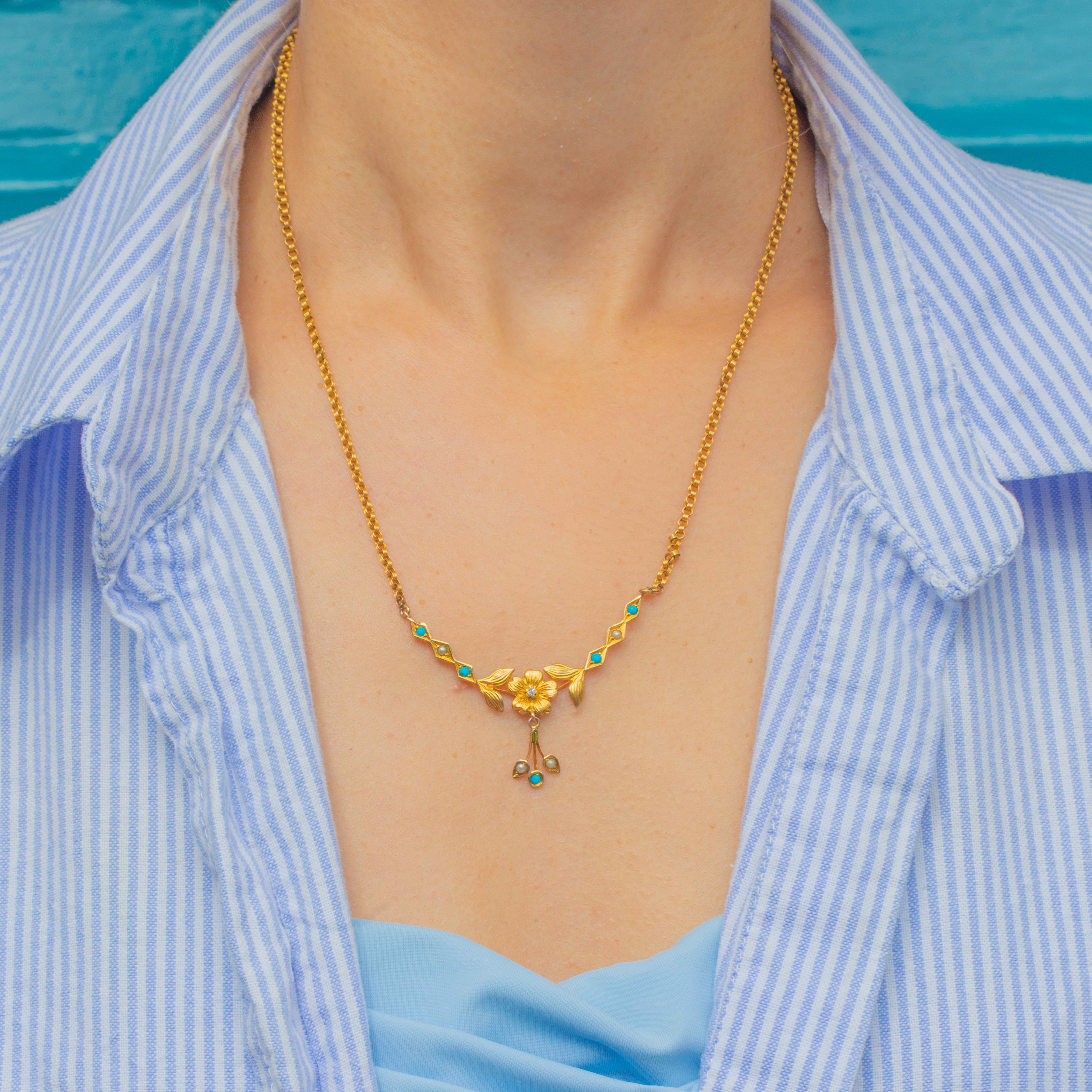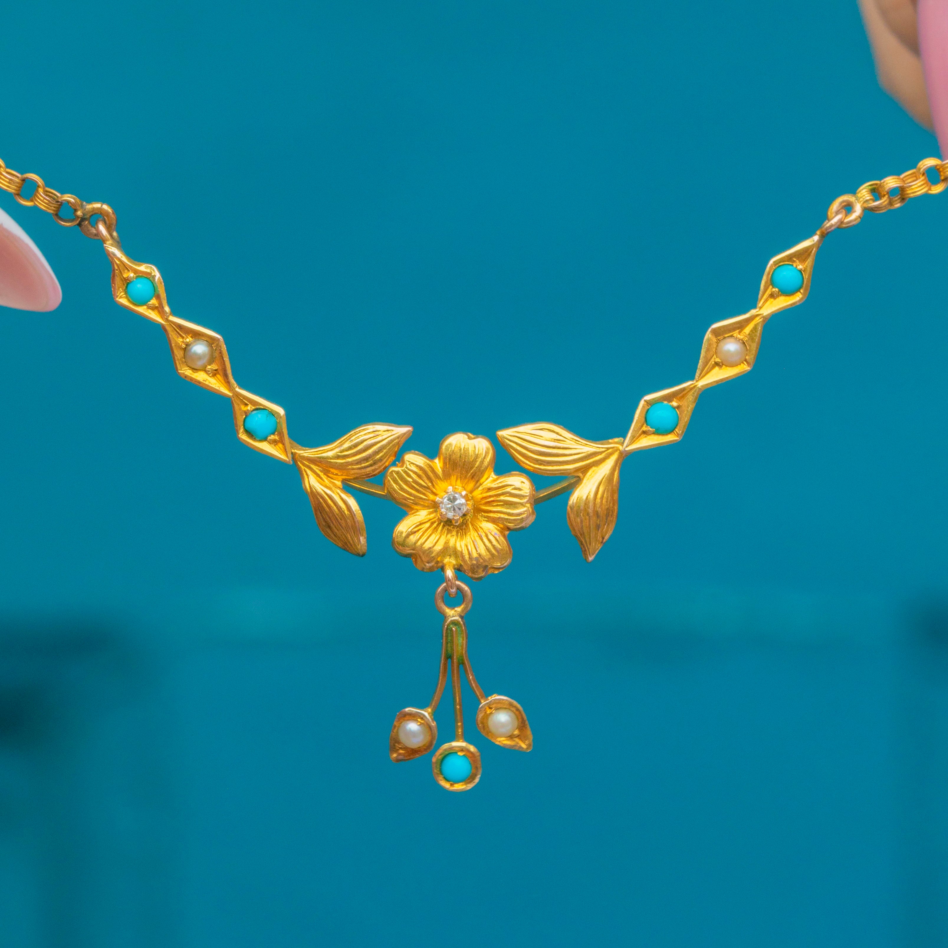 Antique 9ct Gold Turquoise Pearl Floral Necklace