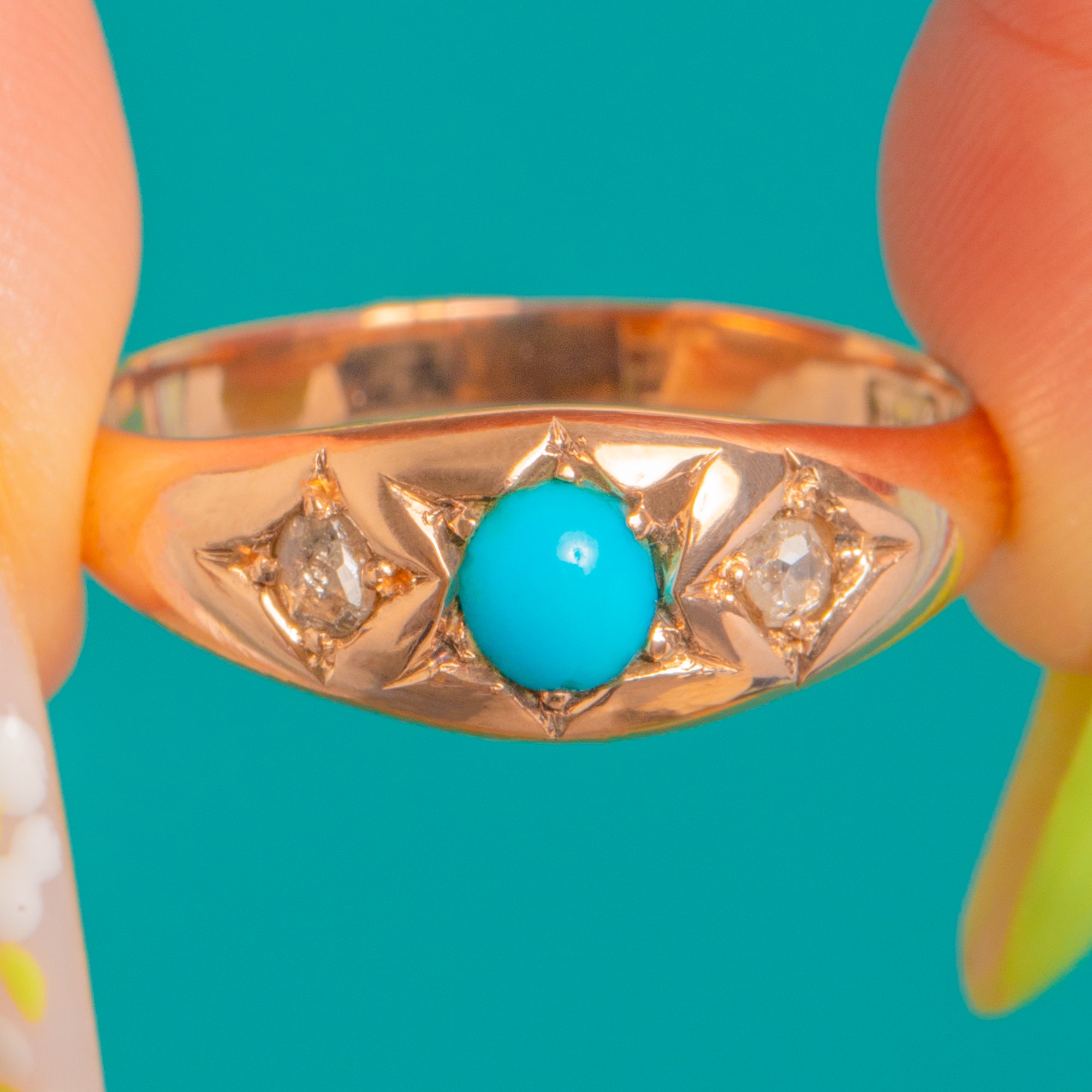 This Victorian 9ct Gold three-stone ring is a delicate treasure with timeless charm. A vivid sky-blue Turquoise cabochon sits centre stage, flanked by two twinkling Diamonds in engraved, star-point settings. The warm, rosy hue of the Gold and the low-profile silhouette make it an easy, elegant piece to wear every day.