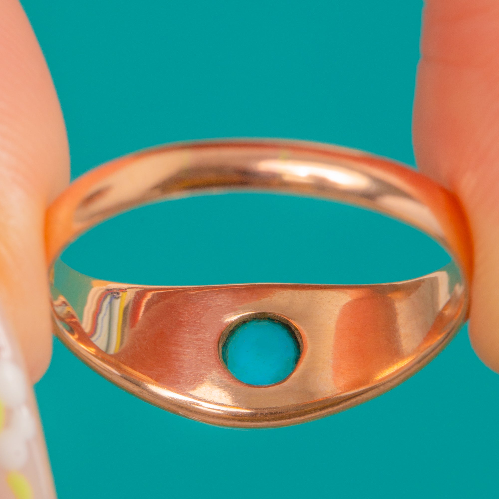 VERY GOOD: The Turquoise cabochon presents with bright colour and a smooth dome; the Diamonds are lively with no obvious chips seen. The Gold shows light surface scratches and gentle wear consistent with age, and there is a neat, visible resize to the shank. Settings are secure with minor natural patina, including slight darkening at the base of the Turquoise setting, all commensurate with age and careful wear.