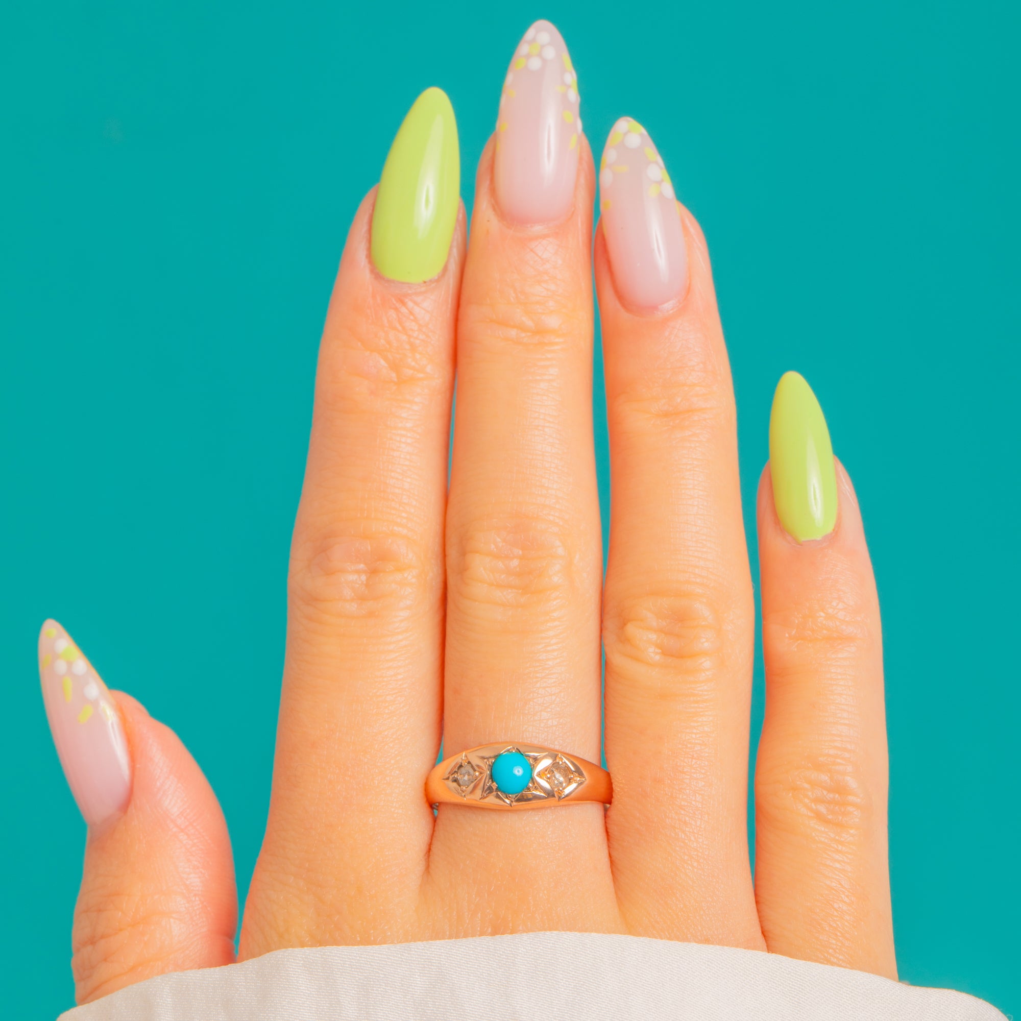 Period detailing elevates the simplicity: crisp star and lozenge engraving around the side stones, polished shoulders, and a slim, tapering shank for a refined finish. Understated yet characterful, it’s a beautiful pop of colour and sparkle with that softly worn, antique allure.