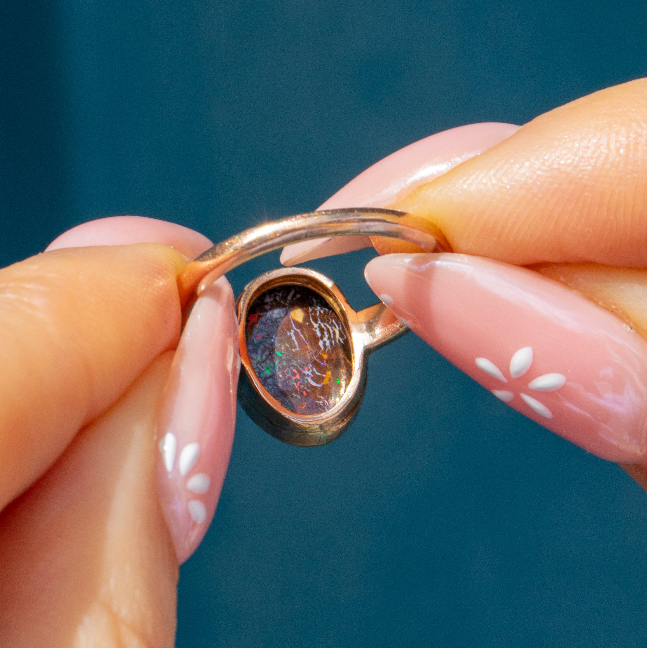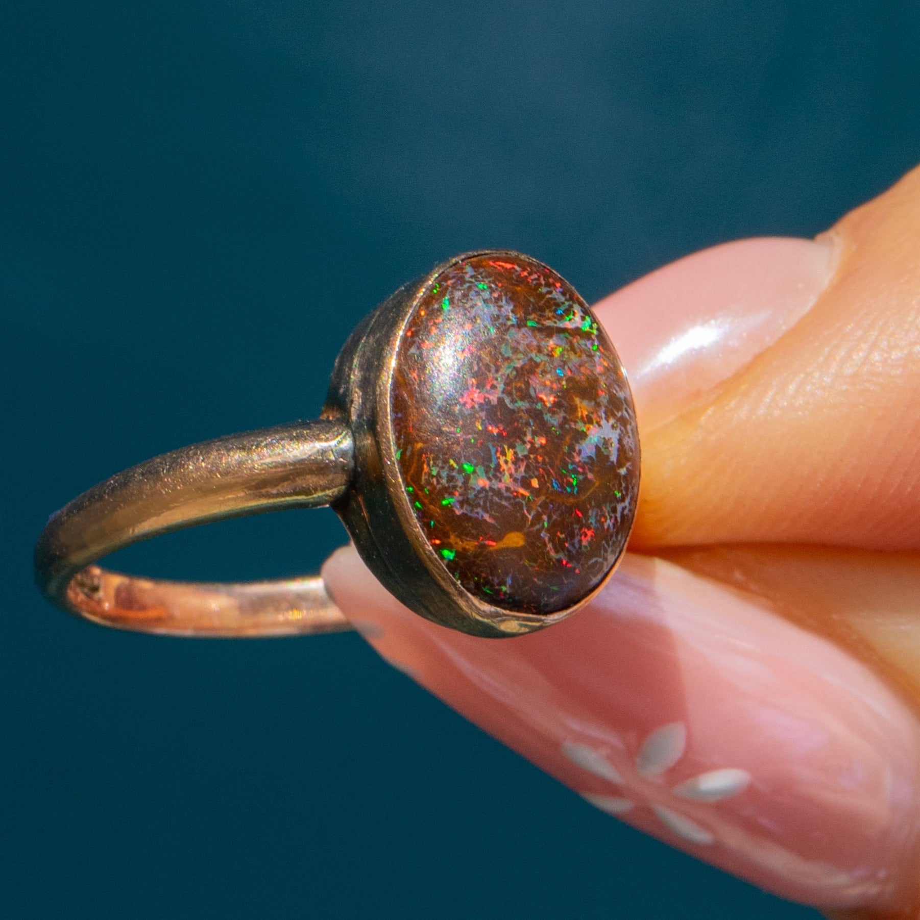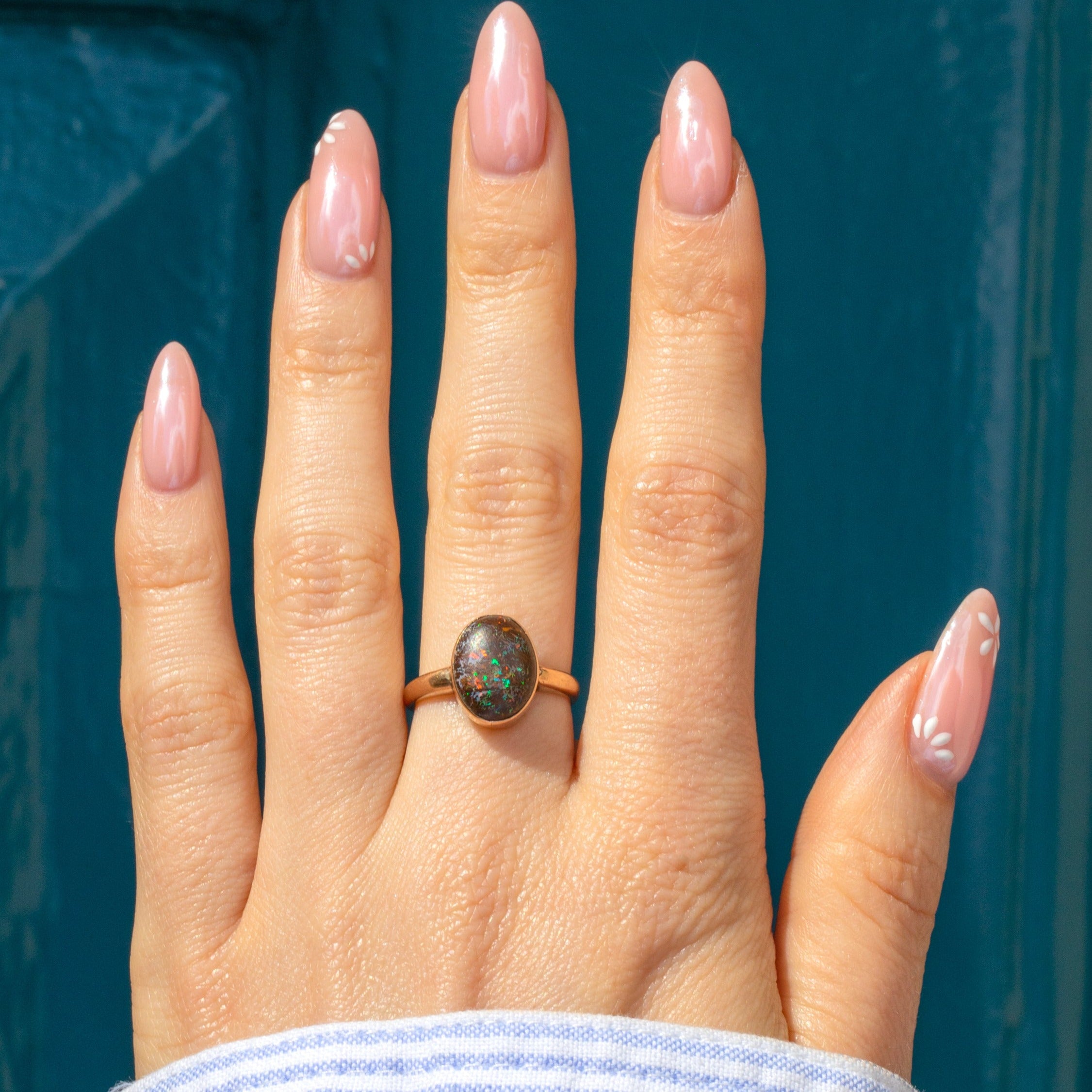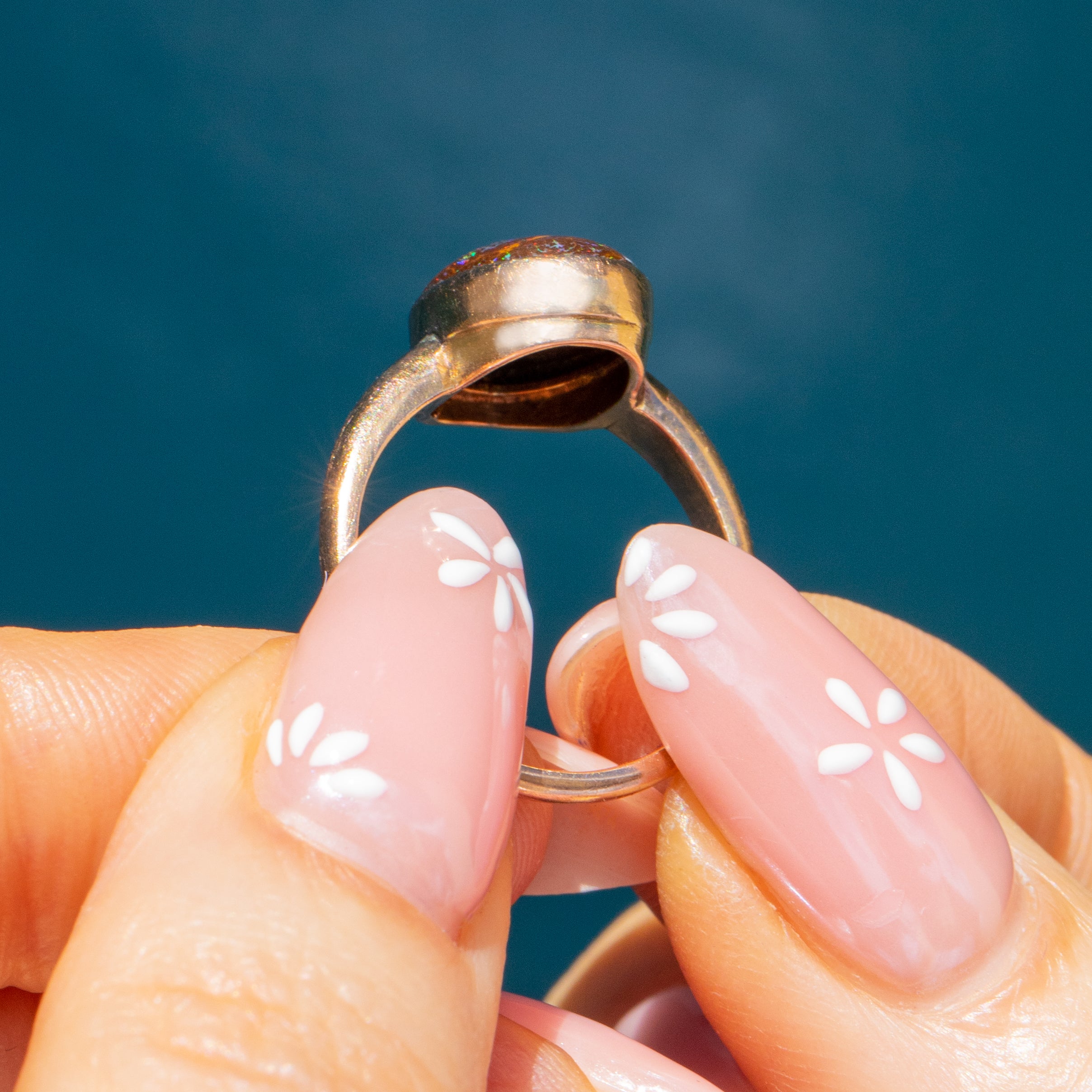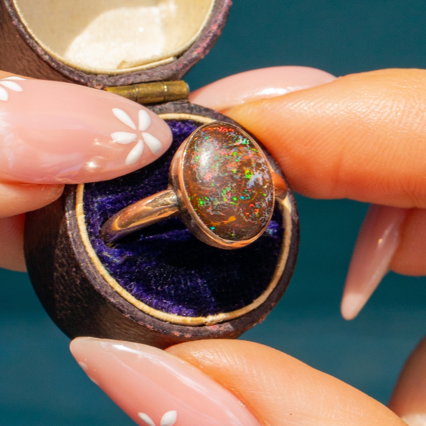 This phenomenal antique 9ct Gold Wood Opal ring is guaranteed to add some intrigue to your collection! Crafted from solid 9ct Gold, this Victorian ring has a superb cabochon-cut Wood Opal boasting a confetti display of neon colours across its smooth surface.