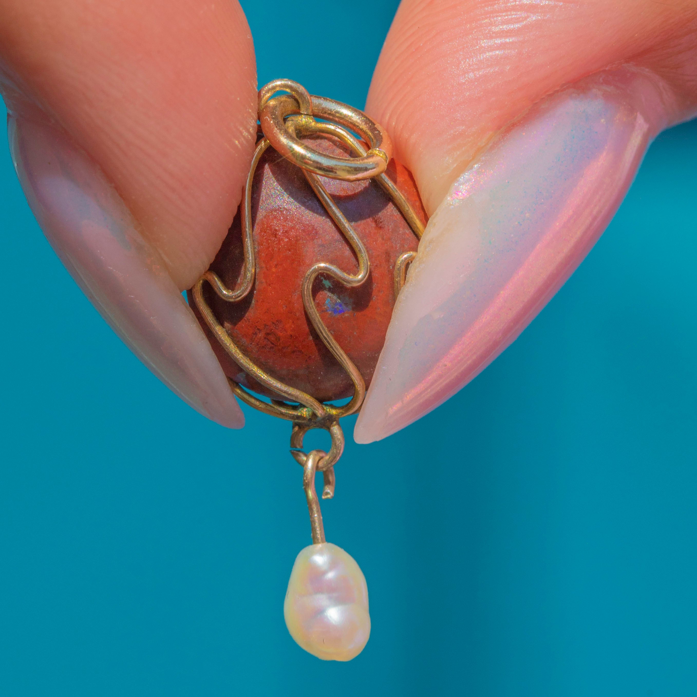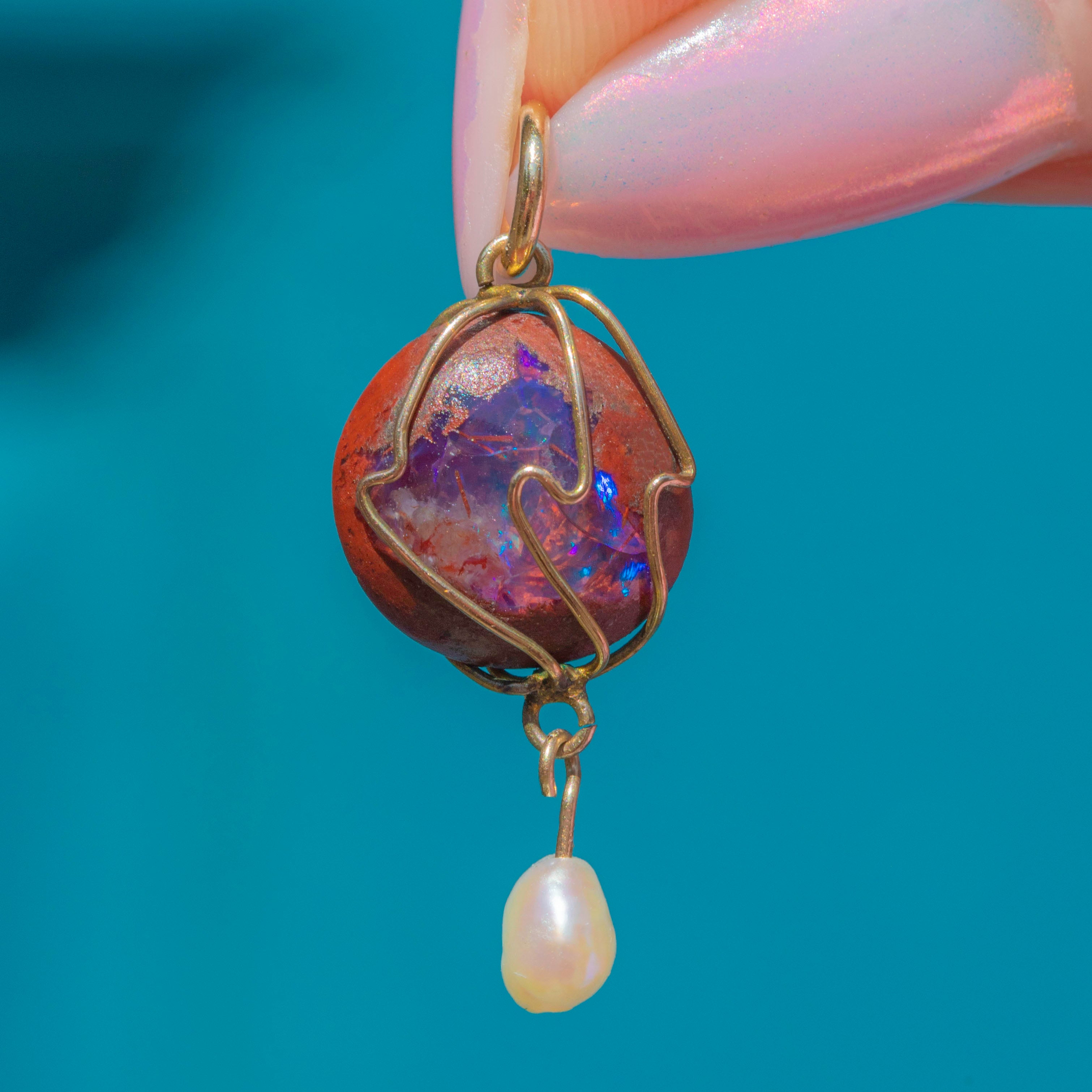 Antique Arts & Crafts Era 9ct Gold Caged Boulder Opal Pearl Pendant