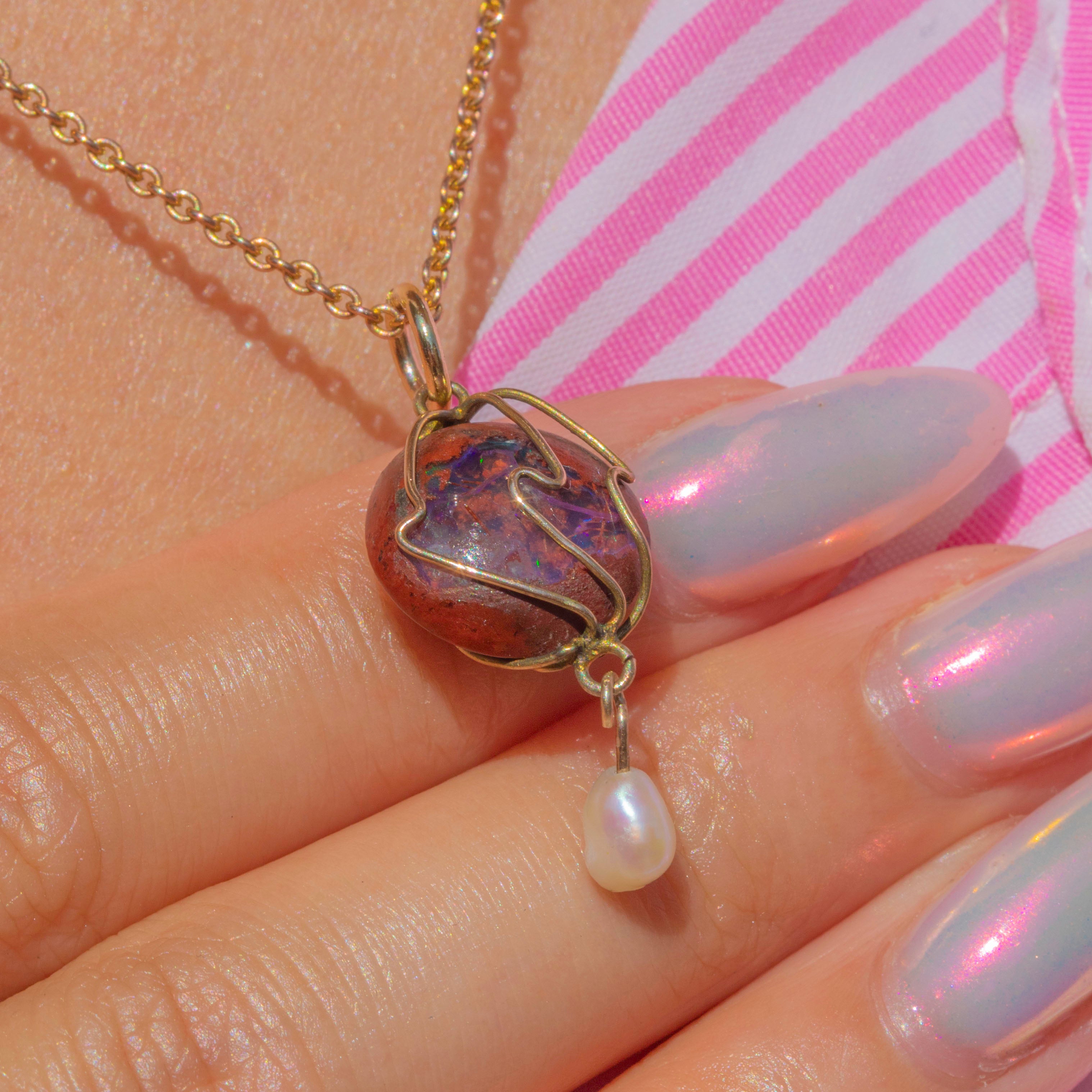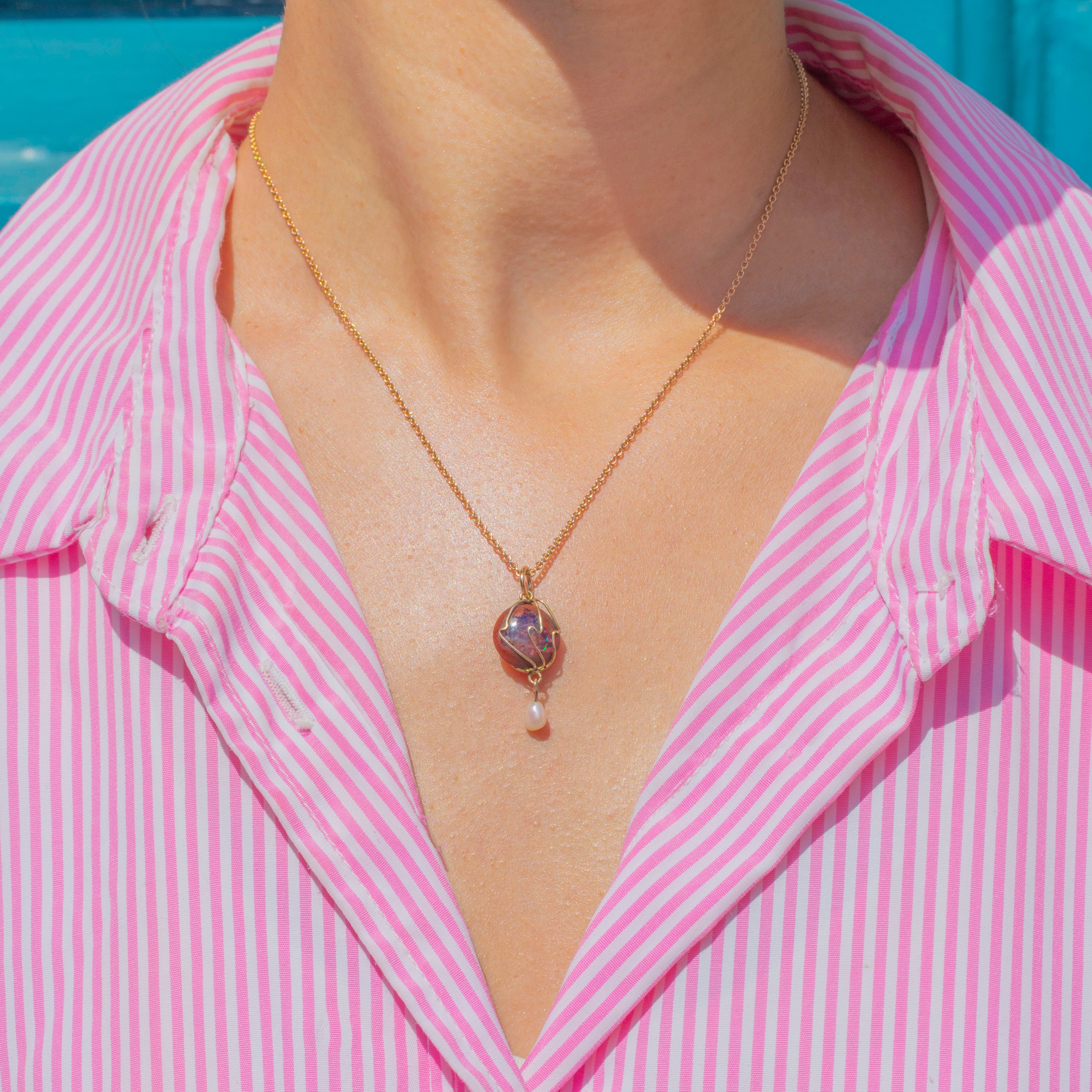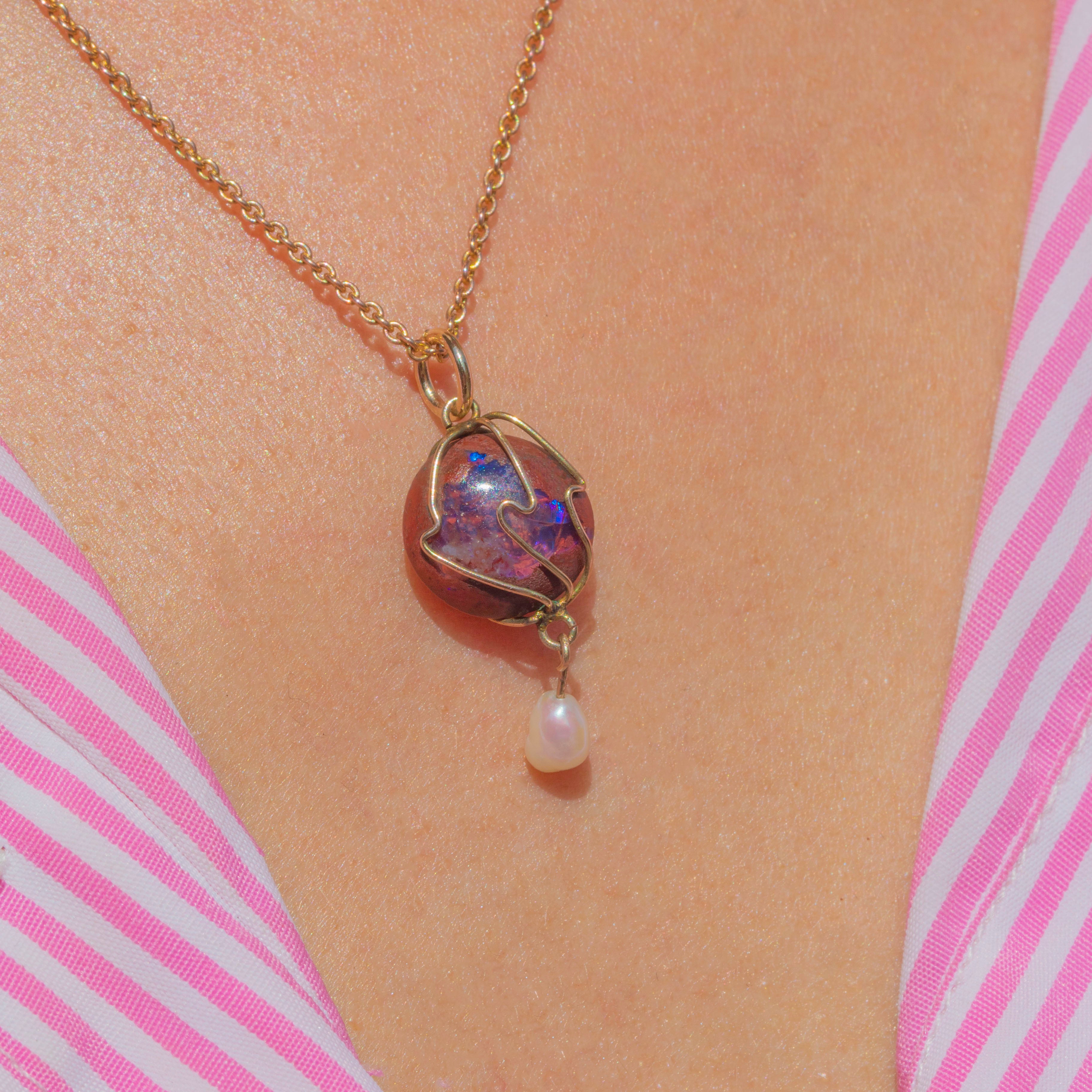 A striking example of Arts & Crafts jewellery, this antique pendant displays a natural Boulder Opal suspending a shimmering Baroque Pearl at its base.