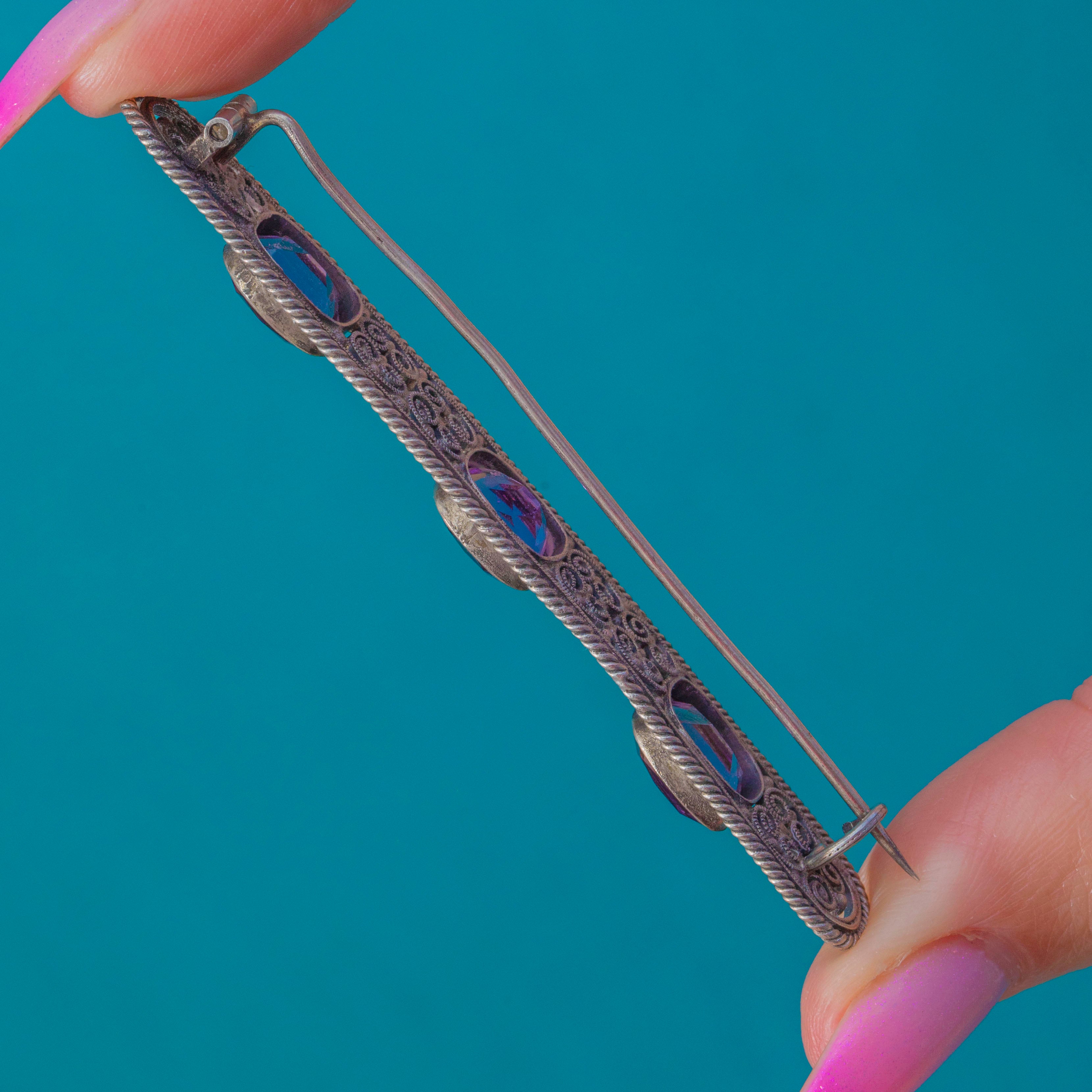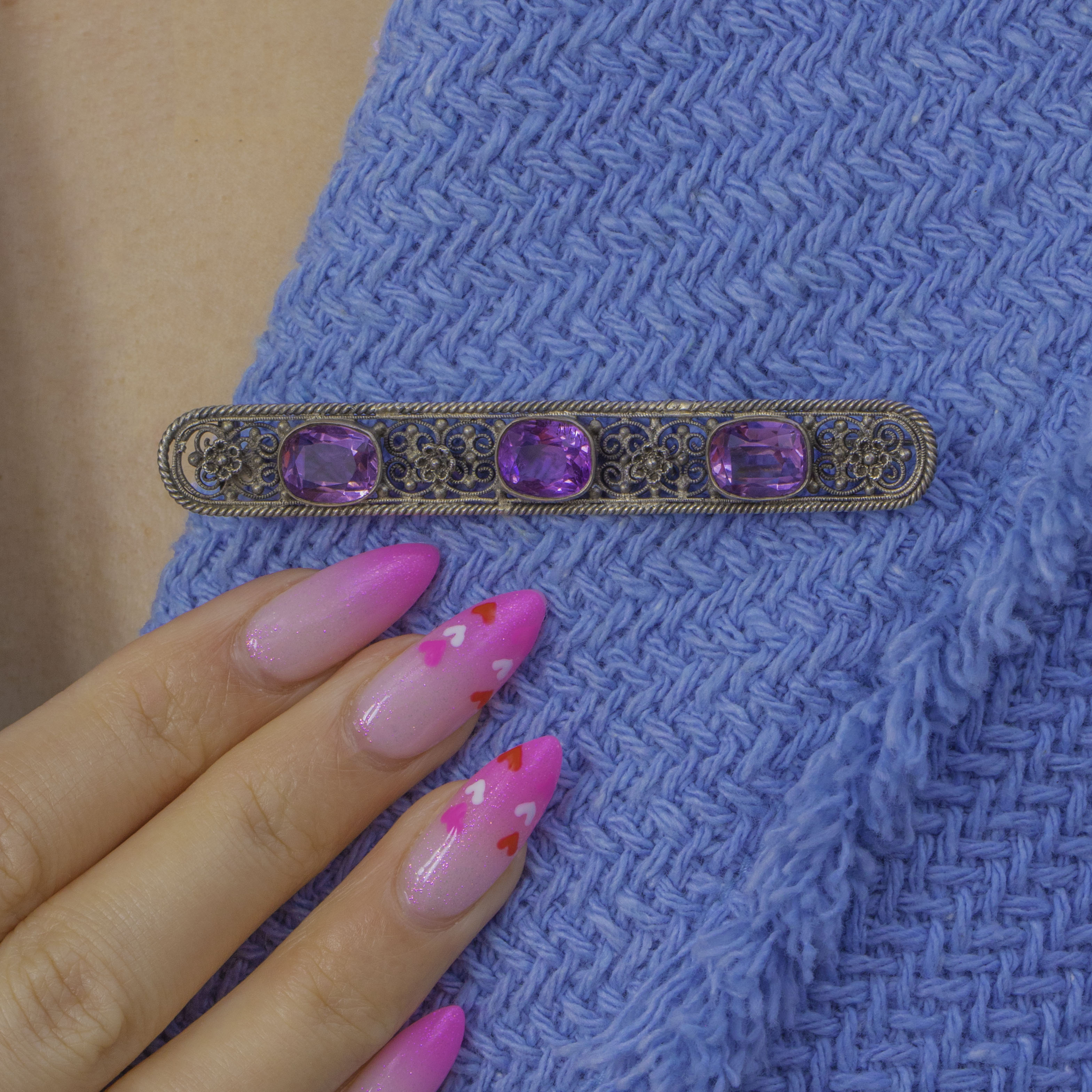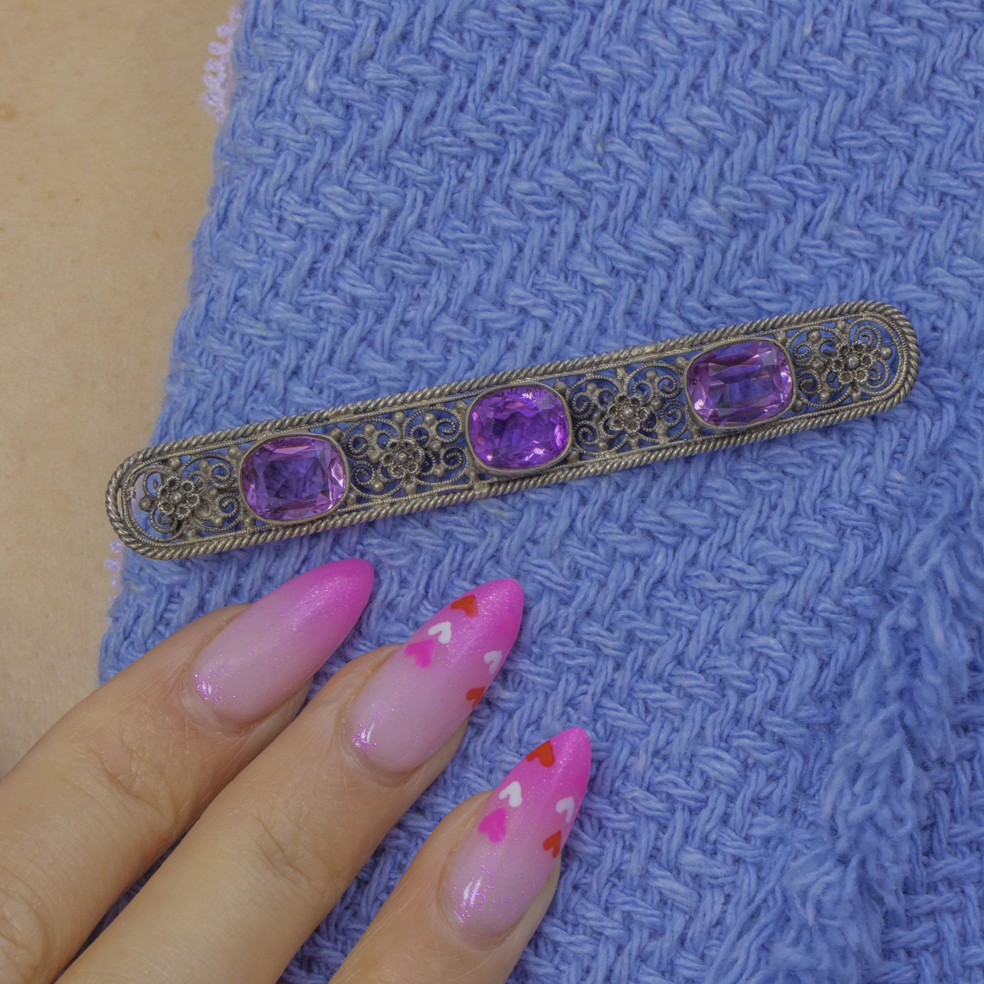 A lyrical Arts & Crafts bar brooch in Silver, its elongated silhouette brimming with delicate openwork filigree and finished with a refined rope‑twist border. At the heart, three beautifully faceted Amethysts glow in vivid violet tones, each held aloft in raised bezel settings to catch the light with every movement.