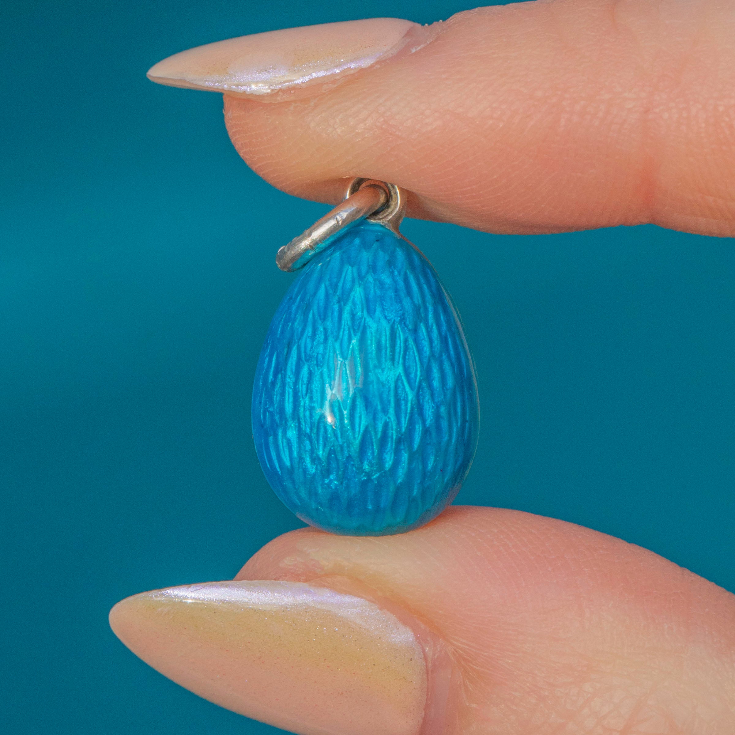 VERY GOOD-EXCELLENT: This antique blue Enamel egg pendant is in superb condition. Her Enamel is vibrant and catches the light wonderfully. There are some minor signs of wear to the bale and a small pinhole on the bottom of the pendant, however this cannot be seen during wear and does not detract from her beauty. With a securely soldered bale, you can wear her with confidence!