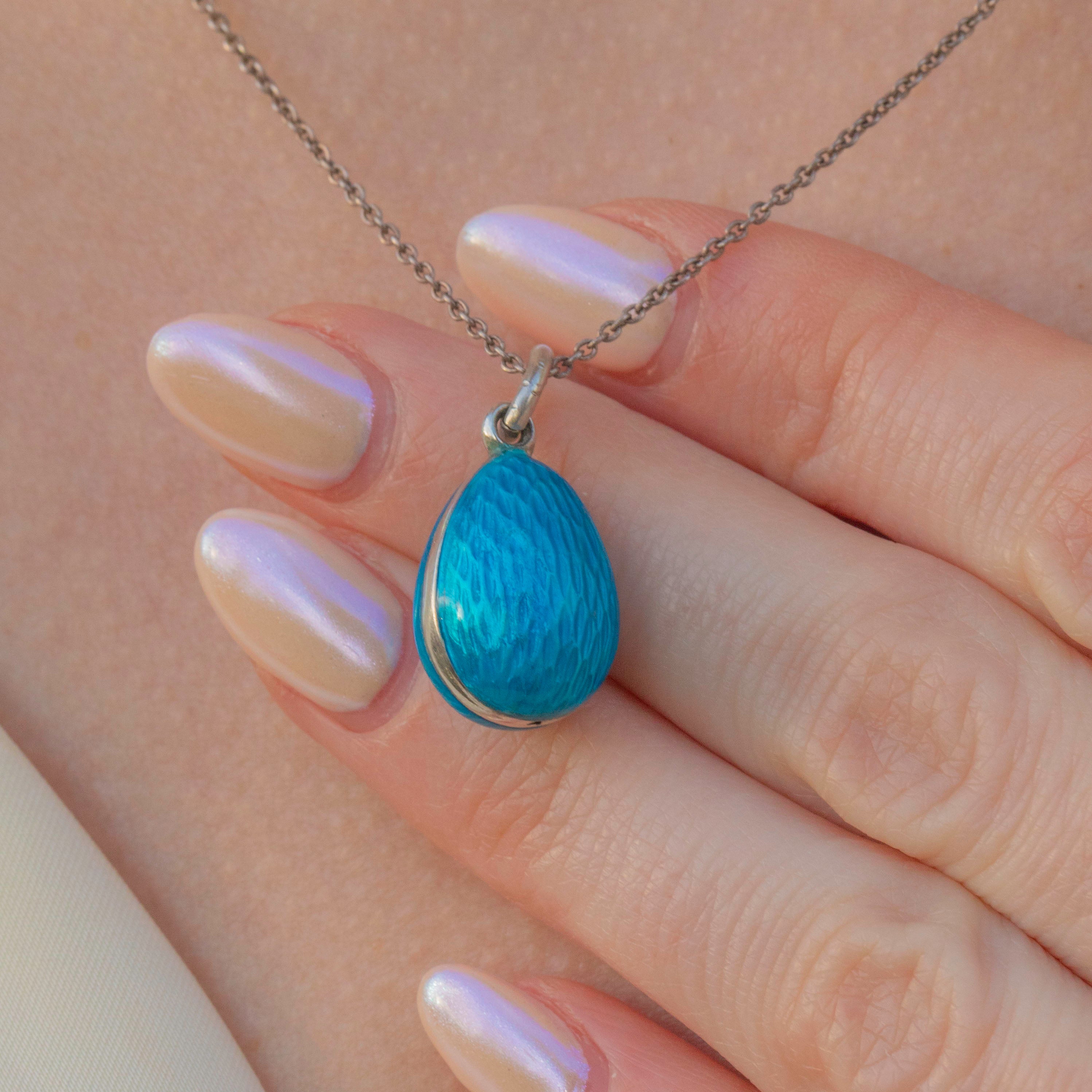 A gorgeous antique blue Enamel egg pendant to add to your neck stack! Crafted from Sterling Silver and inliad with wonderfully vibrant Blue Enamel, this faberge-style egg pendant is sure to add a pop of colour and allure to your collection.