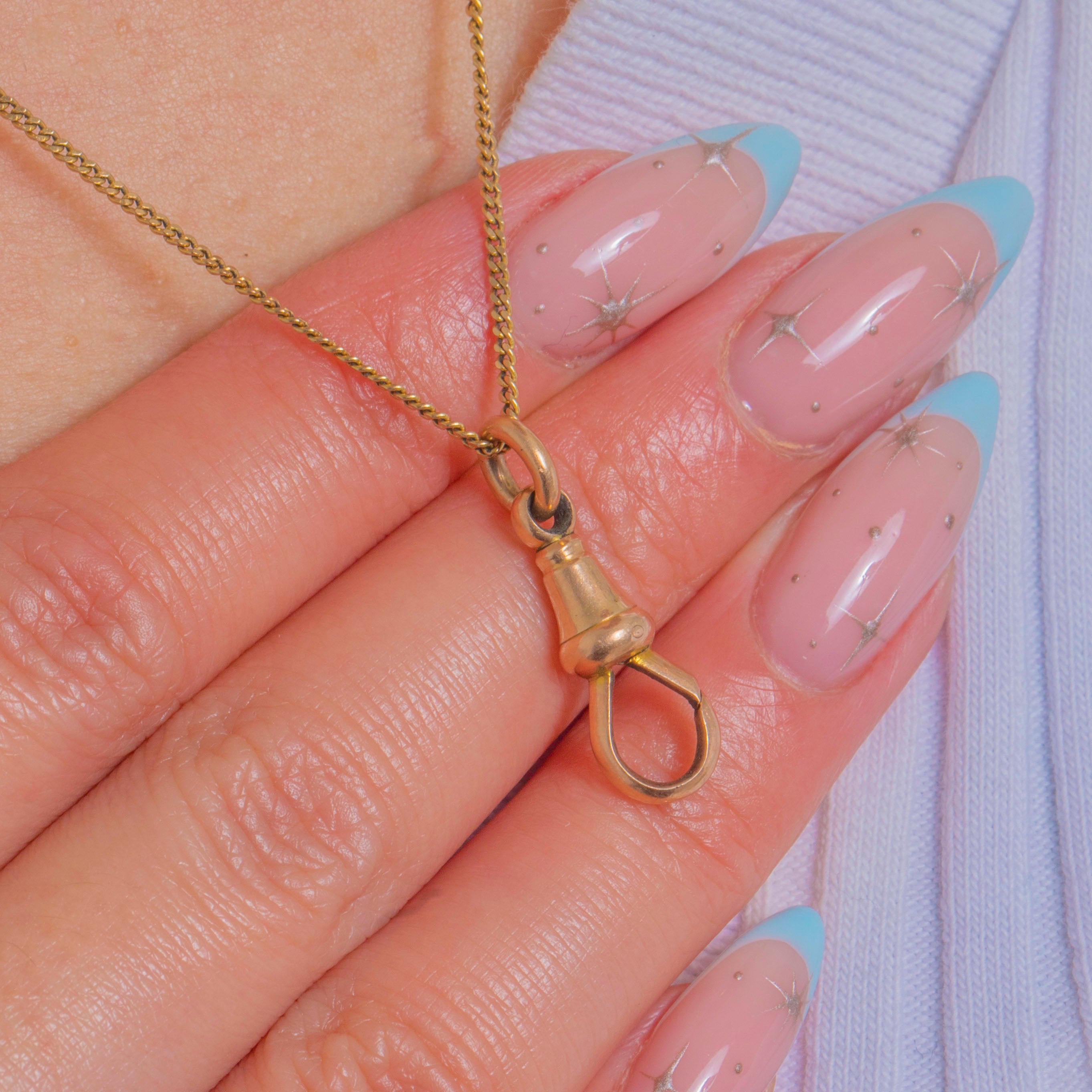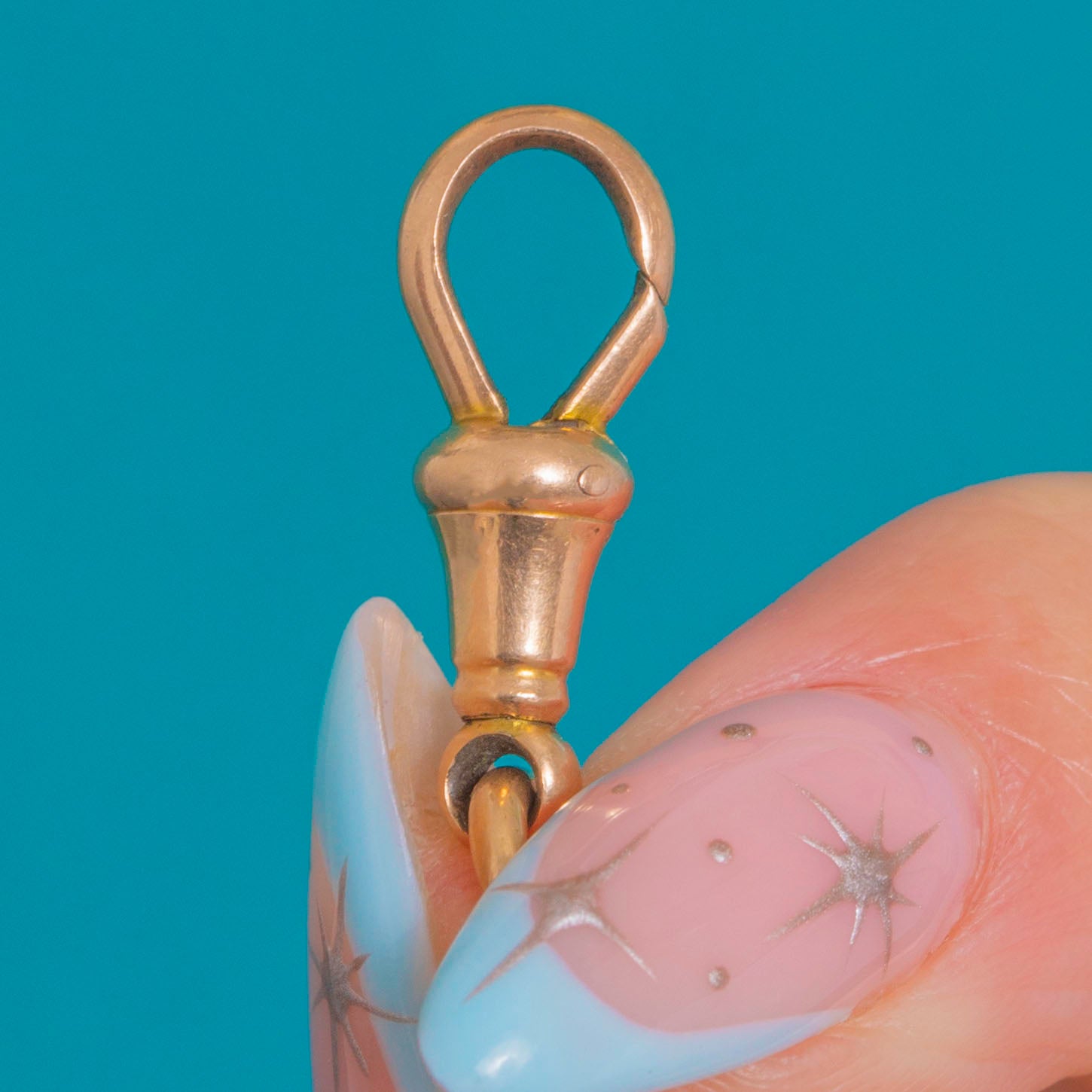 Bright, polished and expertly made, it’s a timeless antique accessory with sleek lines and crisp mechanics. The spring gate opens and closes smoothly, offering a chic, minimalist finish to any antique chain or charm curation.