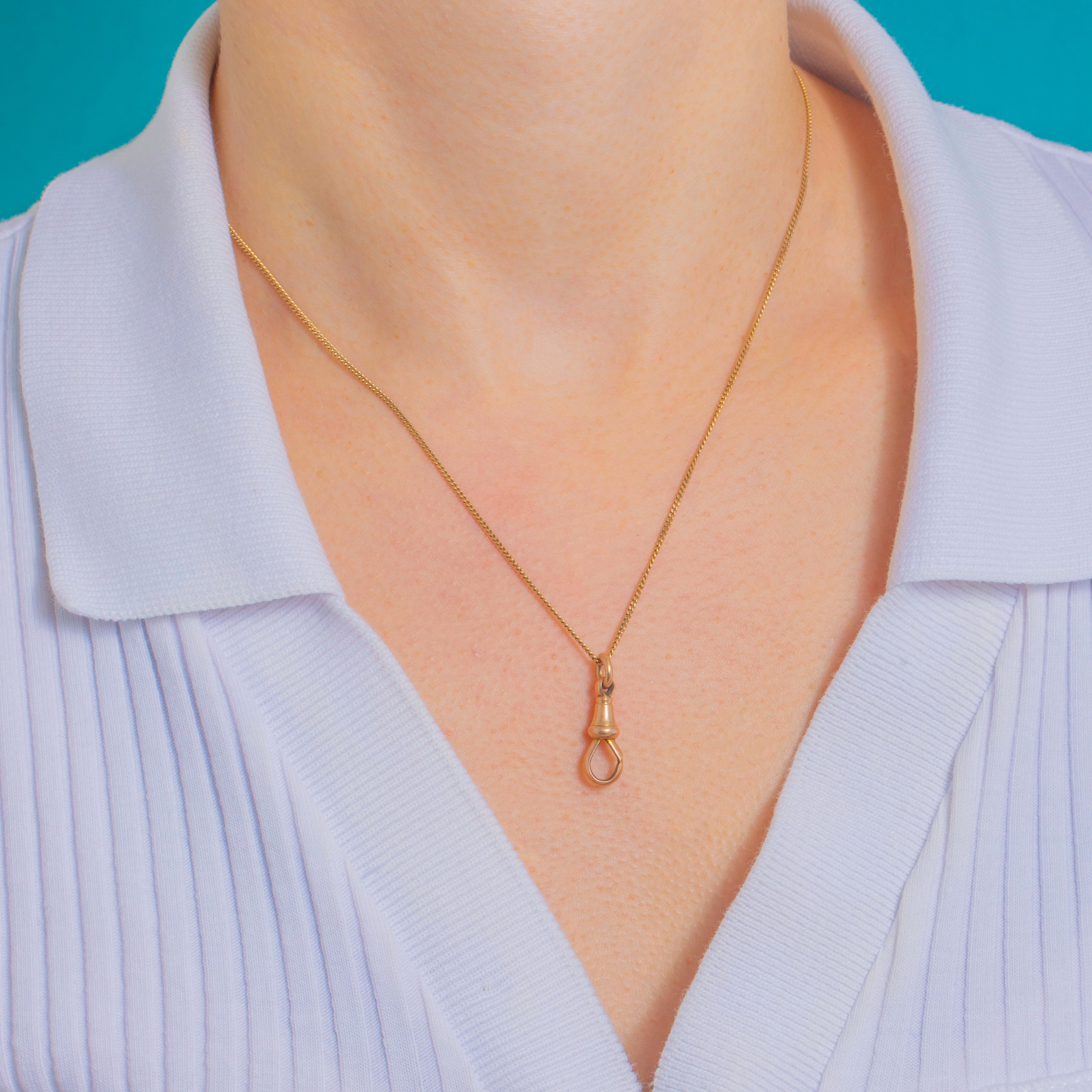 An elegant Victorian 9ct Gold dog-clip clasp in a beautifully buttery yellow tone. Its smooth, turned baluster body and elongated pear-shaped spring gate give this classic piece its refined, utilitarian allure.