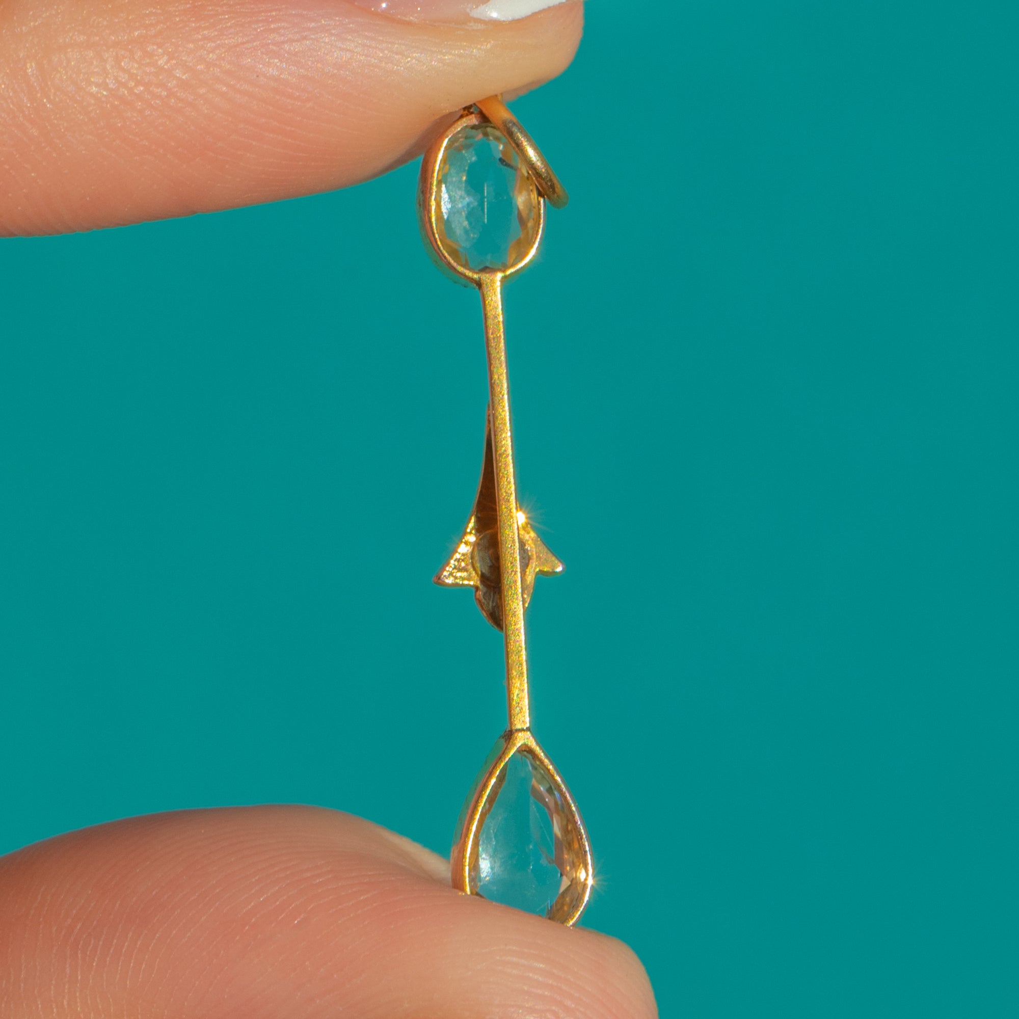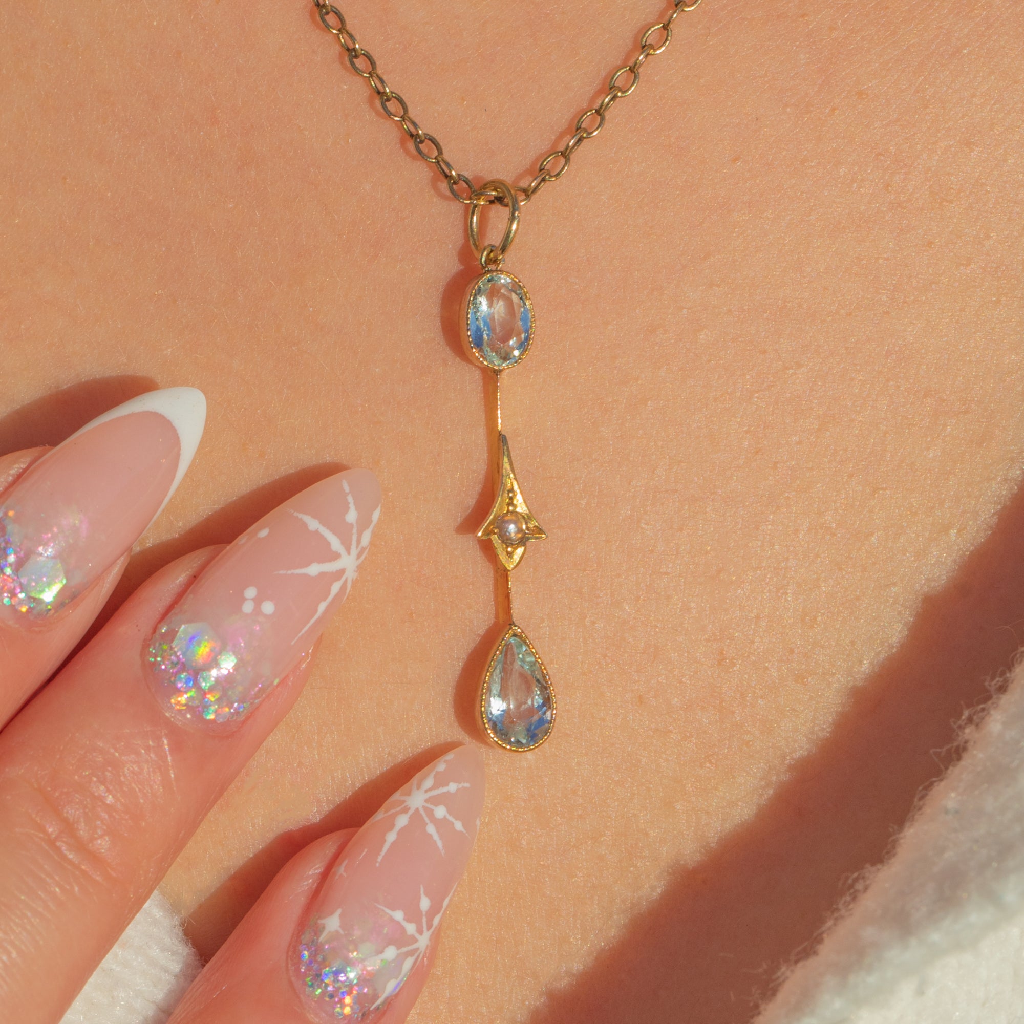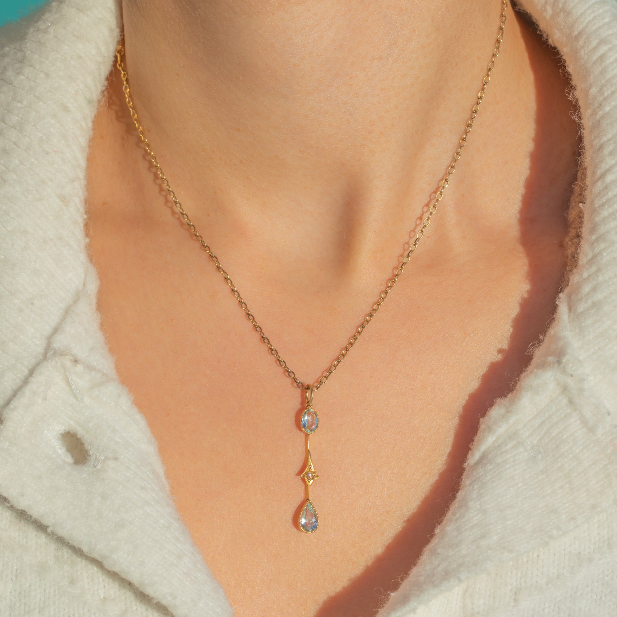 Airy and elegant, this Edwardian lavalier pendant is crafted in 9ct Gold with crisp millegraine detail. Two pale blue Aquamarines—an oval above and a pear drop below—sparkle with that soft, watery glow so beloved of the era, totalling approximately 0.65ct. Between them sits a tiny central Pearl, adding a luminous whisper of white.