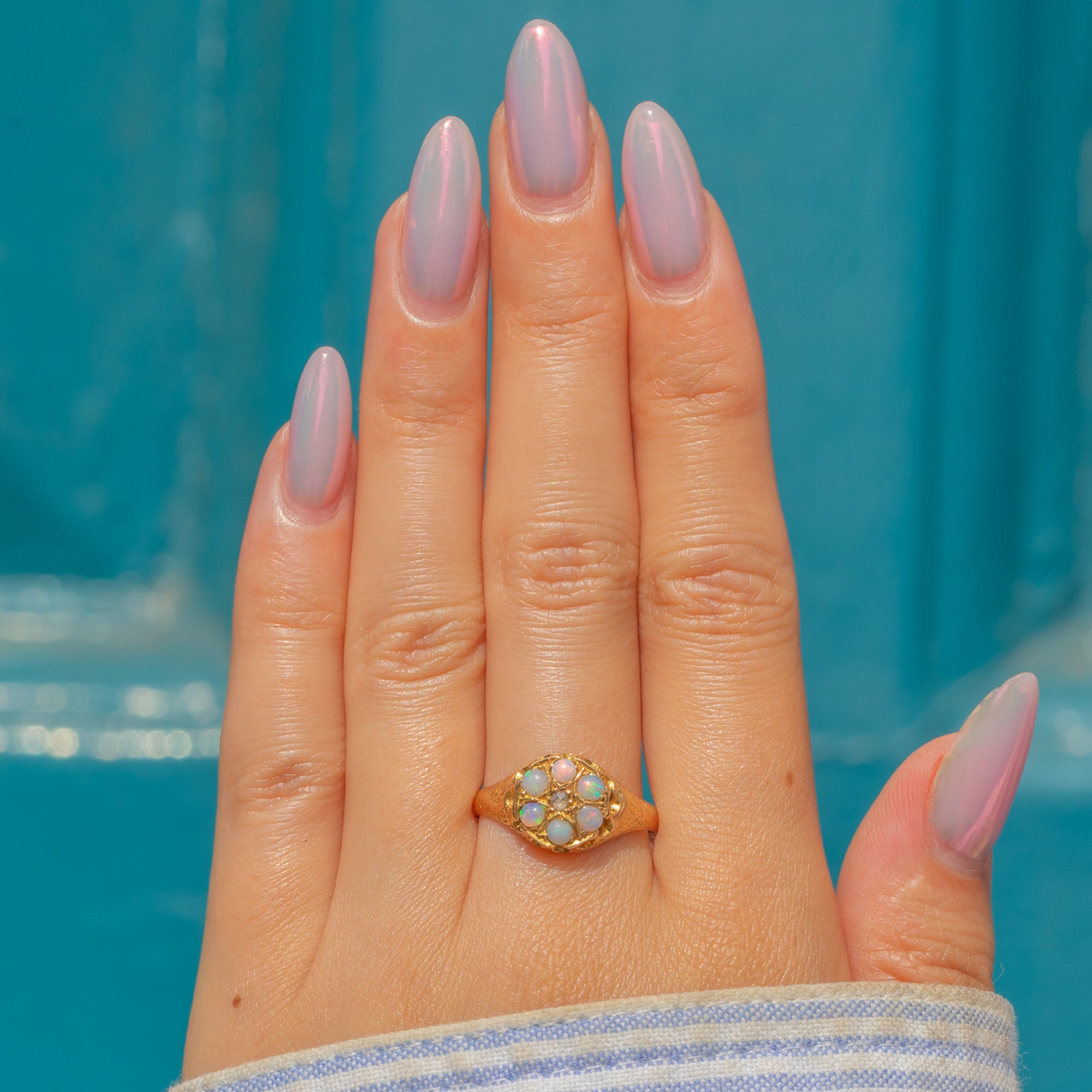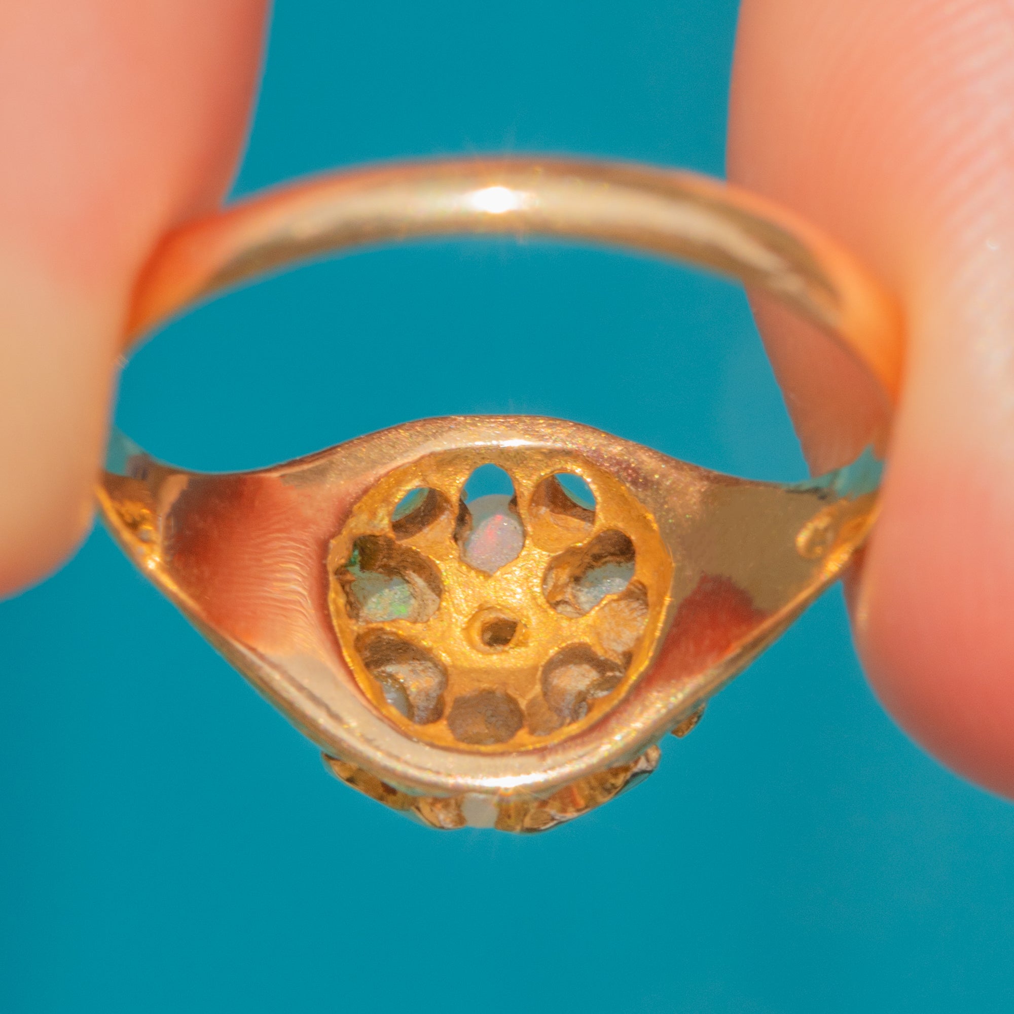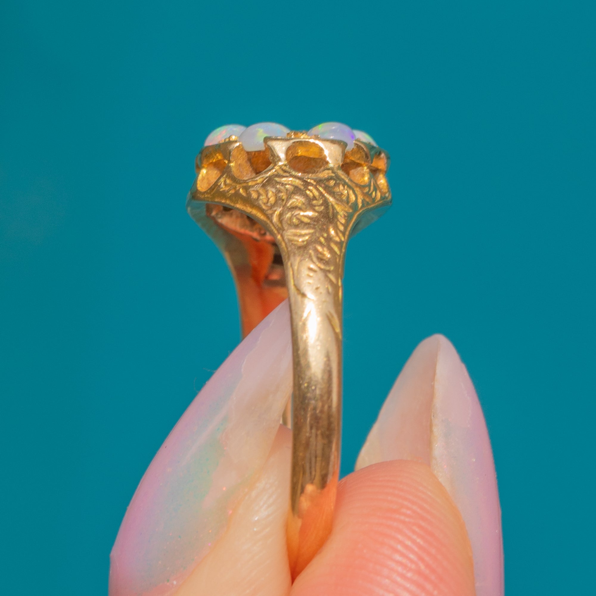 An outstanding Victorian cluster ring, flaunting six iridescent lilac Opals projecting a kaleidoscope of orange and green hues as they catch the light.