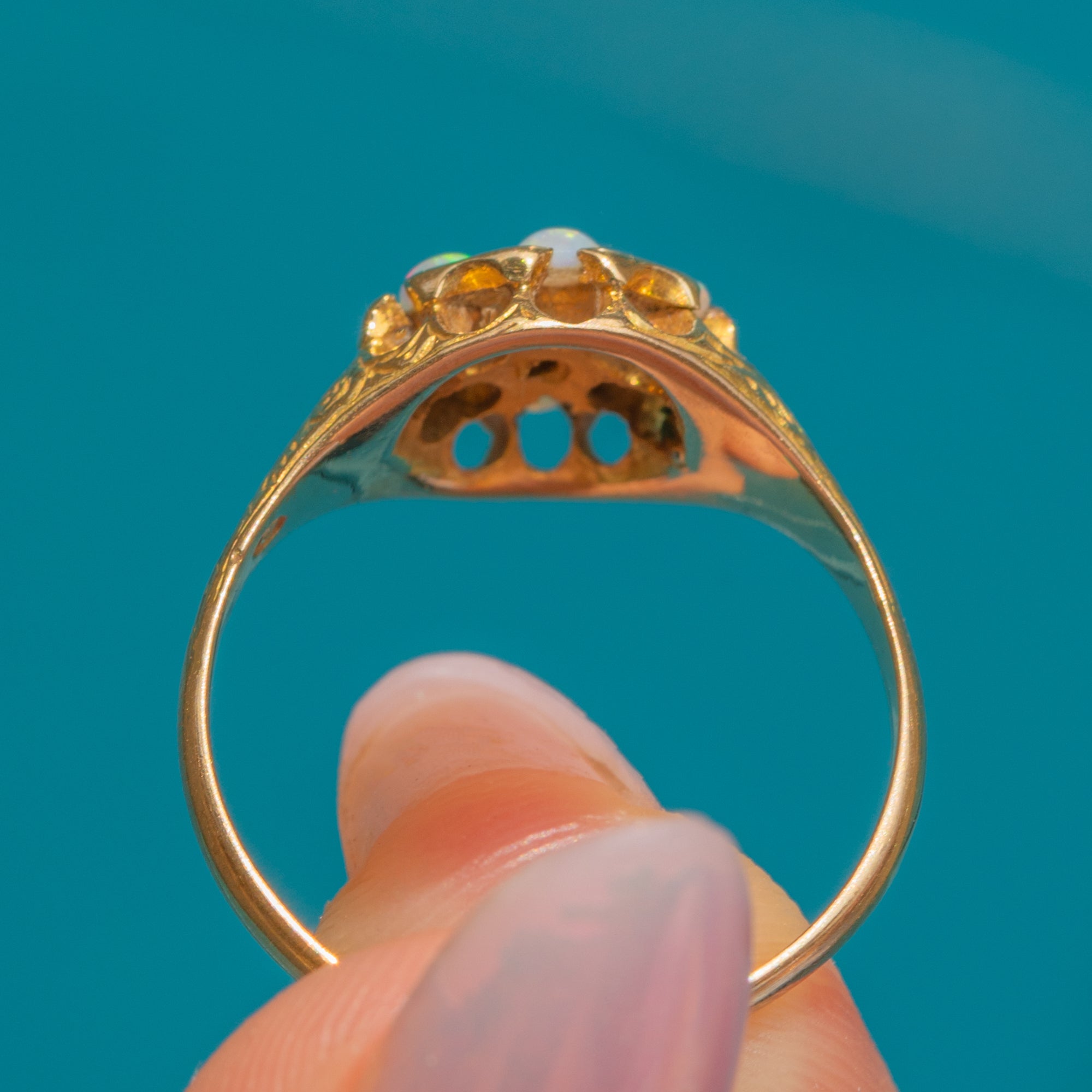 The Opals are centred by a scintillating star-set rose-cut Diamond, adding a touch of Victorian celestial allure. Complete with an ornately engraved, glossy 18ct Gold band, this antique ring provides a comfortable wear as it adorns your finger.