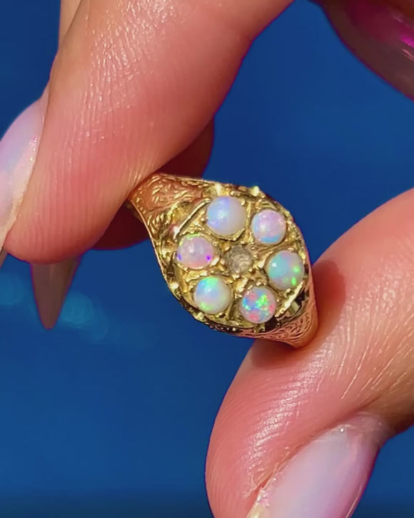 Antique Engraved 18ct Gold Opal Diamond 'Star' Cluster Ring