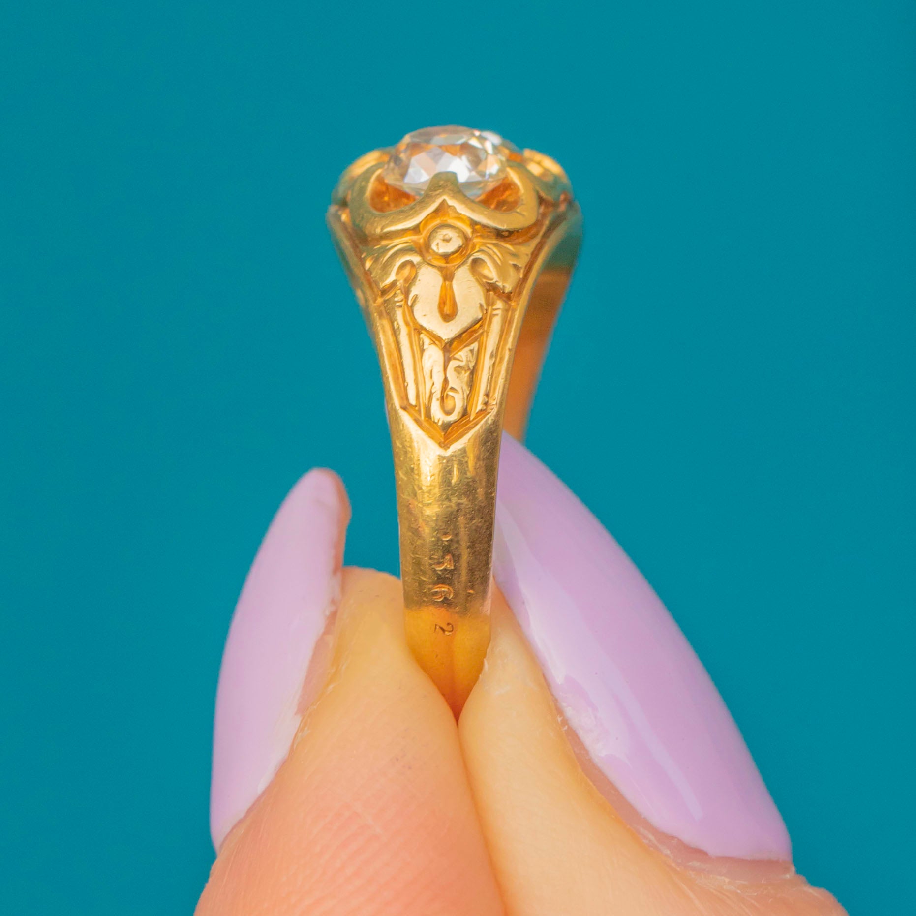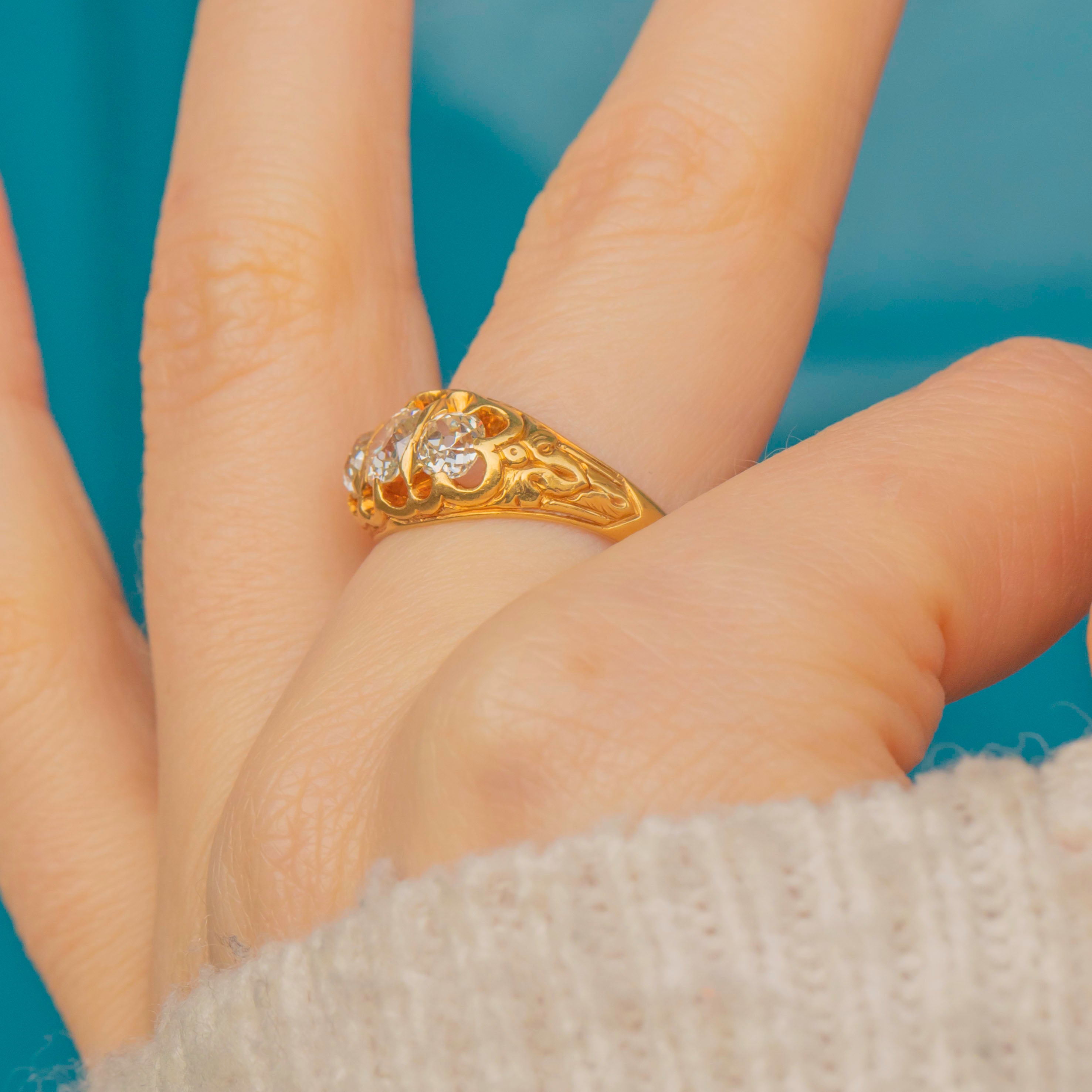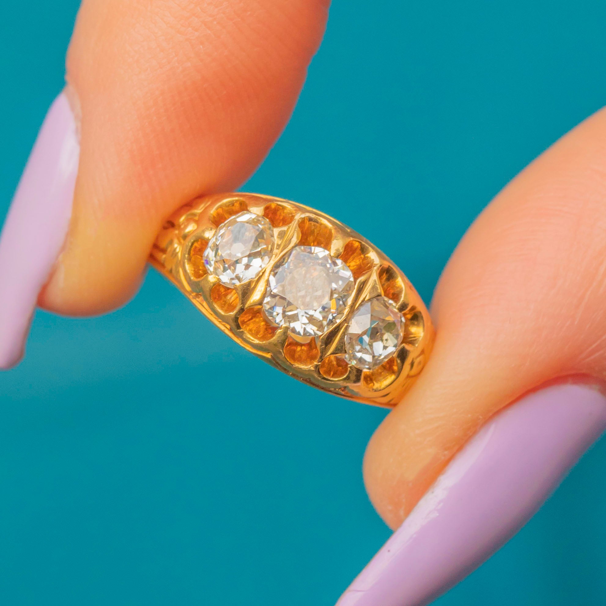 Antique French 18ct Gold Old Mine Cut Diamond Trilogy Ring 1.00ct, Carved shoulders Item added