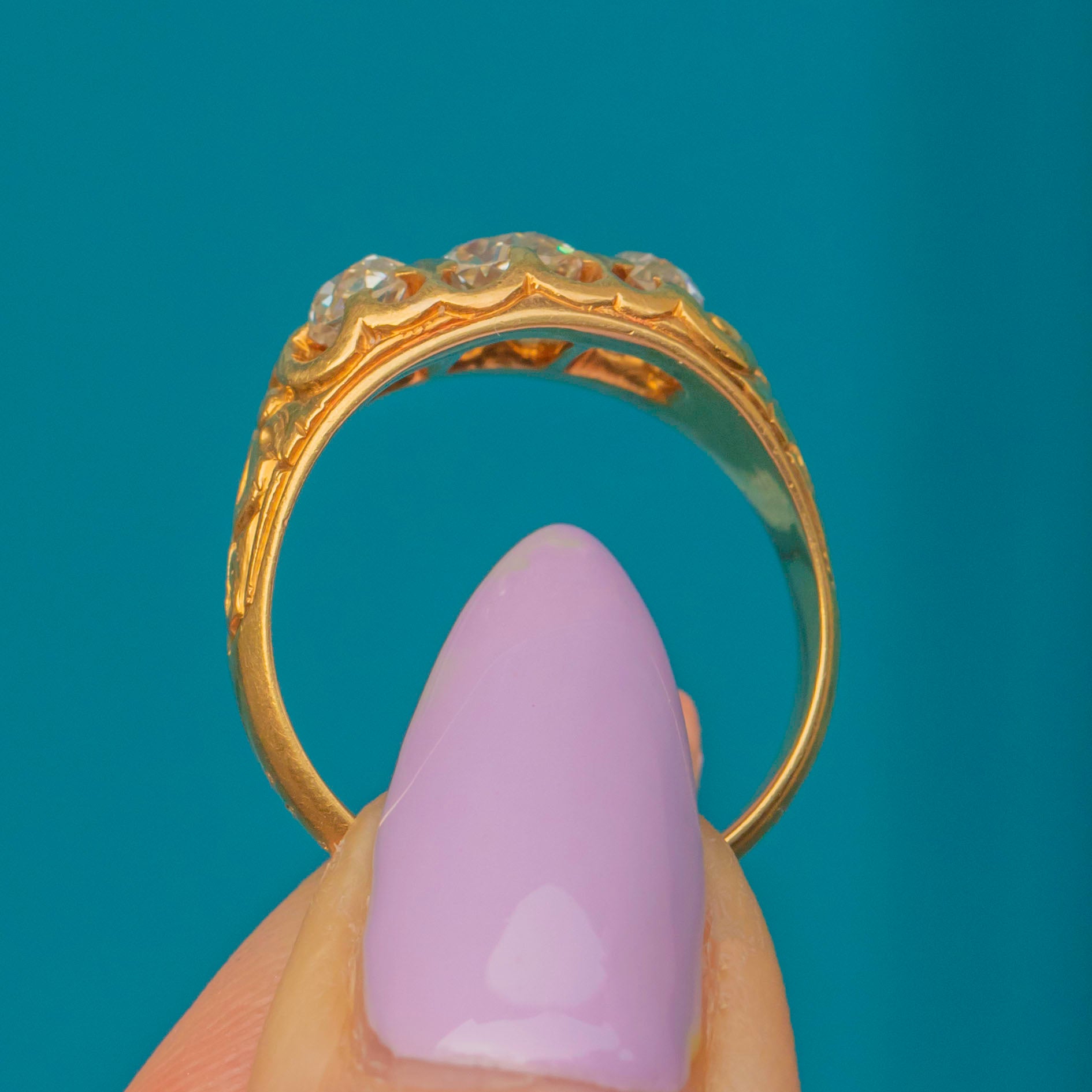 Antique French 18ct Gold Old Mine Cut Diamond Trilogy Ring 1.00ct, Carved shoulders