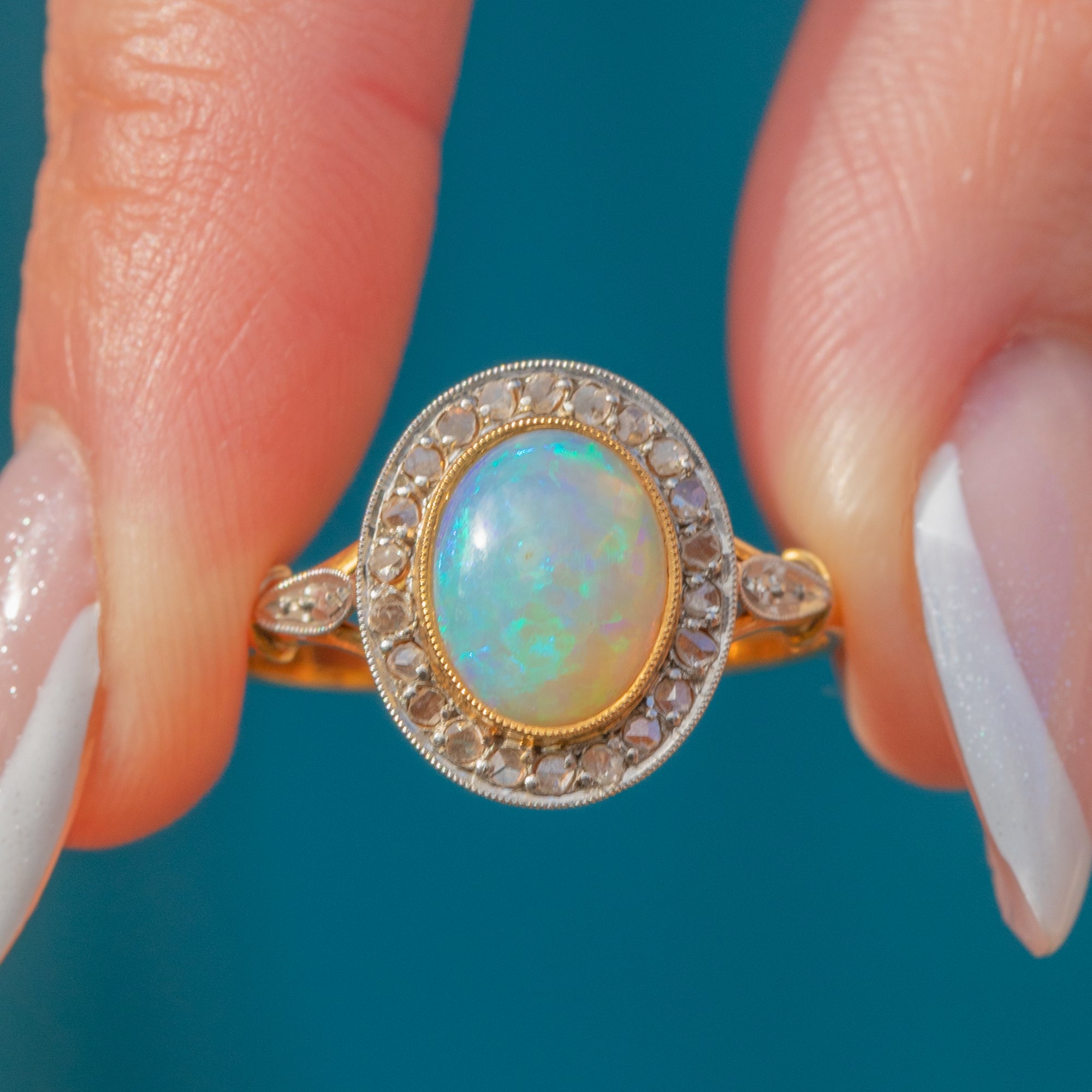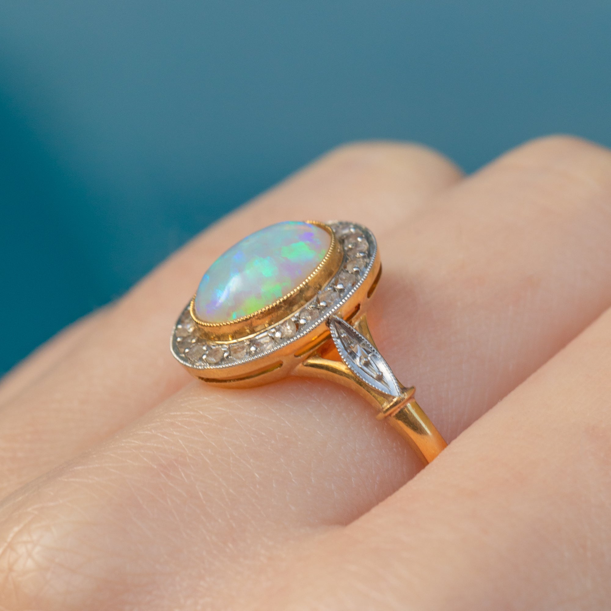 Antique French 18ct Gold Opal Diamond Cluster Ring, 0.80ct Opal