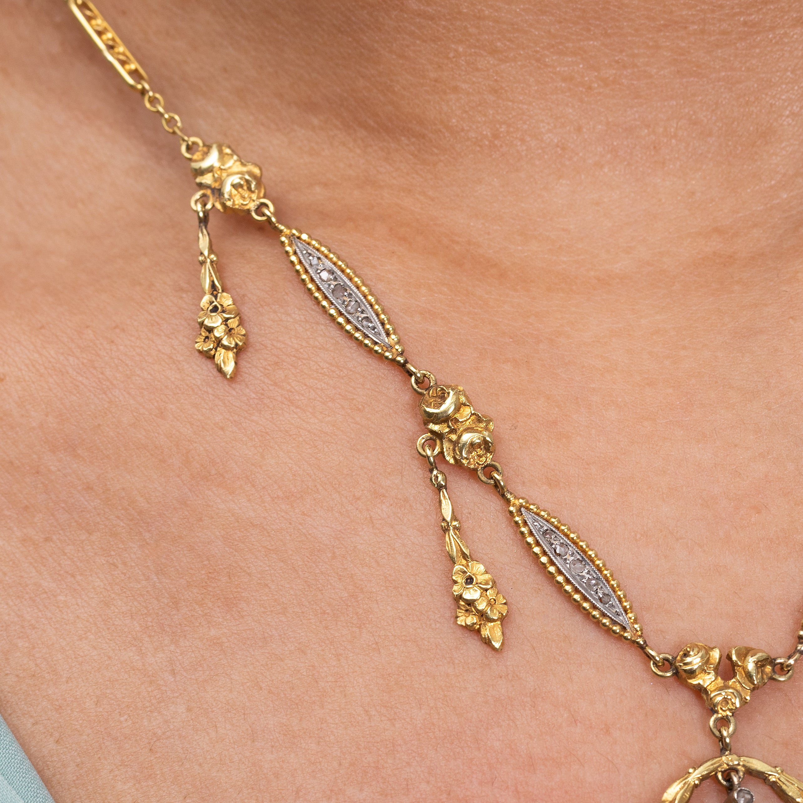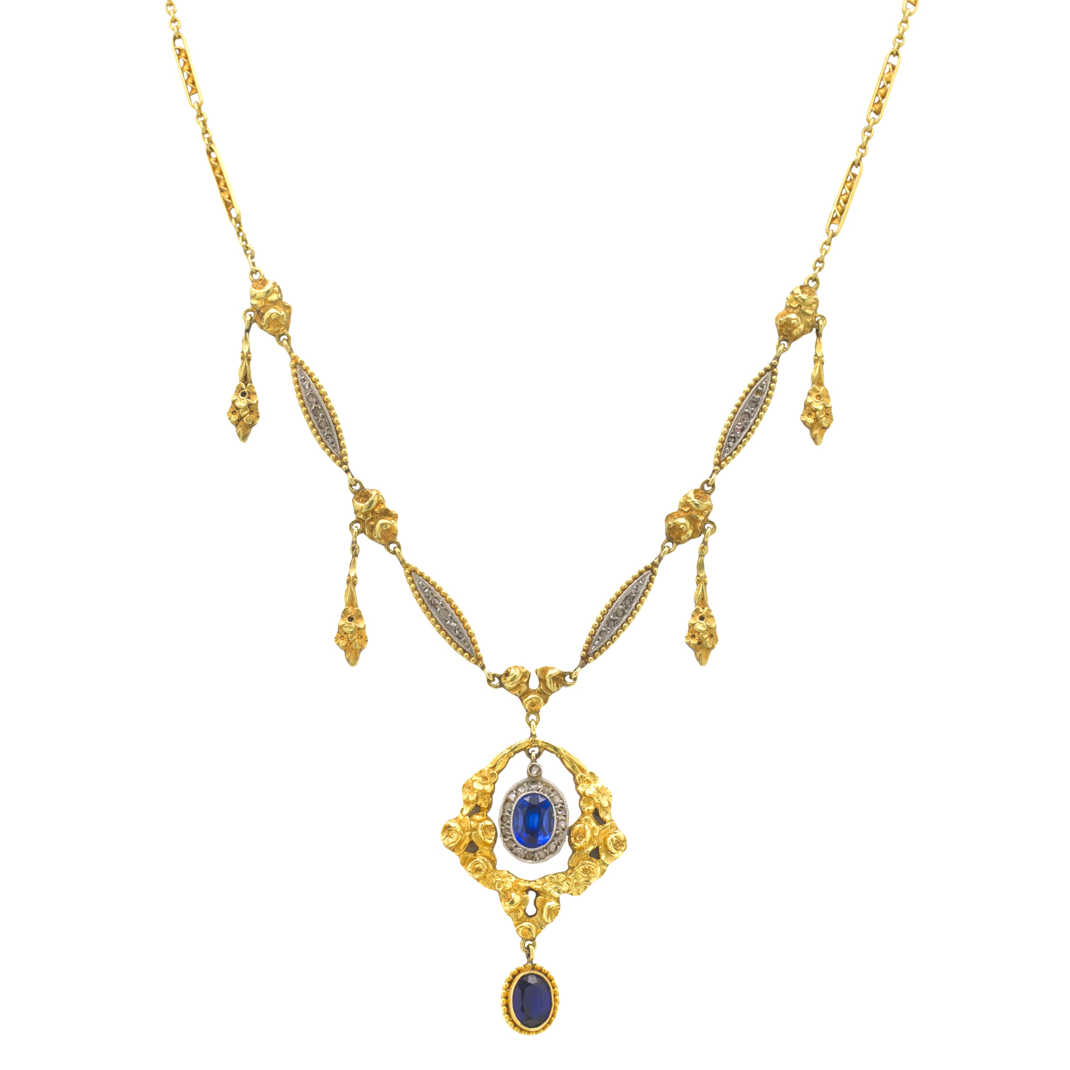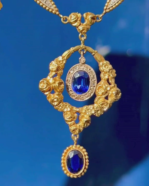 Antique French 18ct Gold Sapphire Diamond "Roses" Fringe Necklace