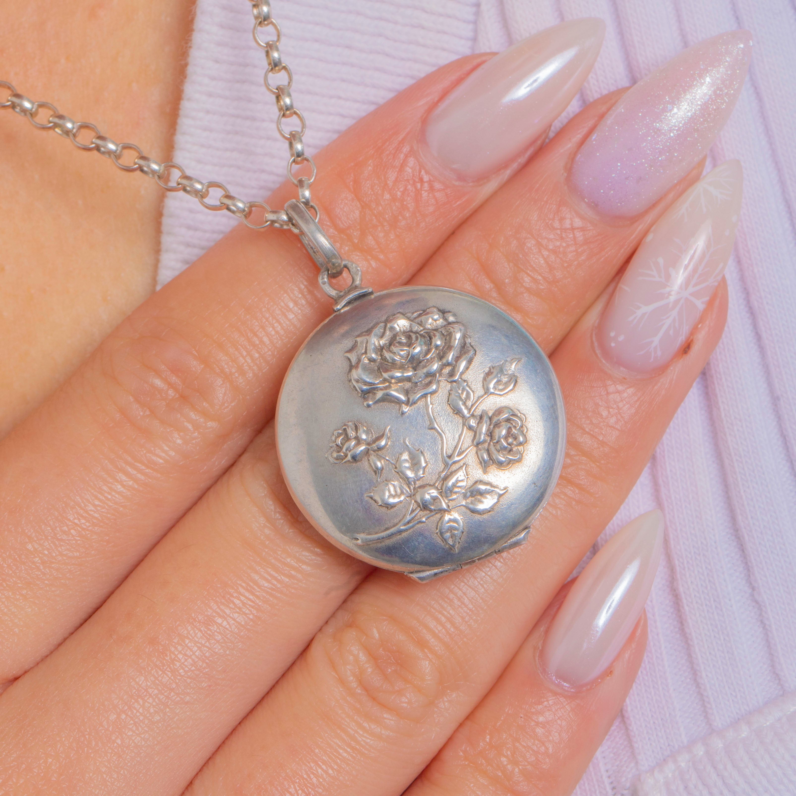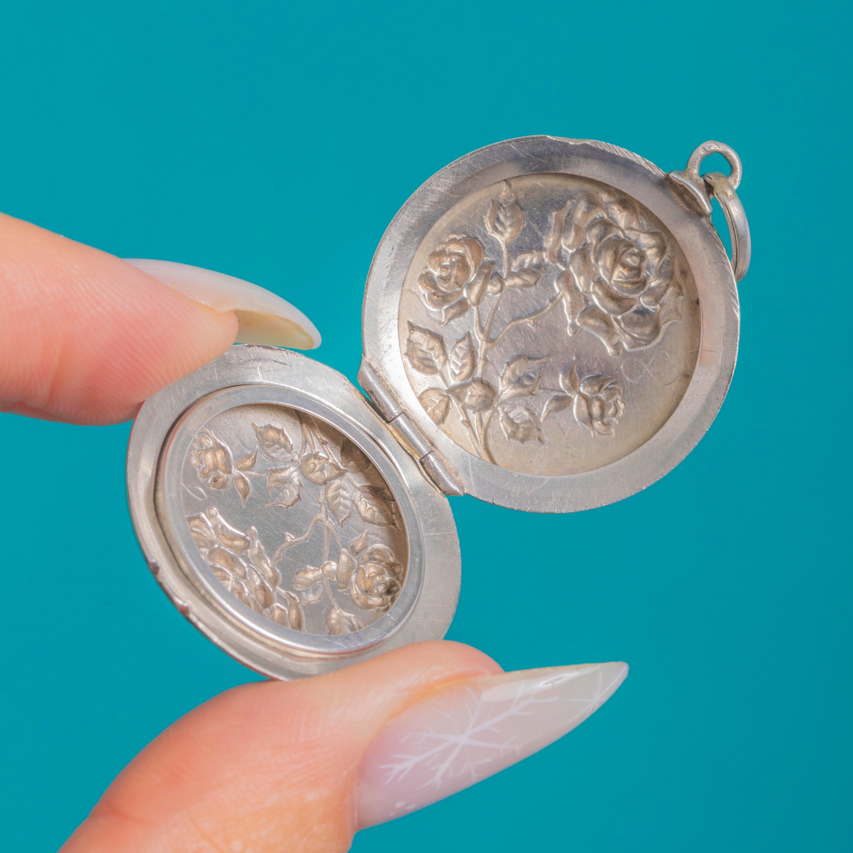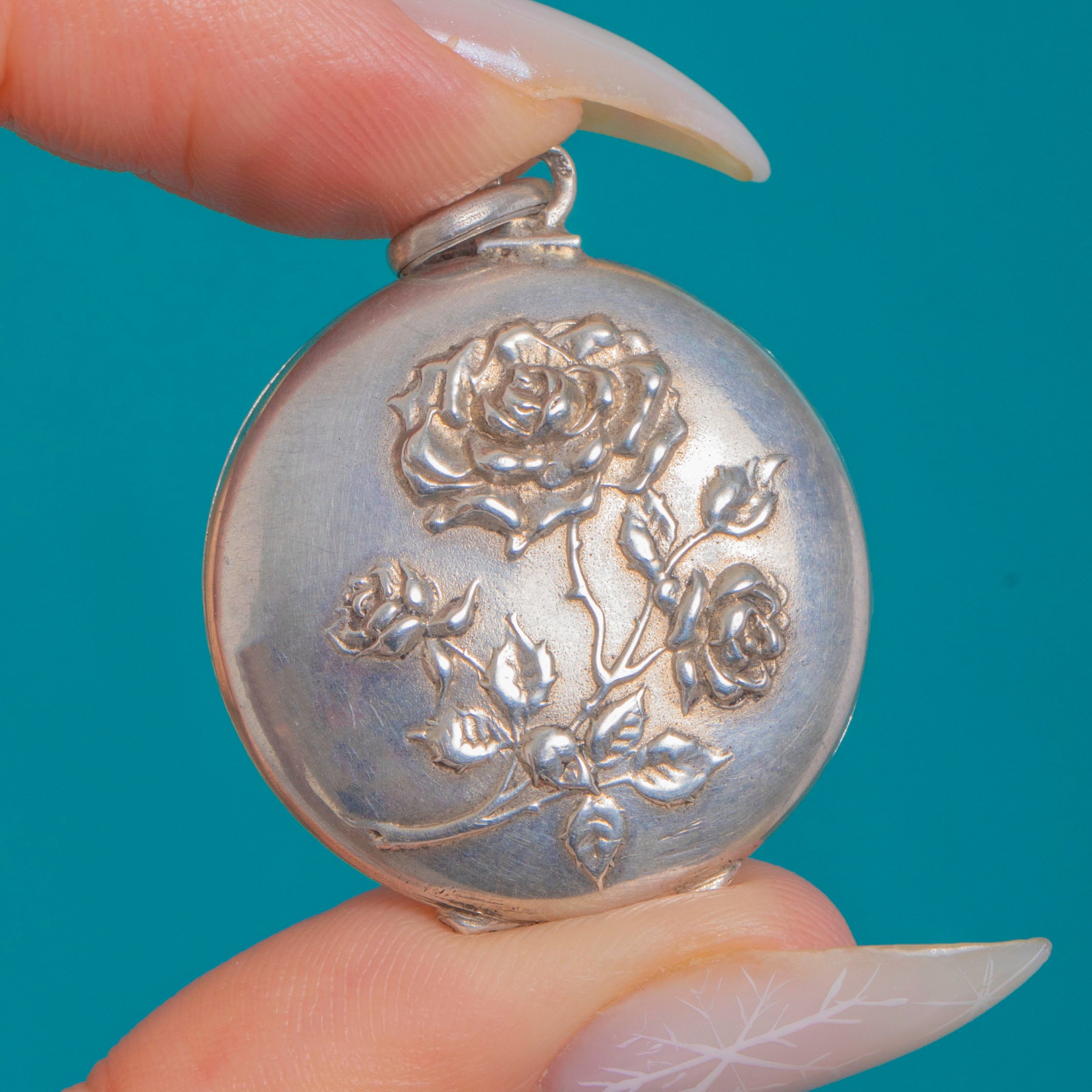 Blooming with romance, this antique French Silver locket is a timeless keepsake. The softly domed round face is adorned with a raised spray of three roses and tender leaves, the sculpted repoussé relief catching the light beautifully while a gentle patina nestles in the recesses to enhance every curve and contour.
