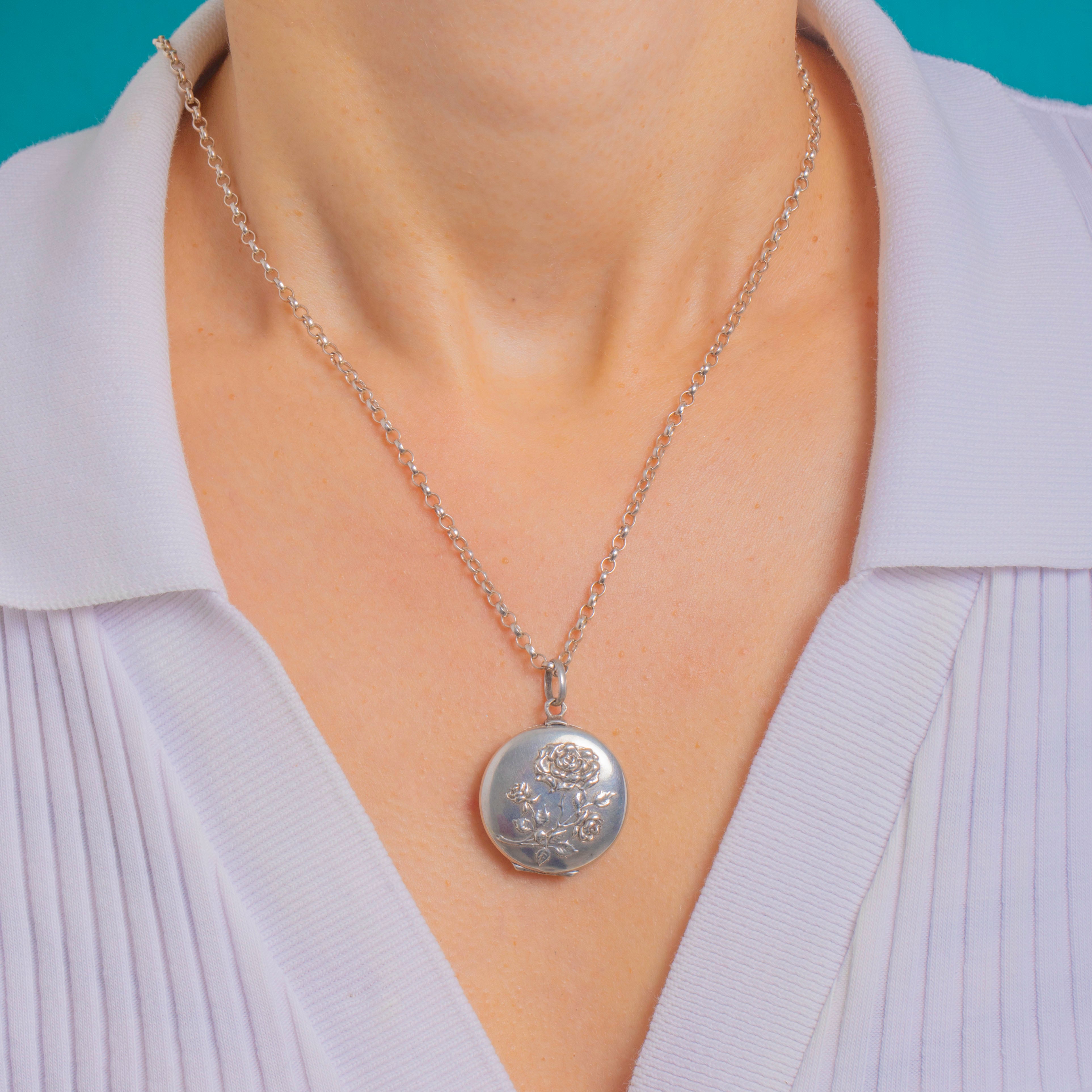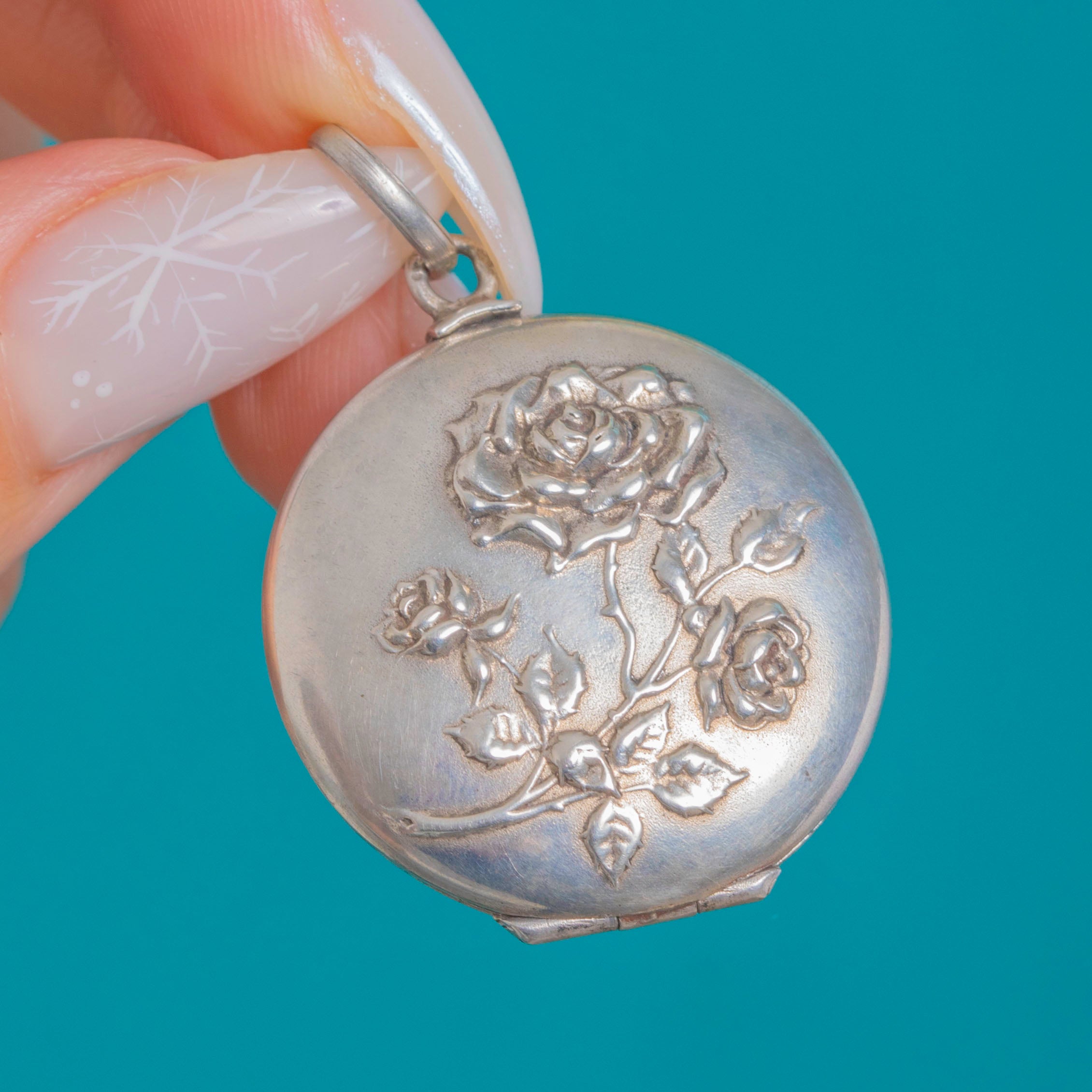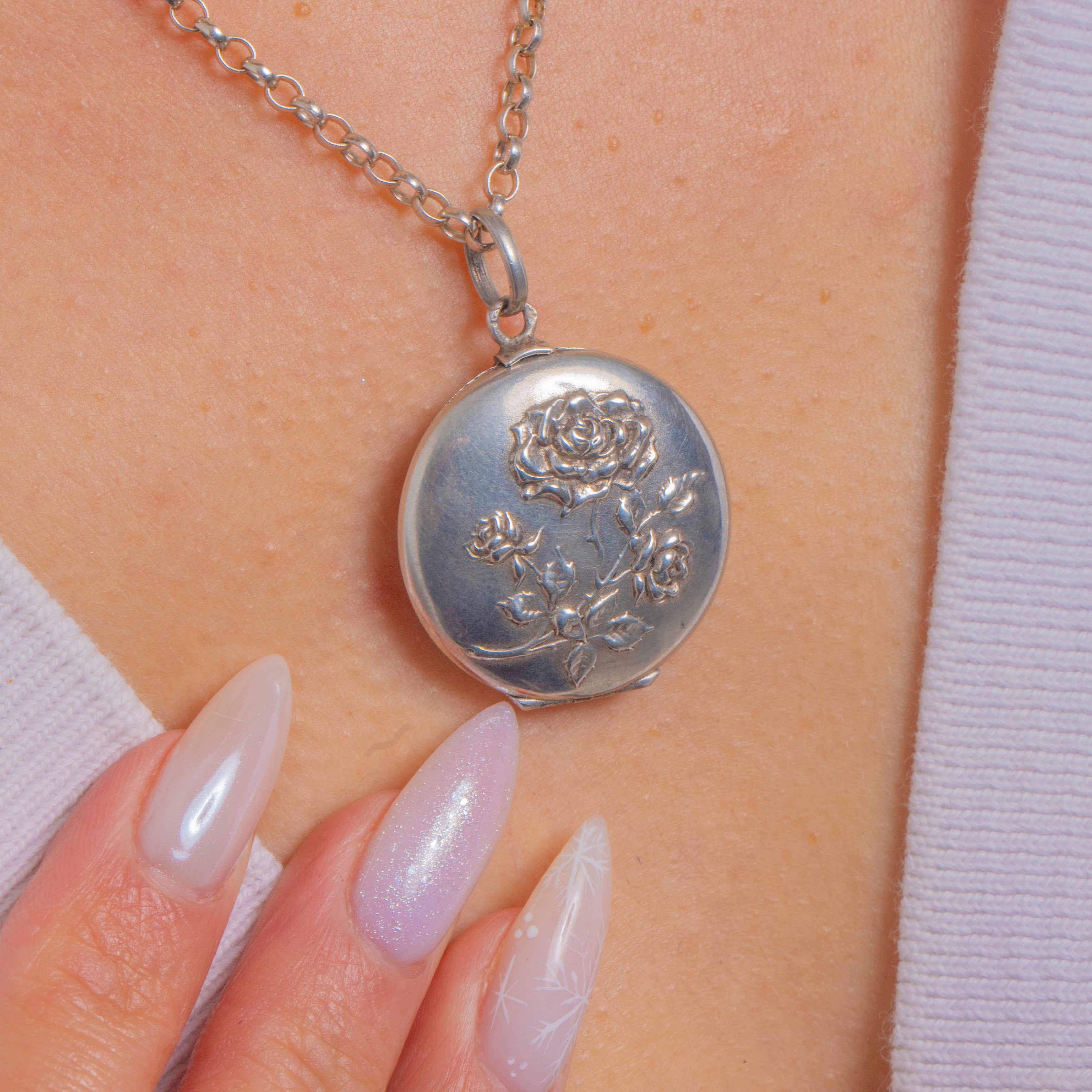Blooming with romance, this antique French Silver locket is a timeless keepsake. The softly domed round face is adorned with a raised spray of three roses and tender leaves, the sculpted repoussé relief catching the light beautifully while a gentle patina nestles in the recesses to enhance every curve and contour.