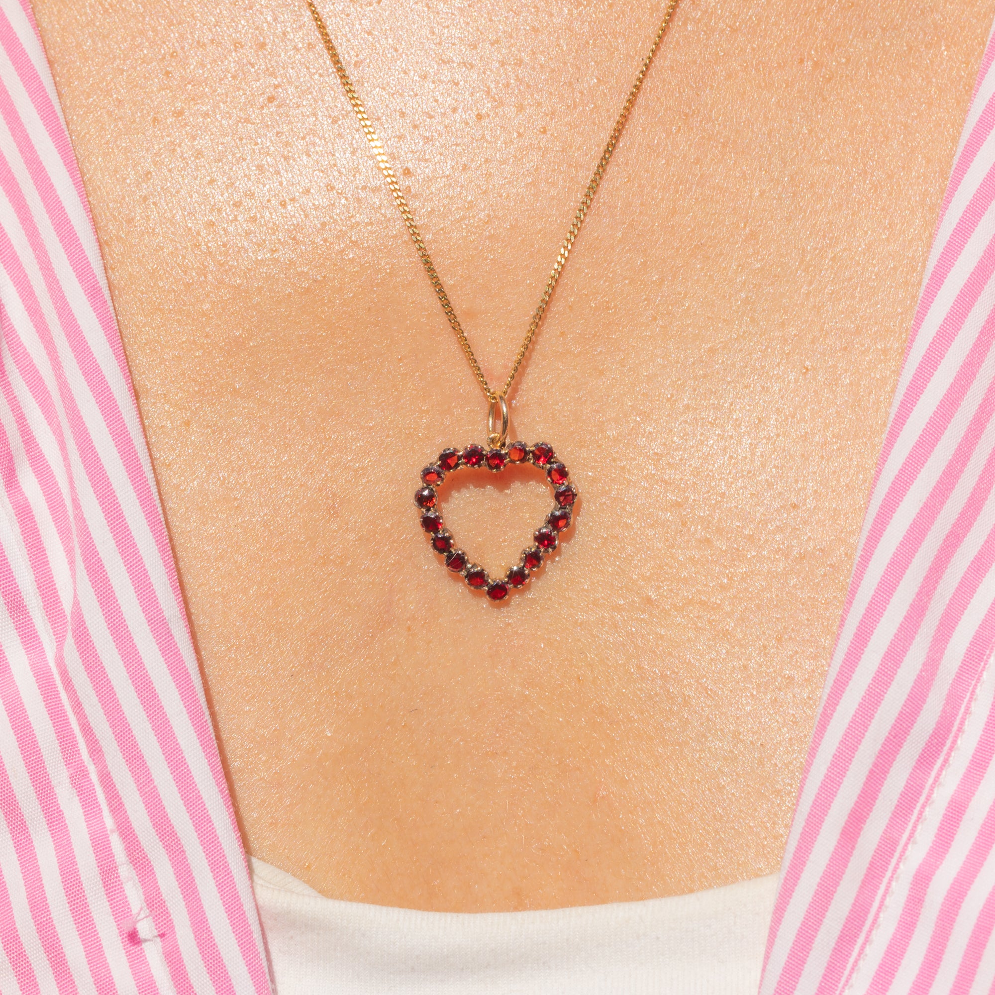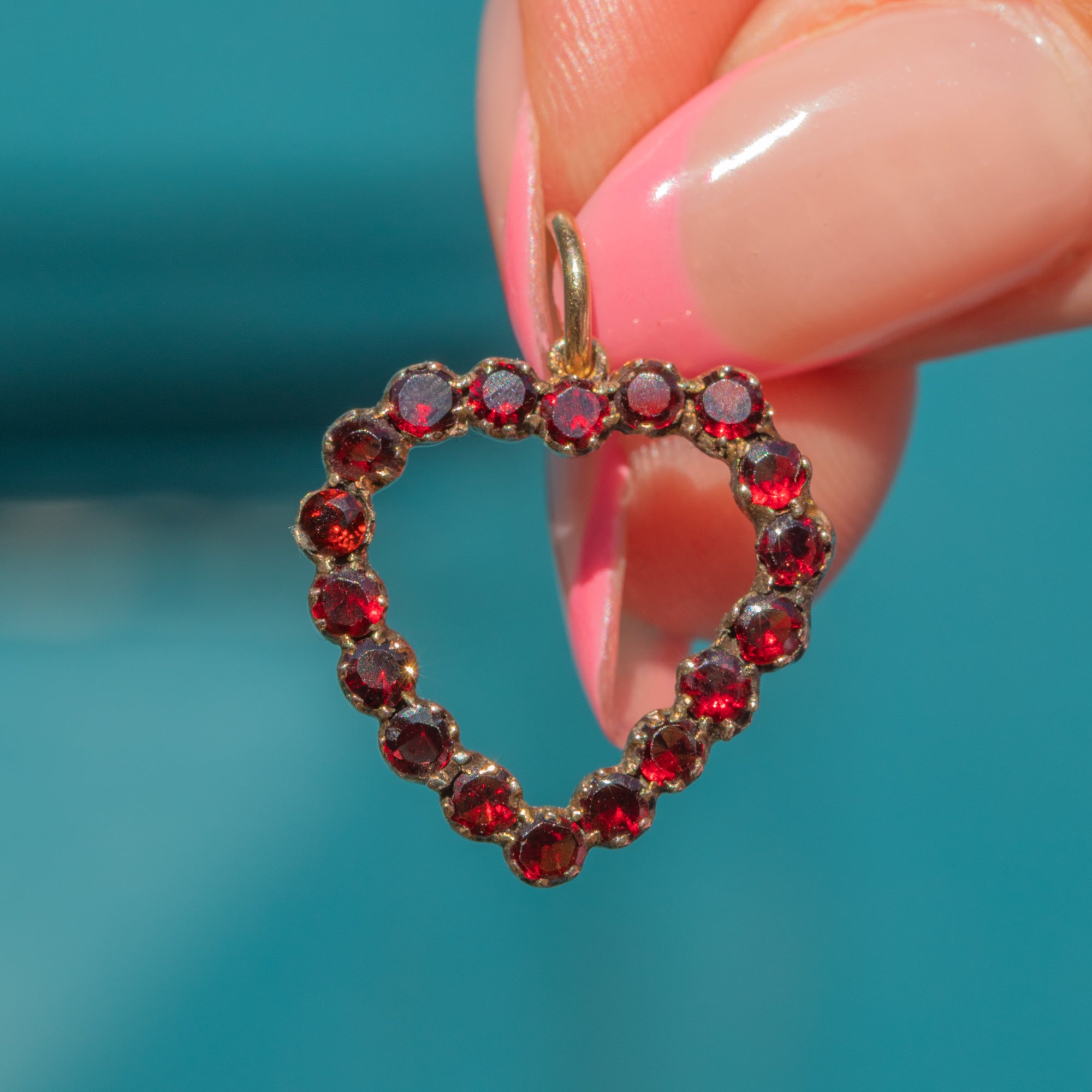 VERY GOOD-EXCELLENT: This antique Garnet heart pendant is in superb condition. The Garnets are radiant and secure within their settings. The Gold casing is glossy, with minor spots of discolouration to the back of the pendant, which cannot be seen while the pendant is worn. With a securely soldered jump ring, this Victorian heart pendant can be worn with utmost confidence!