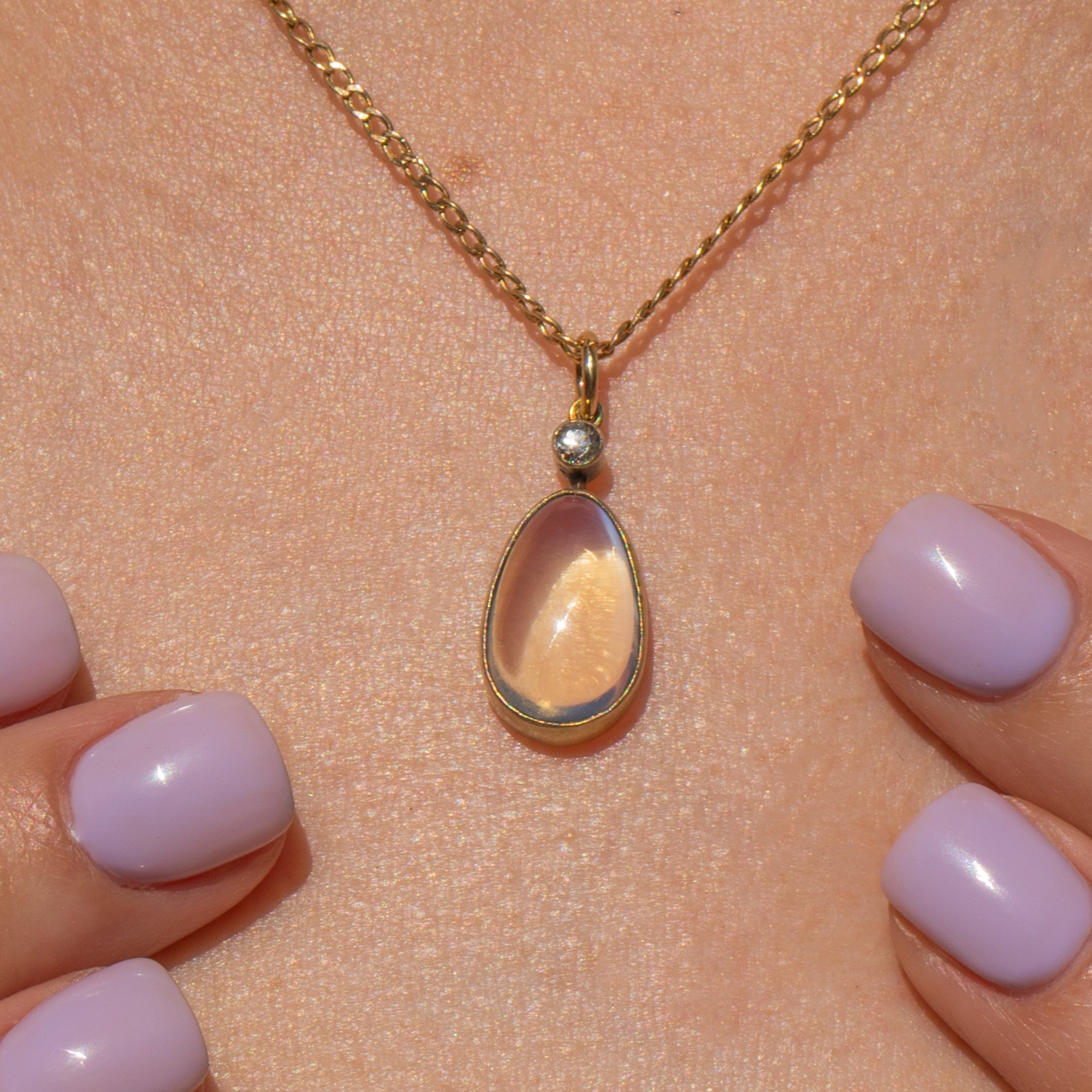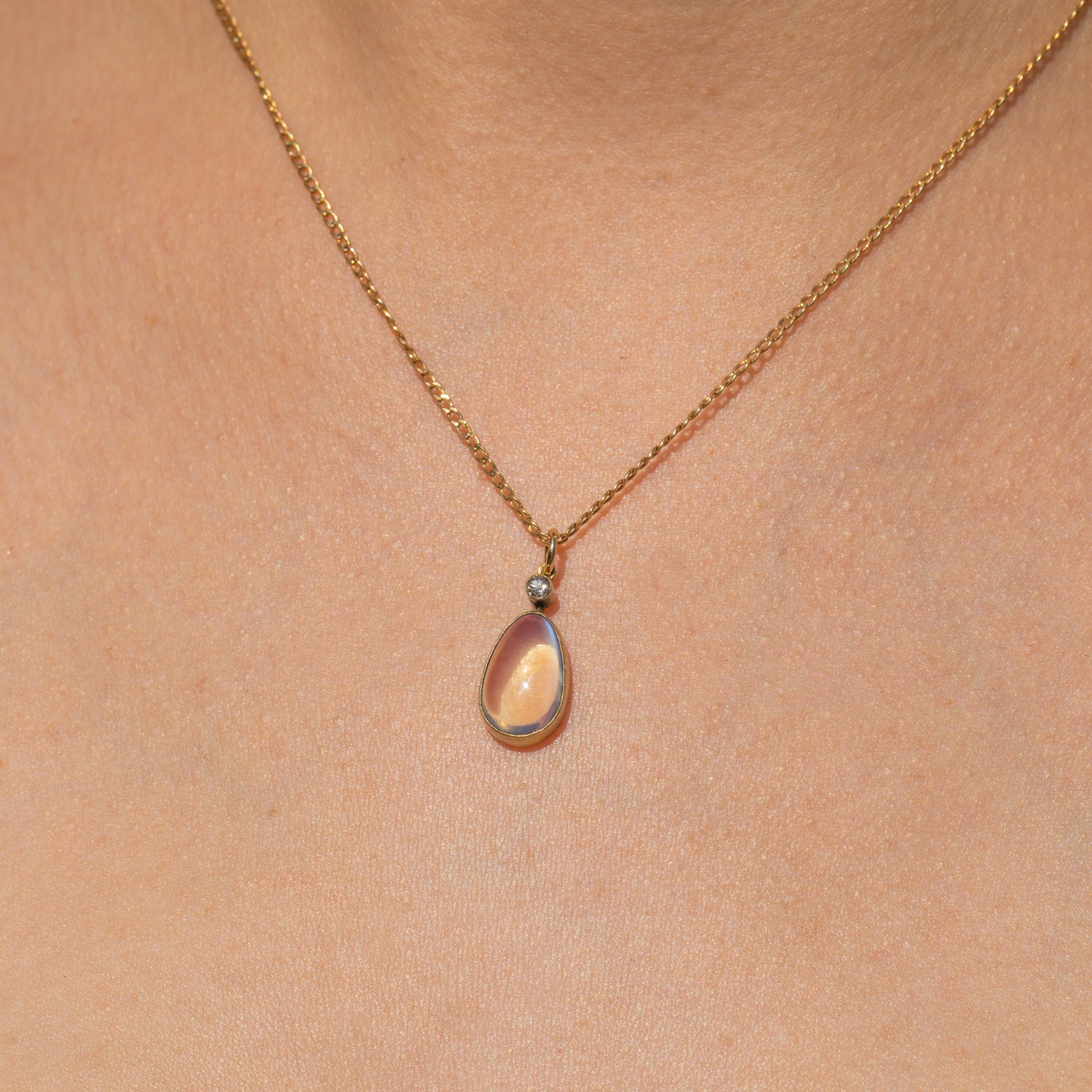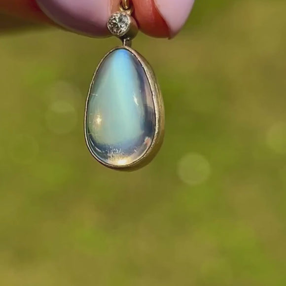 Soak up the ethereal beauty of this antique Moonstone Diamond drop pendant. Studded on top with a Diamond, her vivid sparkle creates a striking contrast against the blue schiller that billows across her smooth 2.90ct Moonstone cabochon.