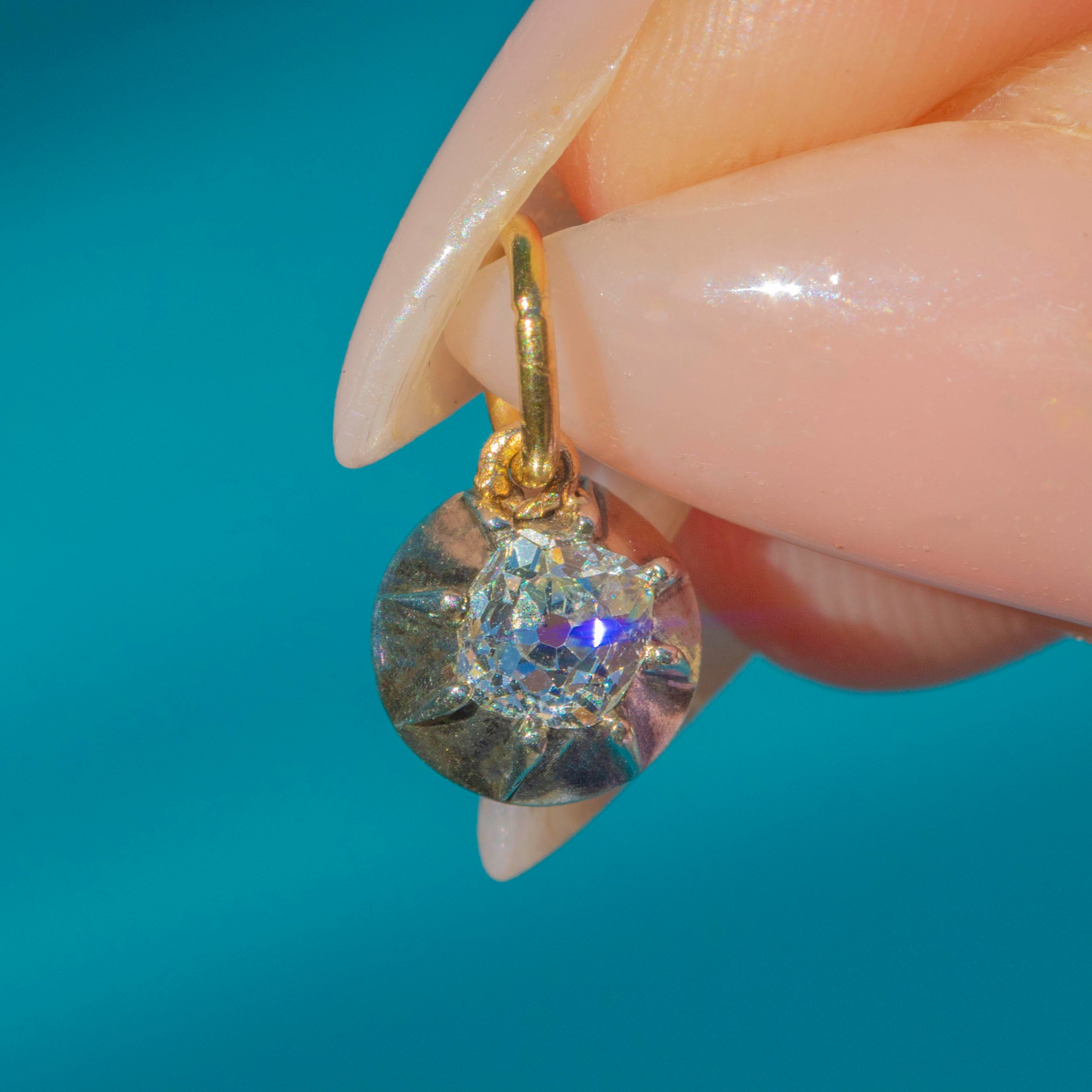 EXCELLENT: The Old Mine Cut Diamond is secure, lively, and free from chips or abrasions. The Silver collet and 18ct Gold backing are in superb condition with minimal wear, and the Gold jump ring is sturdy. A fine example of a petite Victorian Diamond jewel.