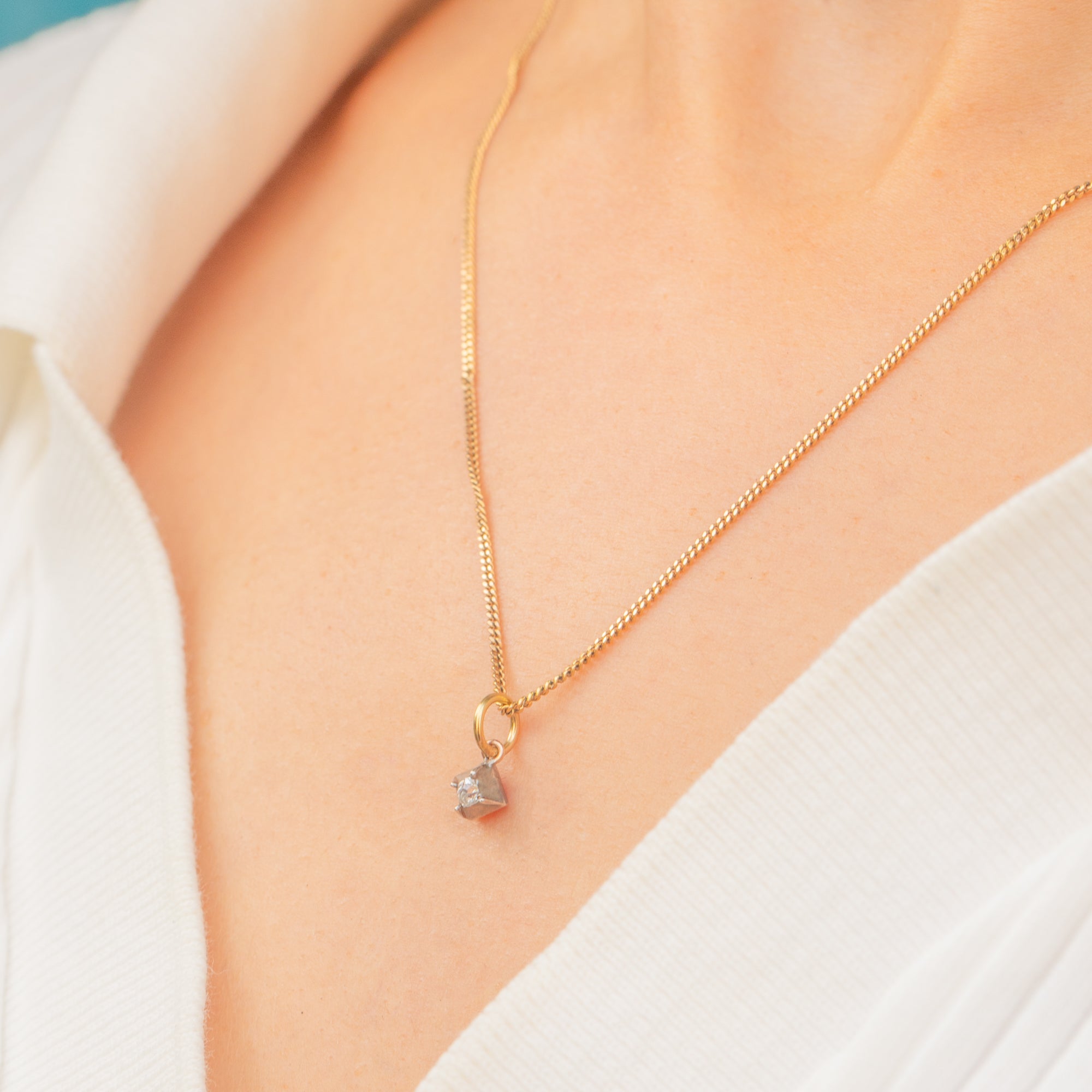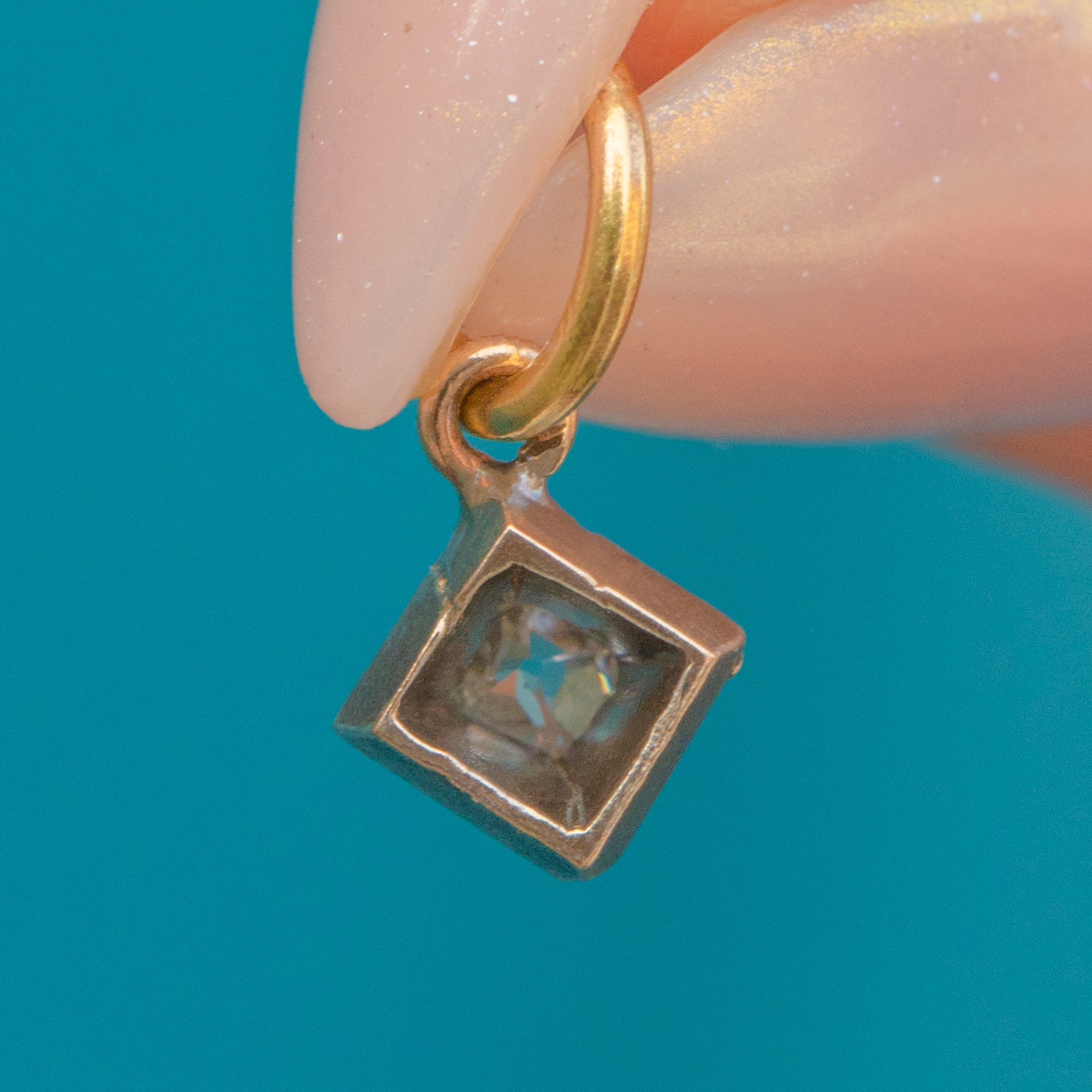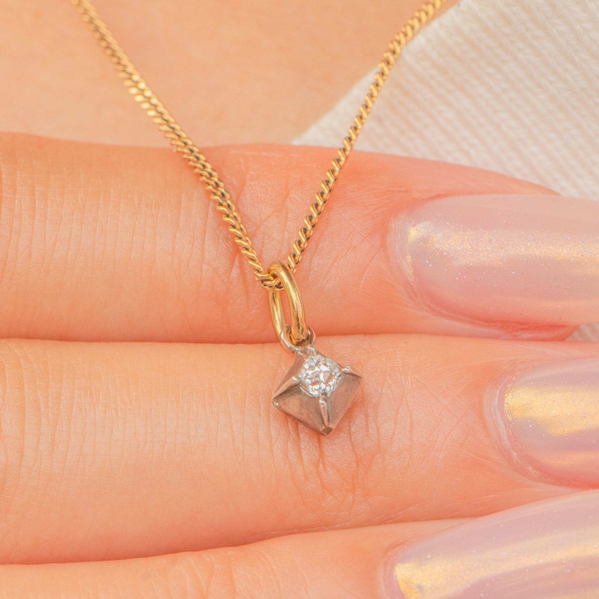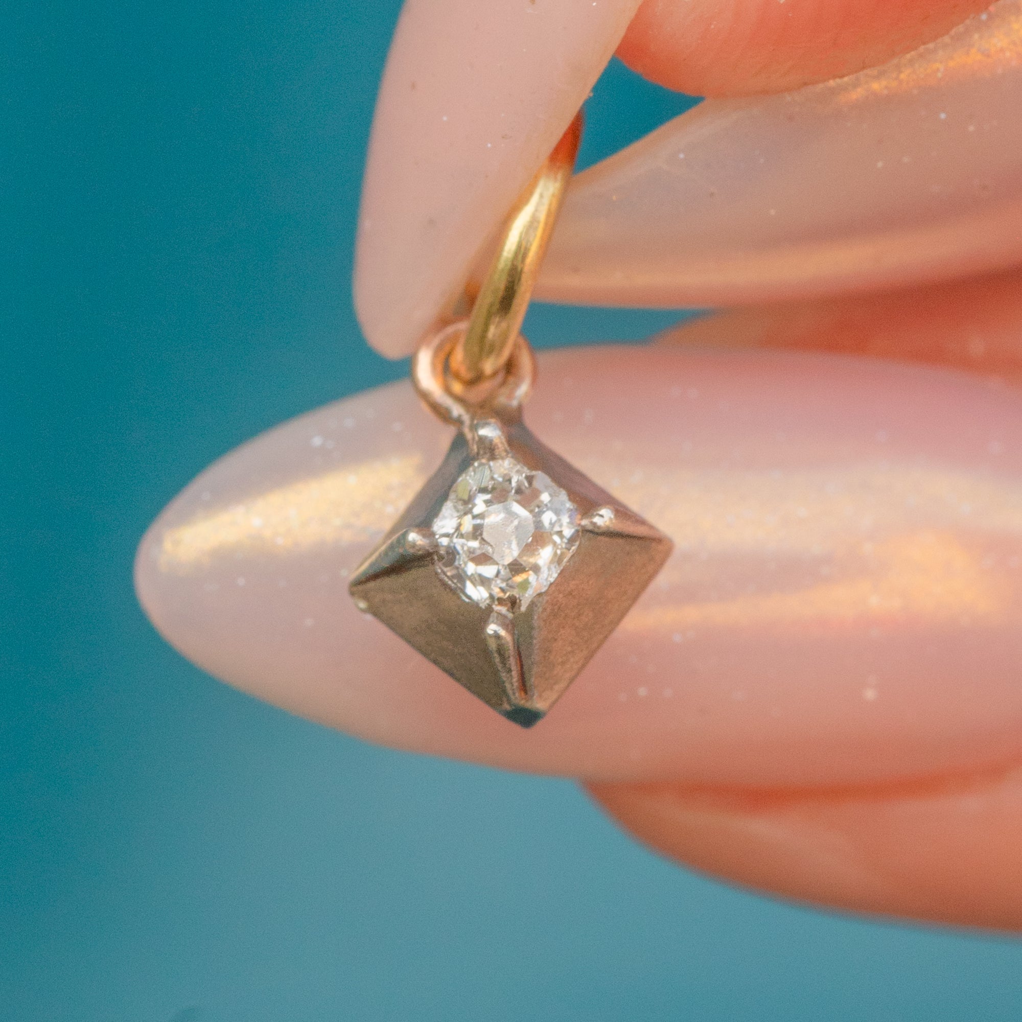 This antique Diamond charm is a tiny treasure, showcasing a single Old Mine Cut Diamond set into a distinctive pyramid-style Silver & 18ct Gold mount. The Diamond measures approx. 3mm in diameter and weighs around 0.12ct, with the chunky facets and high crown typical of this historic cut. It sparkles beautifully, full of antique character and charm.