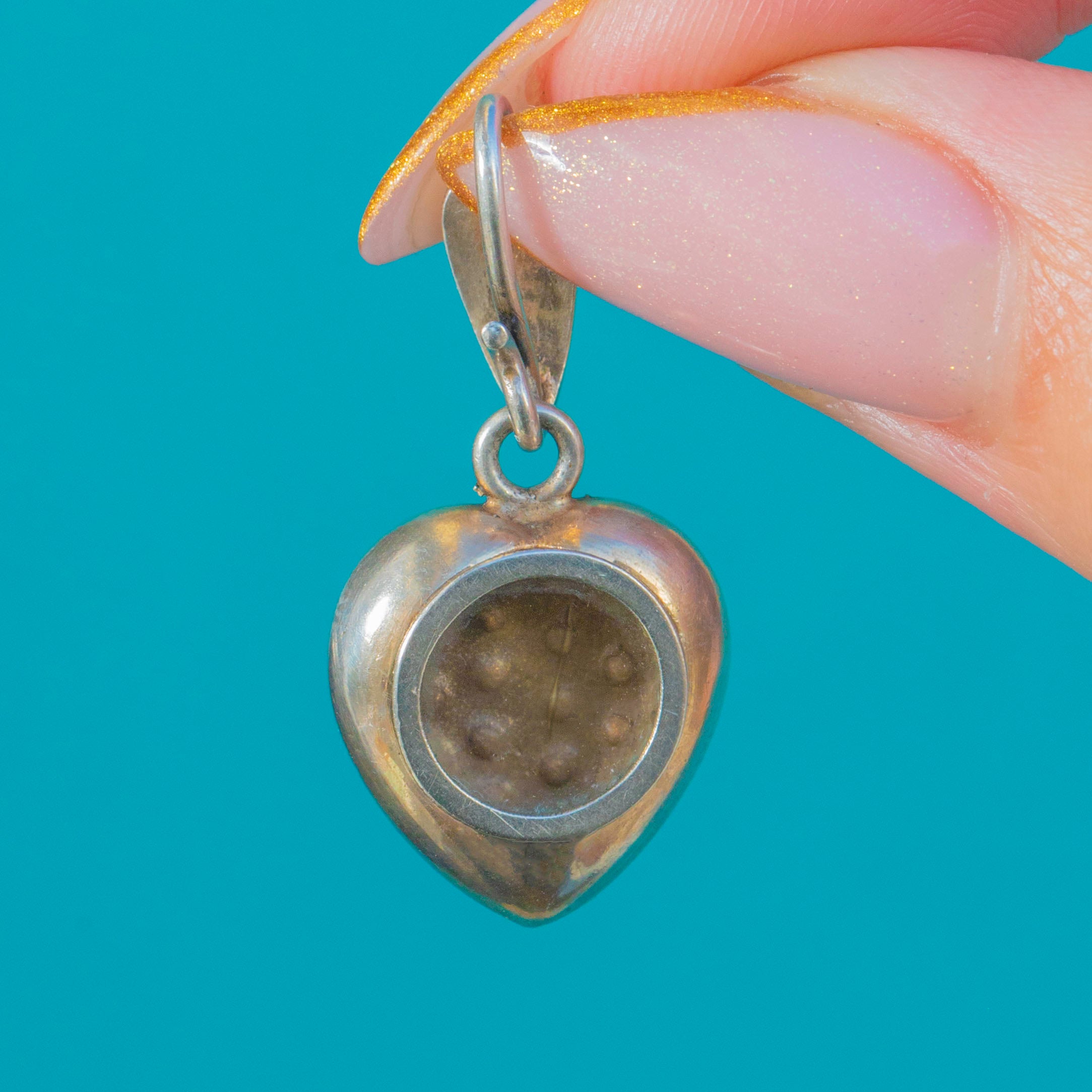 This vibrant Victorian heart charm is a true sweetheart jewel, brimming with character and colour. The front is fully pavé-set with Turquoise cabochons in a beautiful array of hues, from soft sky-blue to deep greenish teal. Their natural variation creates a lively, mosaic-like surface that feels both romantic and organic—exactly what collectors treasure in genuine antique Turquoise.