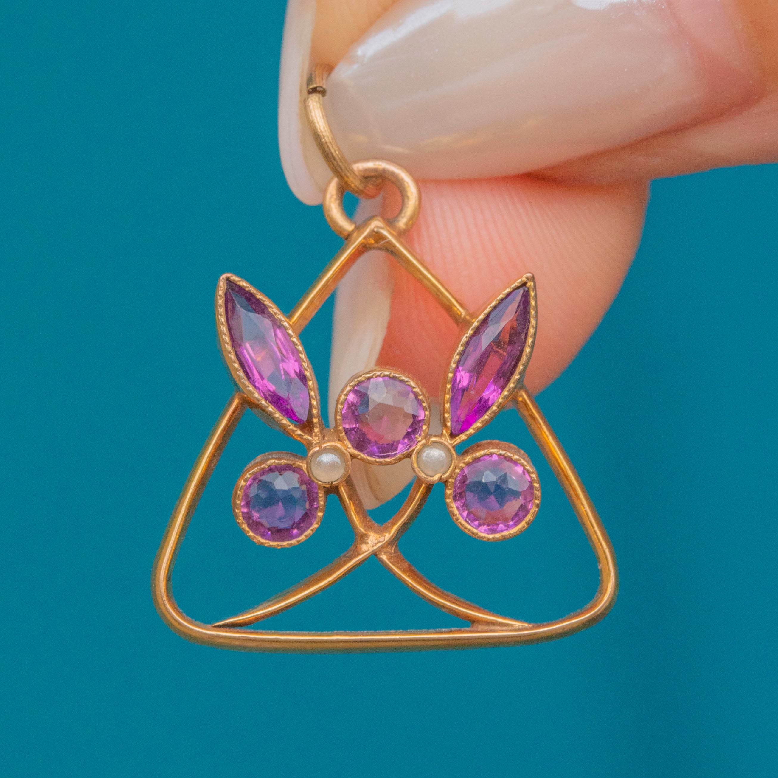 This Victorian pendant is a striking example of jewellery from the era! Gorgeous pink Paste and shimmering Seed Pearls are displayed within the curvaceous form of the pendant, giving it a floral and feminine appeal.
