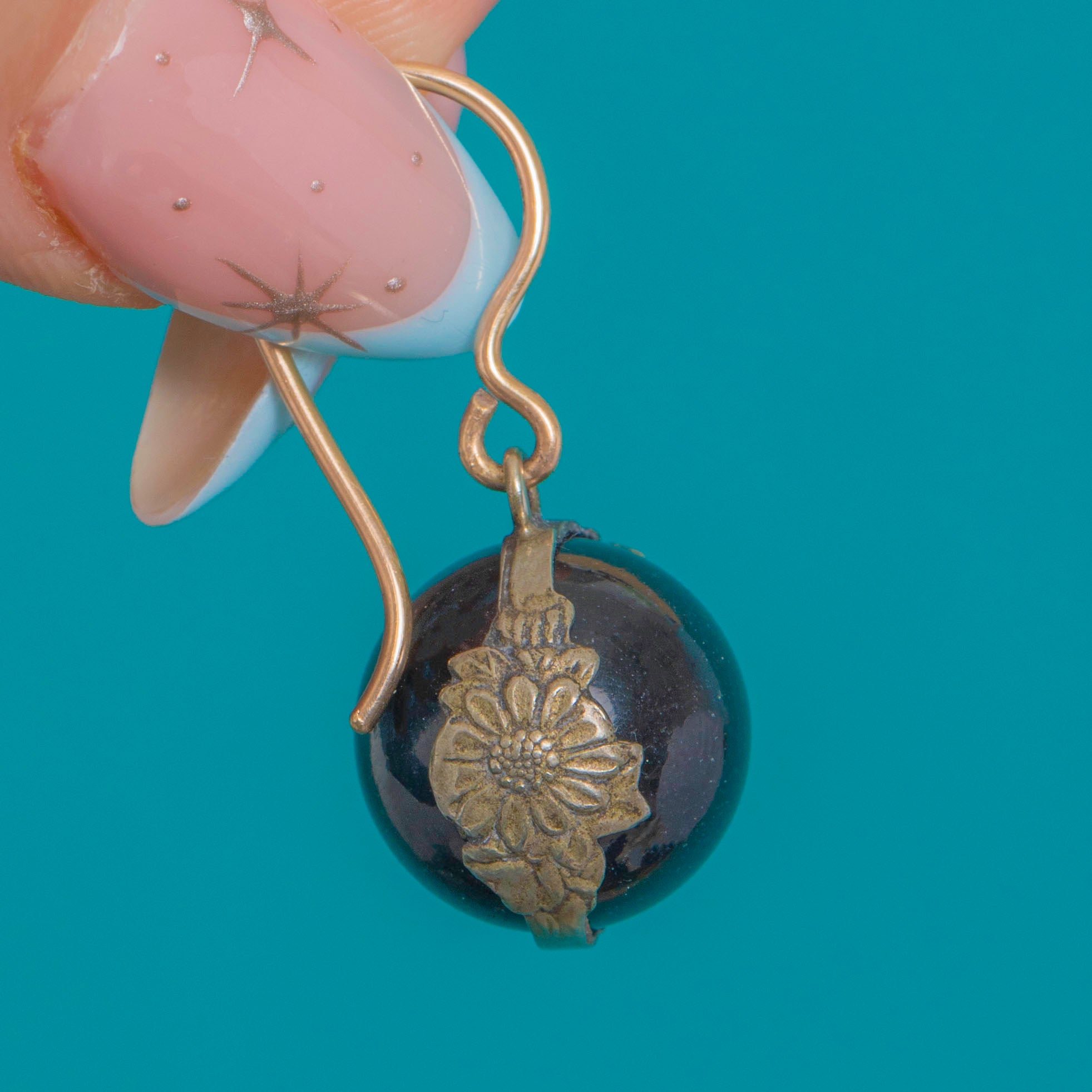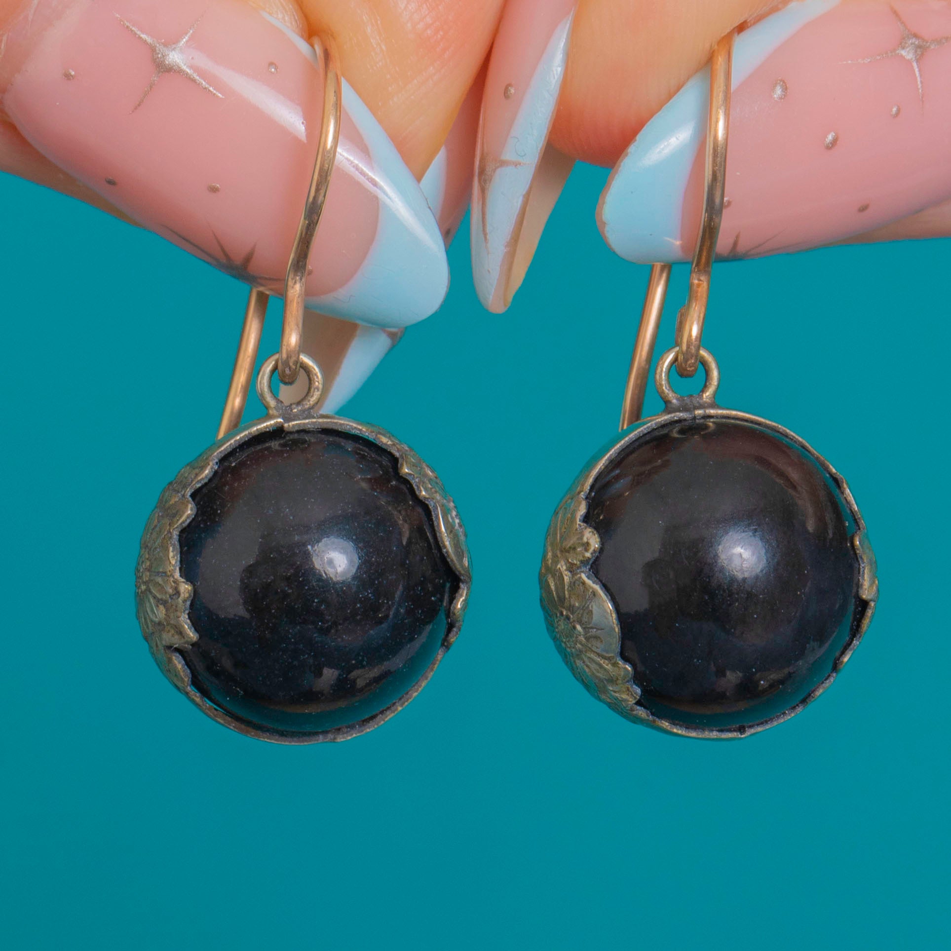 The high-polished, smooth domes glow with a deep inky sheen, while the petalled mounts add a romantic, botanical finish. Beautiful movement, timeless proportions, and a softly aged patina complete their antique charm—effortless from day to evening.