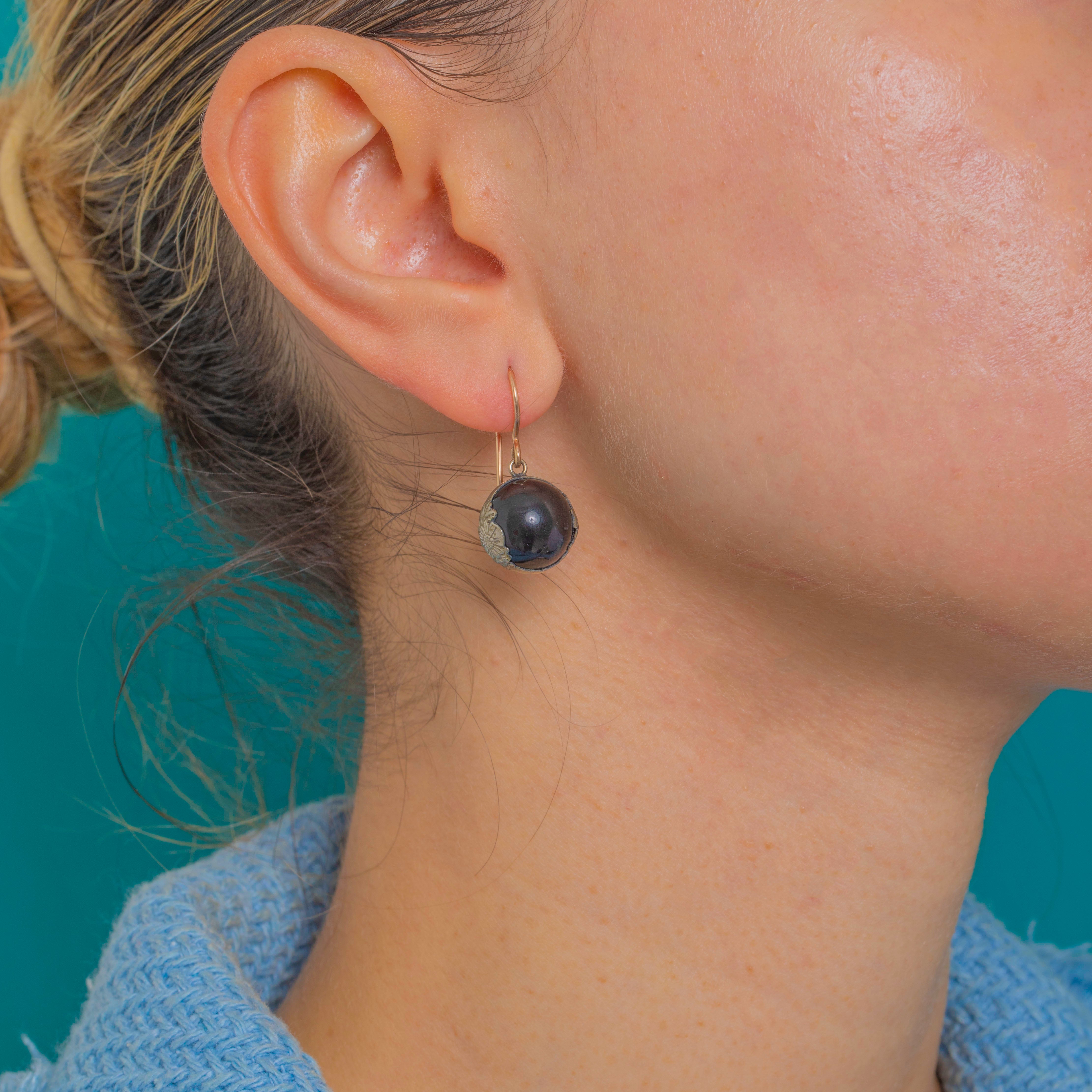 Sculptural and wonderfully moody, these Victorian drop earrings centre glossy Black Glass orbs beneath delicately foliate caps. The contrast of Silver floral detailing with warm 9ct Gold shepherd hooks creates an elegant two-tone palette that feels both refined and quietly dramatic.