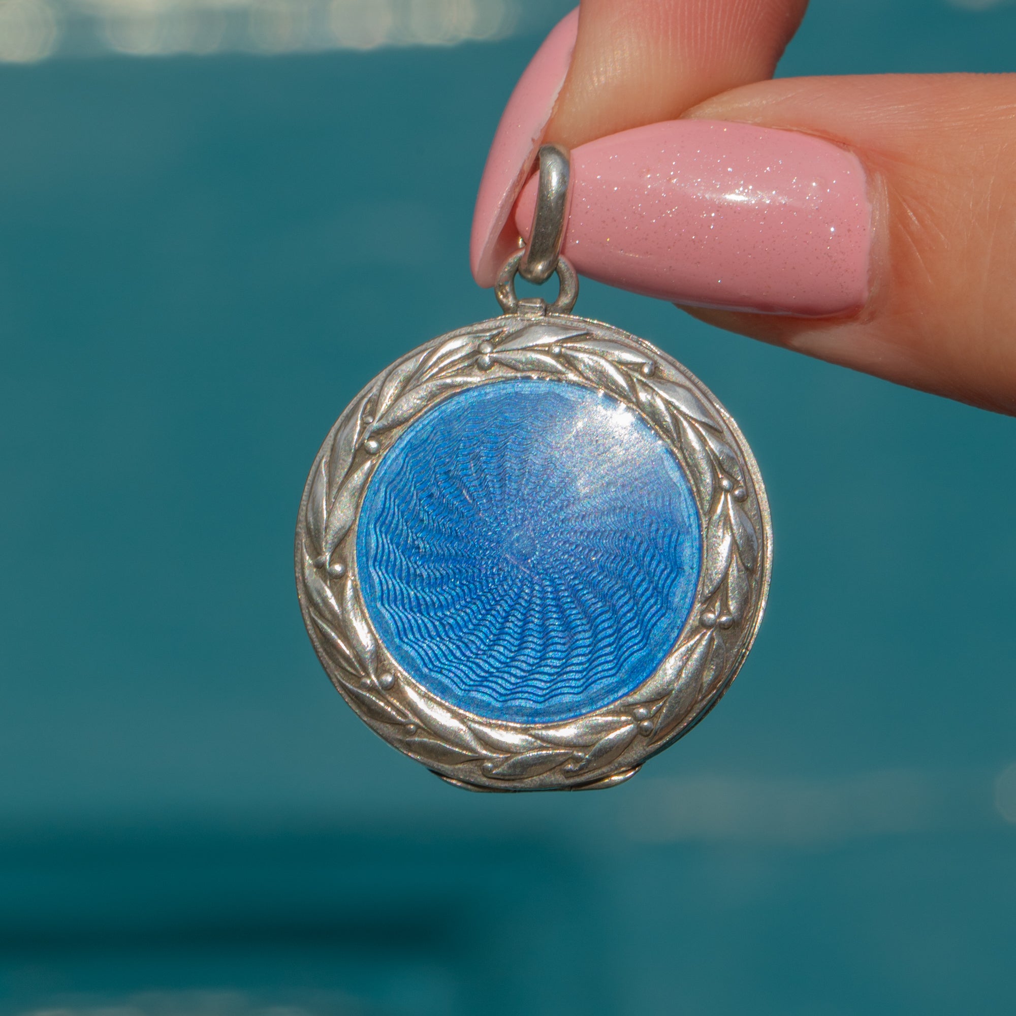 This exquisite Art Nouveau Silver cornflower blue Guilloché Enamel locket is nothing short of delightful! The radiant, soft blue Enamel is accented by delicate Guilloché detailing, which shimmers beneath the surface, giving the piece depth and grace with every turn.