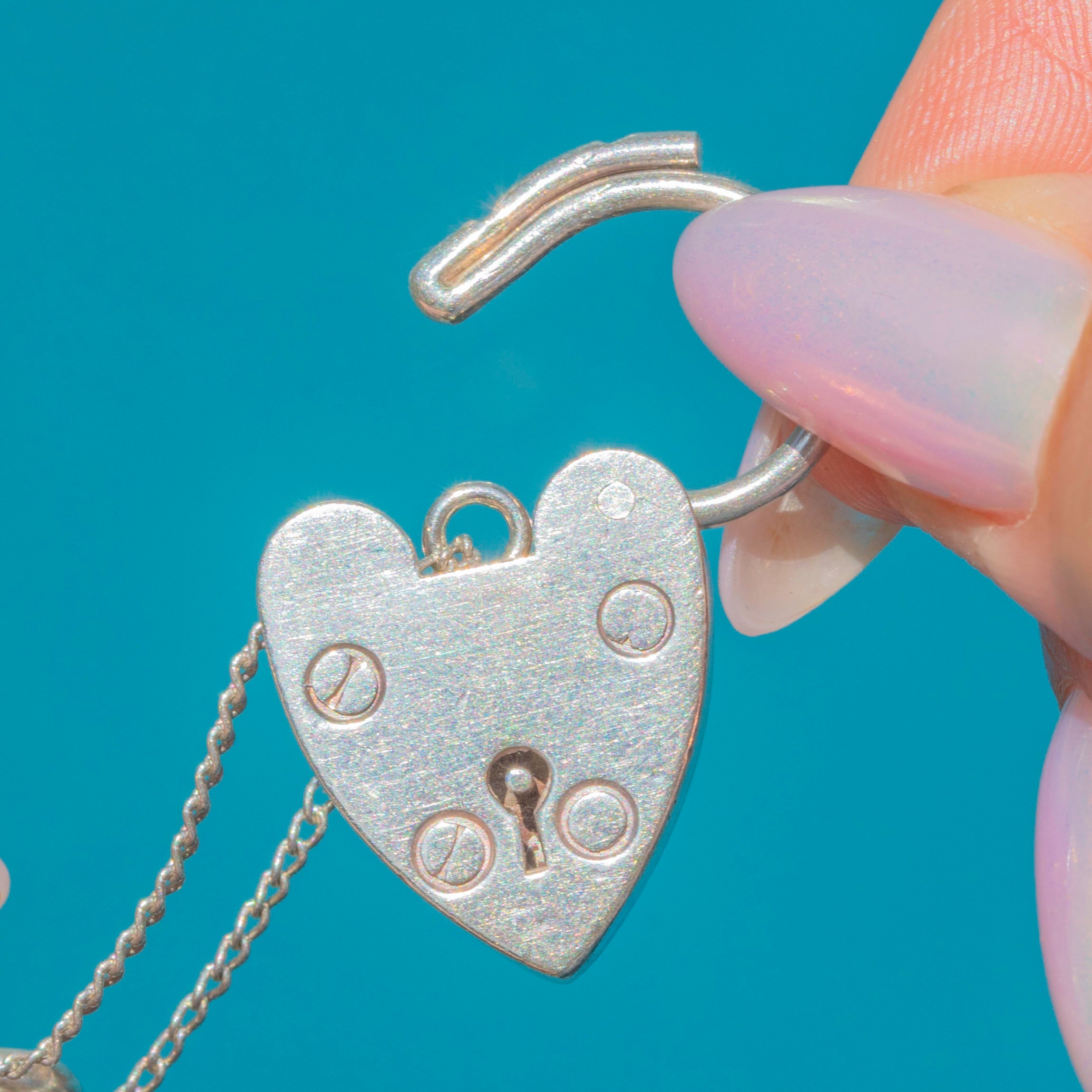 Formed of chunky, graduating curb links, this glossy Edwardian bracelet is a fabulously versatile and weighty piece. She suspends a large Silver heart padlock, symbolic of love and commitment, adding a lovely romantic charm.