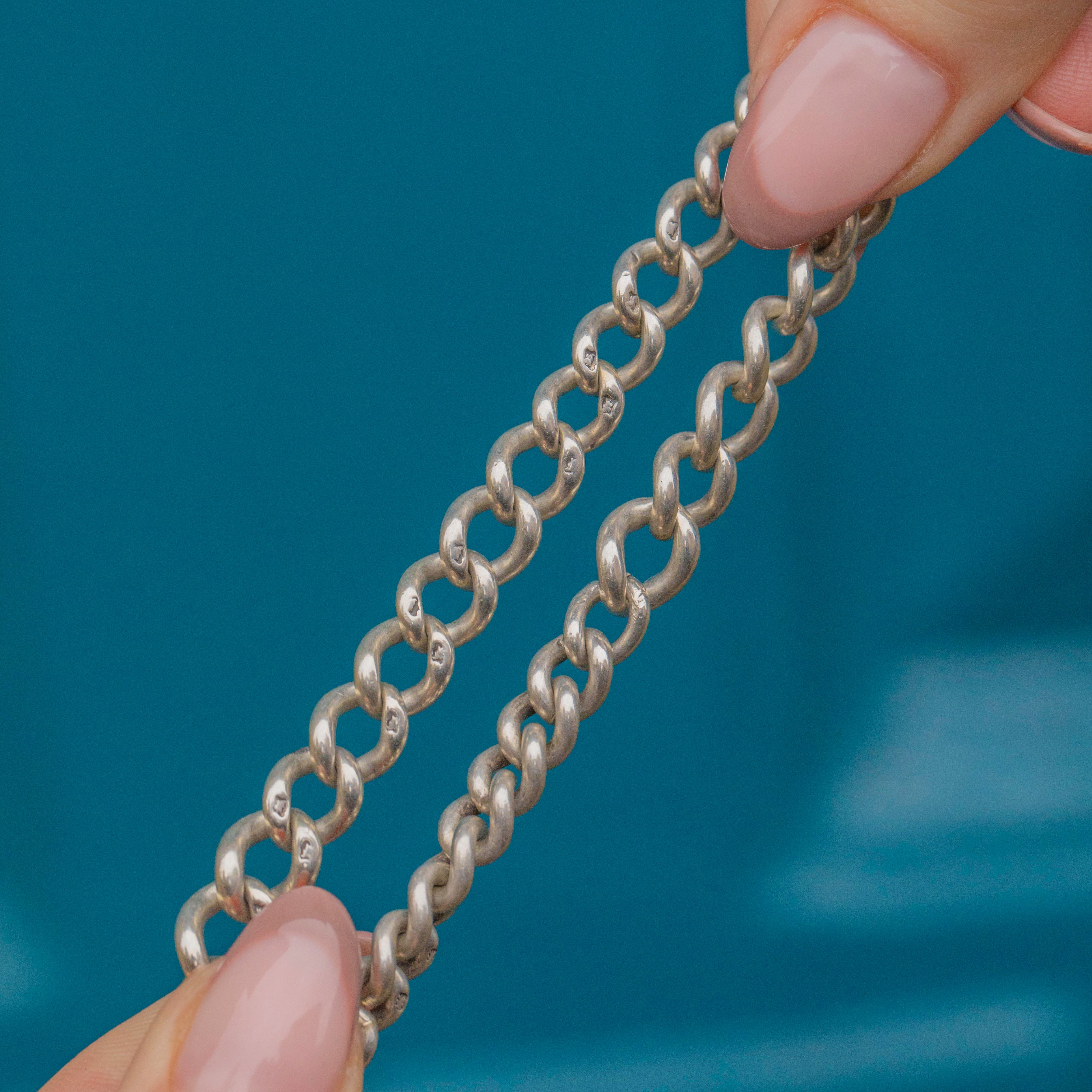 EXCELLENT. We are pleased to present this antique Silver graduating Albert chain in excellent condition. Her links are uniform and secure, with a lovely chunky feel and her Dog-clip is in great working order. With a full set of hallmarks dating to 1885, this Victorian chain will make a coveted addition to your collection!