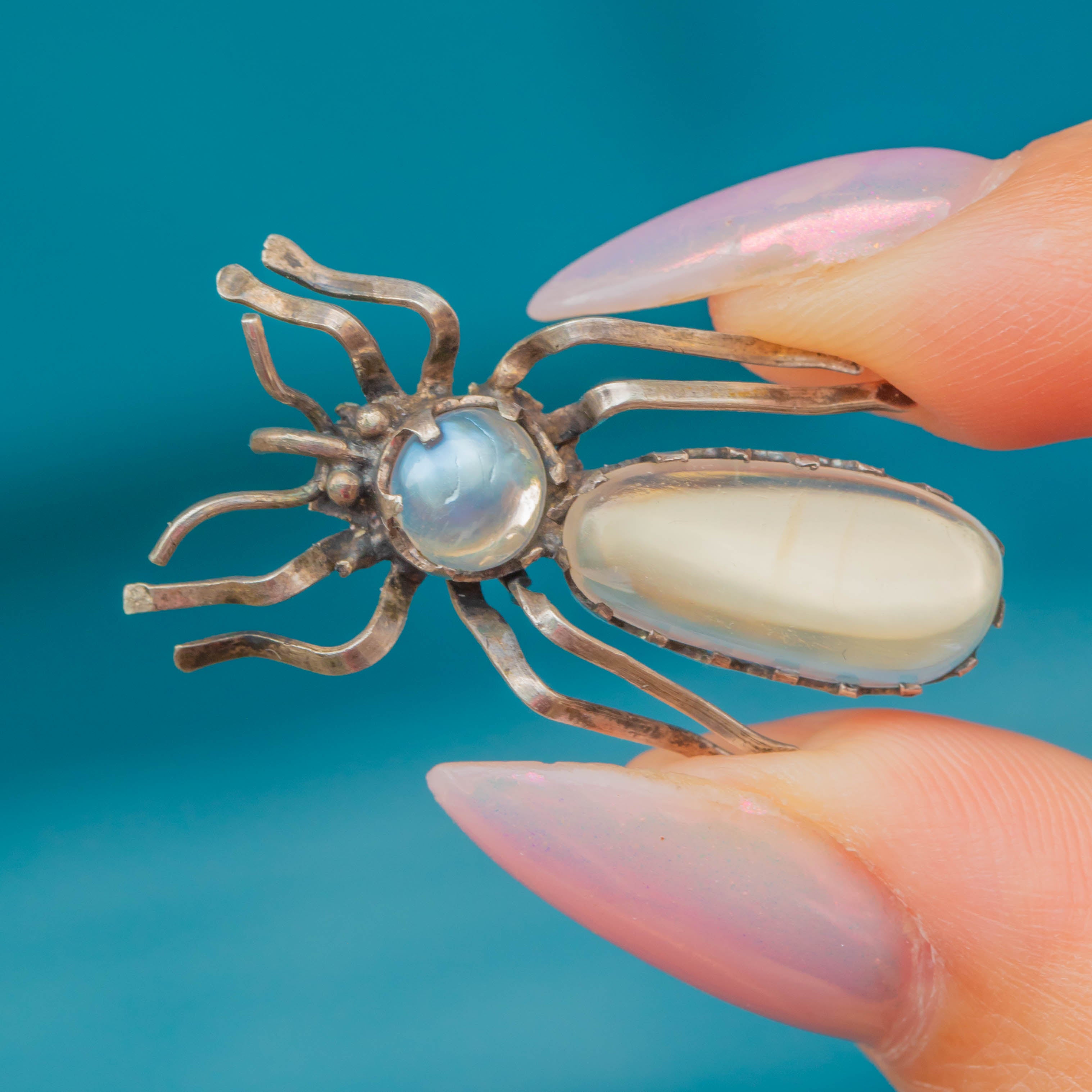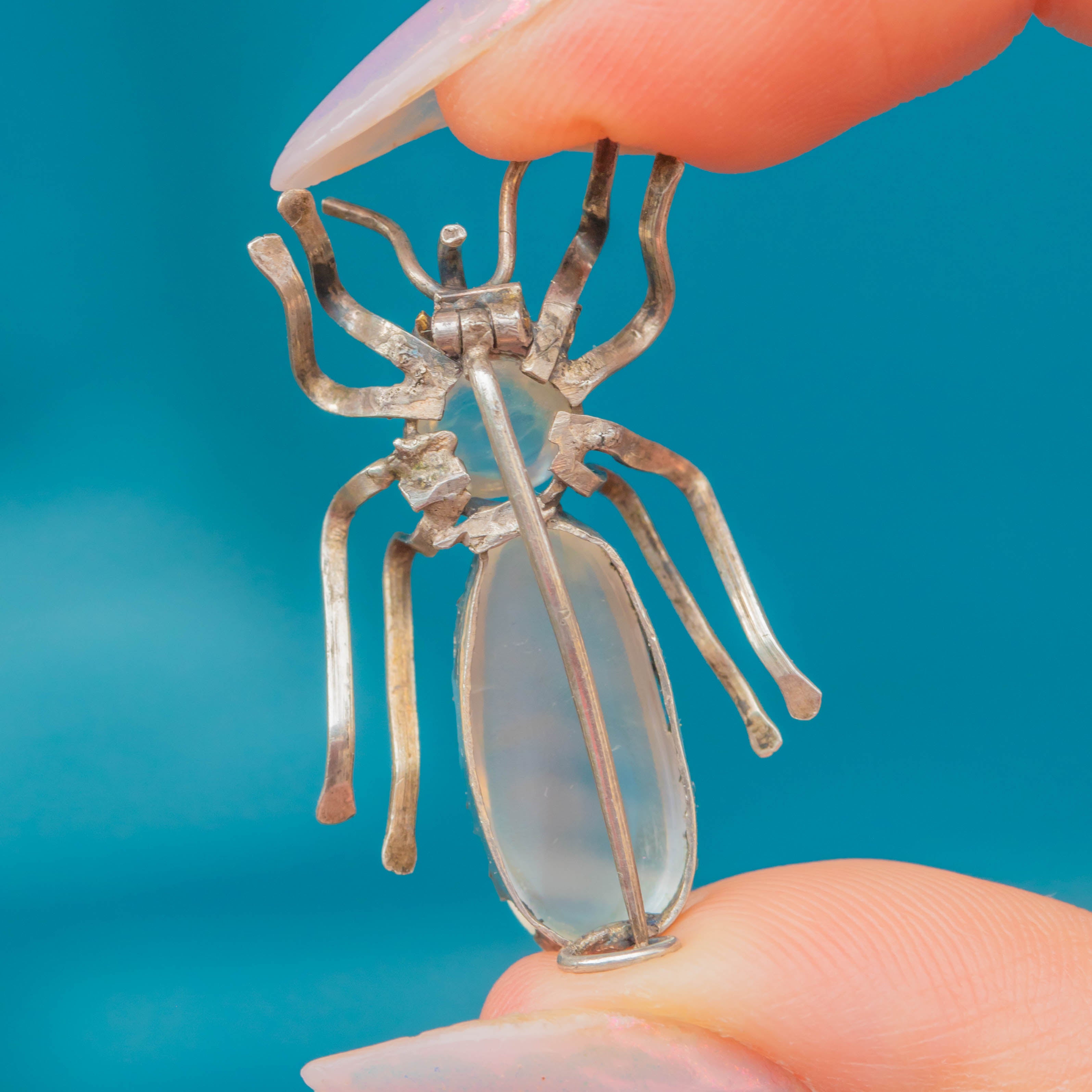 The bug is formed from Sterling Silver and inlaid with 3.10cts of Moonstone, their milky grey and pale blue adularescence enhanced by the light patina accured within the Silver details.