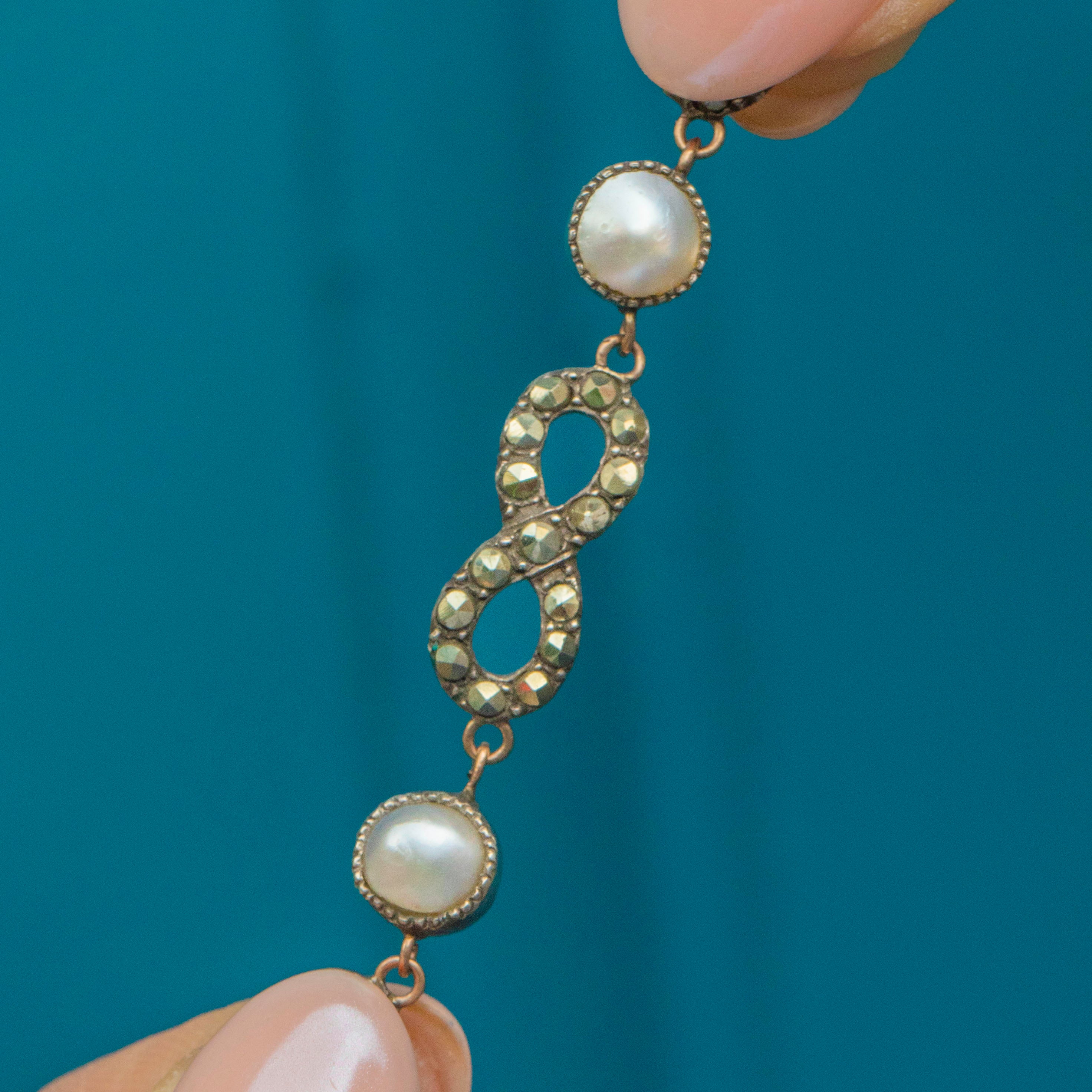 VERY GOOD. This antique Silver Mother of Pearl & Marcasite infinity link bracelet is in very good condition. The links are all securely connected and the Silver has accrued a lovely patina adding to her antique charm. The gemstones are snug in their settings, and although one of the Mother of Pearls is slightly off-centre, she is still glowing with no chips or scuffs. Her gorgeous 18ct Gold T-bar fastening is secure and strong allowing for confident wear.