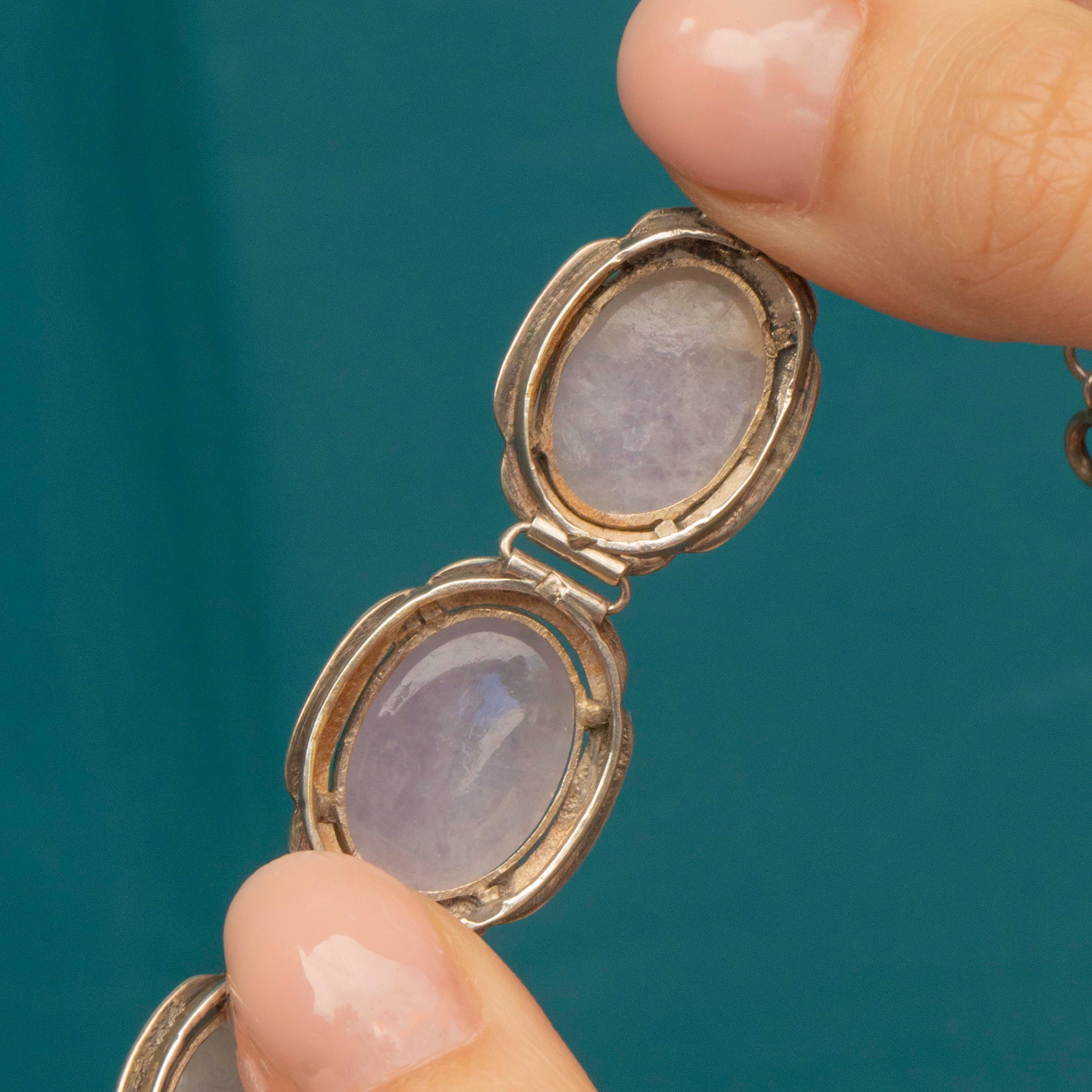EXCELLENT. This antique Silver Scottish Agate cabochon bracelet is in excellent condition. The gemstones are smooth and sleek, secure in their settings. The bracelet closes securely and has a safety chain for extra piece of mind. There is a little wear commensurate with age on the back of the stone settings, but this is not visible while the bracelet is worn! This is a gorgeous piece that can be enjoyed for decades more.