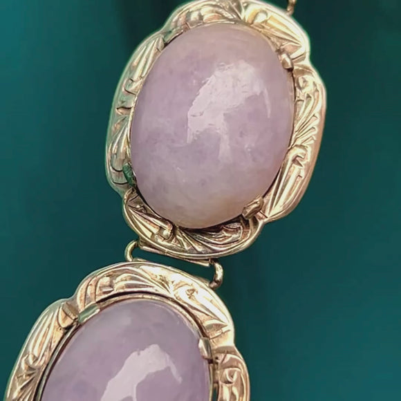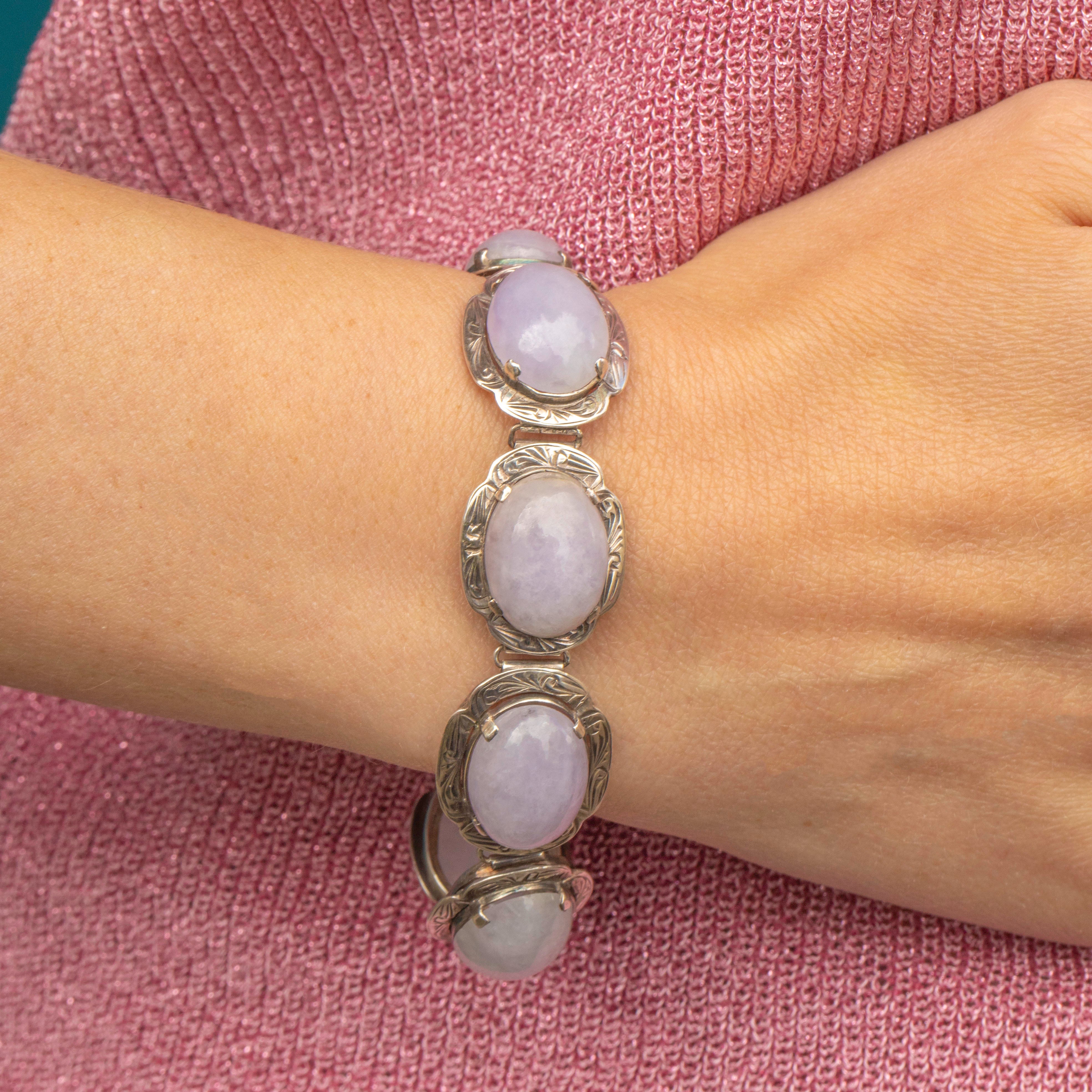 This antique Silver Scottish Agate cabochon bracelet is such a unique find. Inlaid with sleek lilac-hued Agate displayed within ornately engraved settings, this bracelet provides a great presence around the wrist!