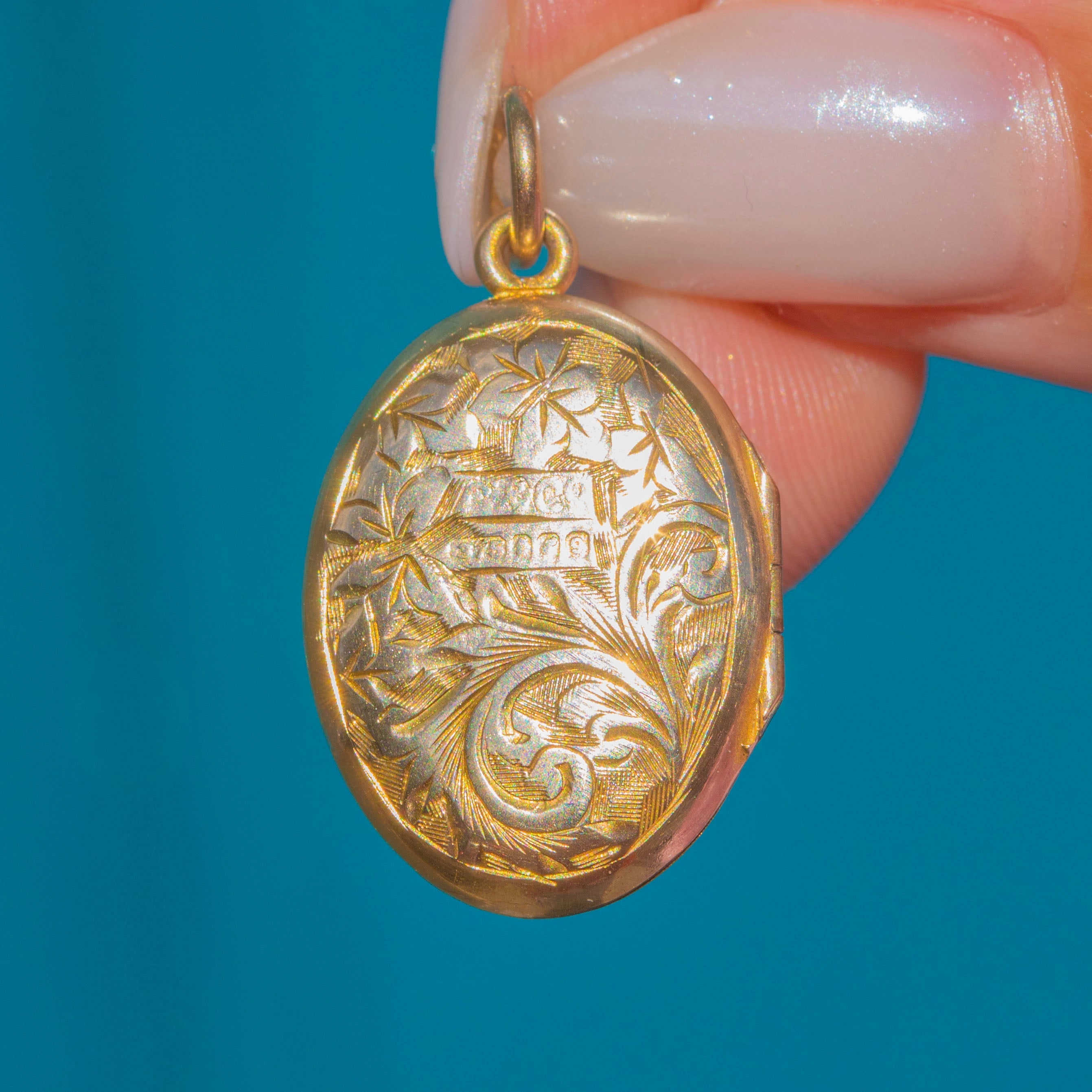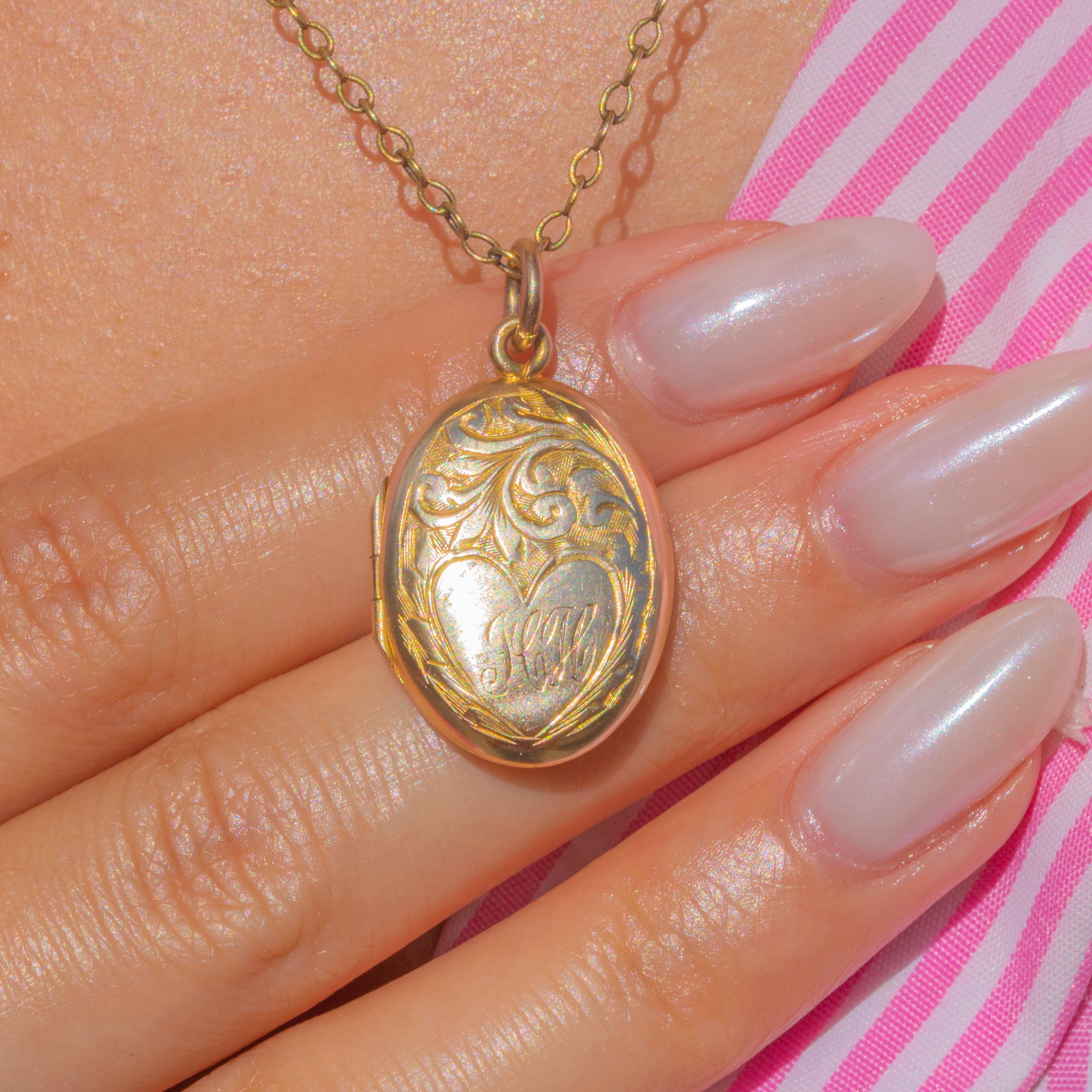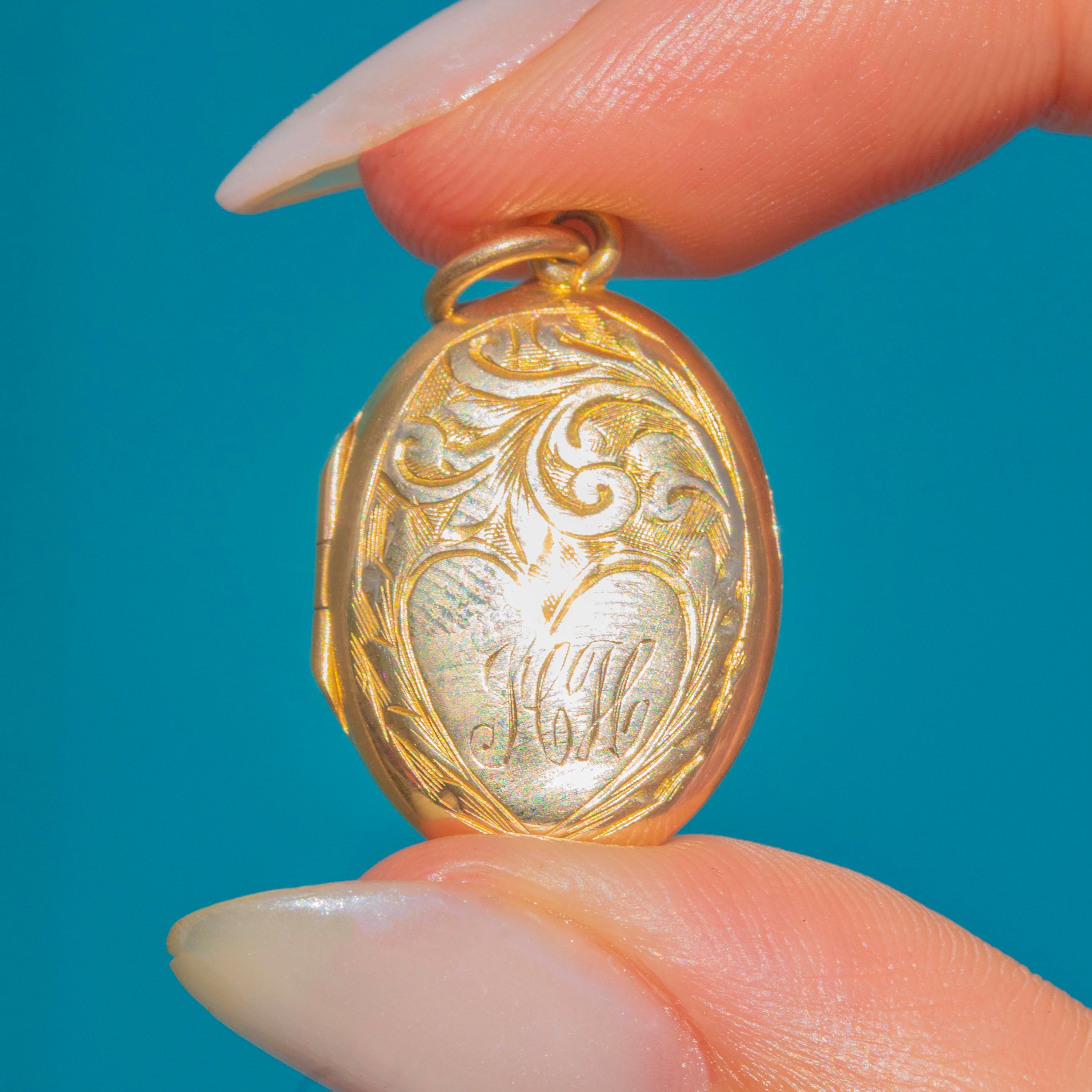 This is a beautiful Edwardian Gold engraved locket! This sweet piece has been lovingly engraved on both its front and back, with ornate floral acanthus leaf details, and the initials HH in a heart-shaped cartouche.