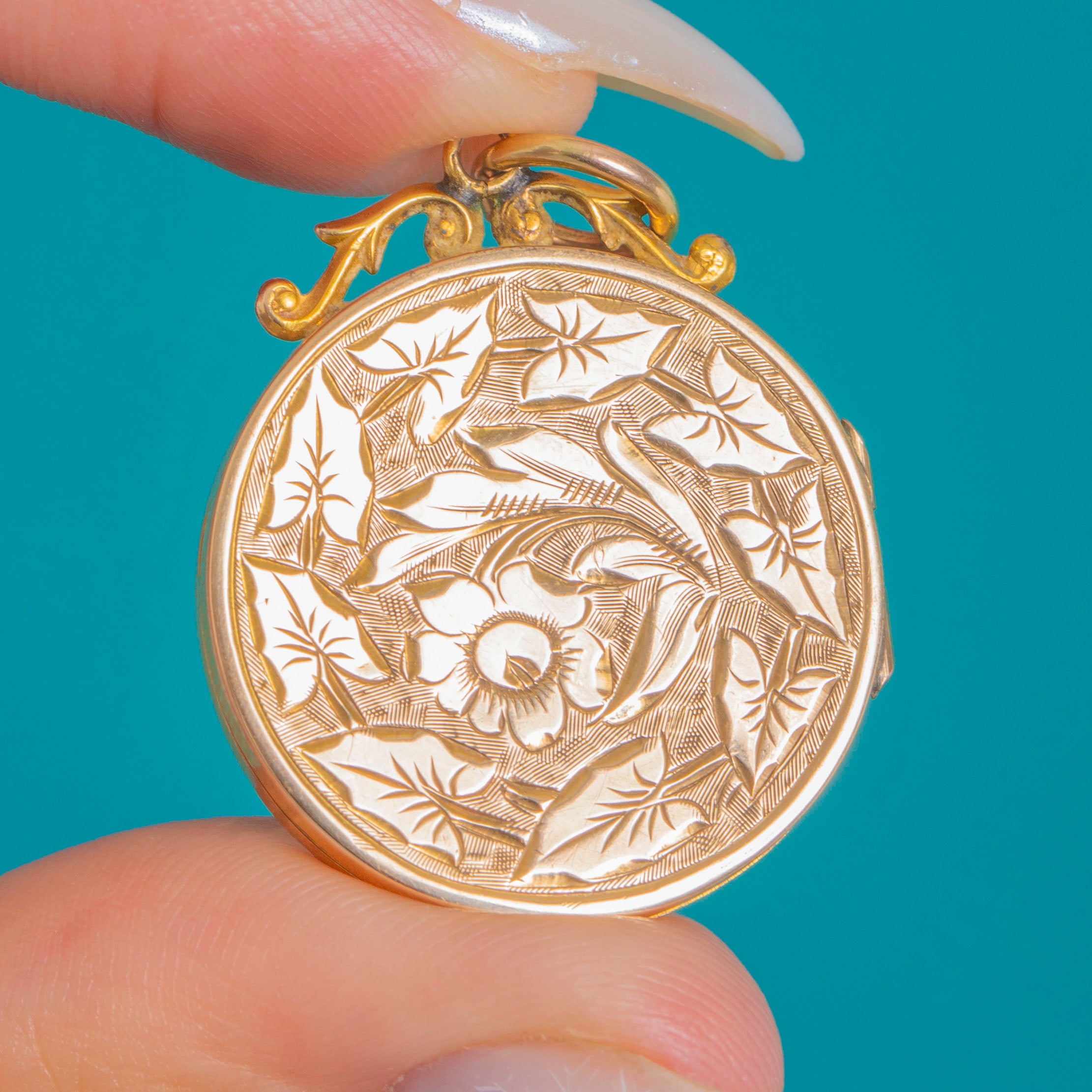 Brimming with late Victorian charm, this solid 9ct Gold round locket is richly hand-engraved with romantic foliate motifs framing a polished cartouche. An ornate scrolled surmount and jump-ring bail add a graceful, decorative flourish, while the warm glow of 9ct Gold enhances every bright-cut line.
