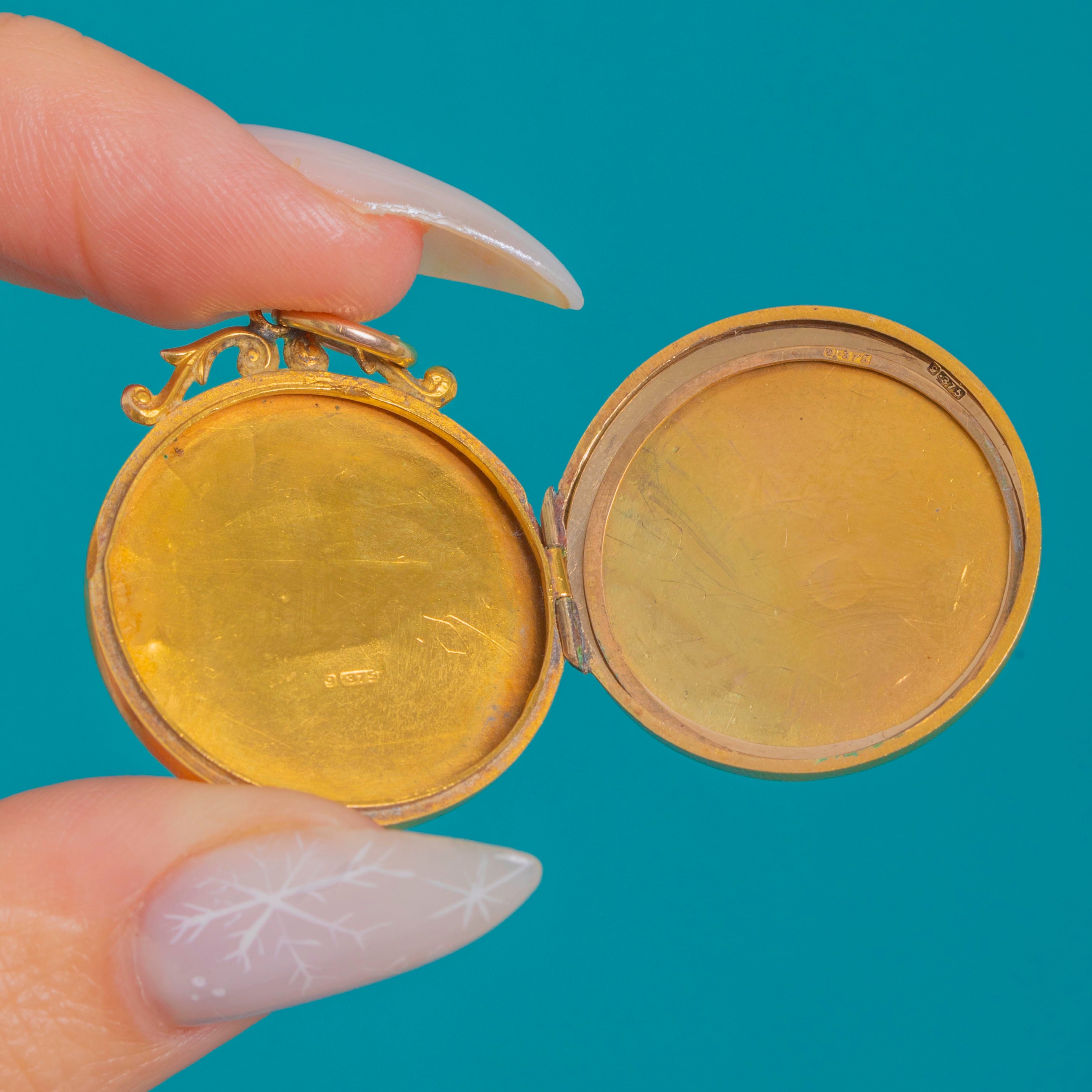 Open it to reveal twin circular photo compartments, ideal for cherished mementos. The side hinge is strong and precise, and it closes with a satisfying snap. Inside you’ll find “9” and “375” marks confirming 9ct Gold.