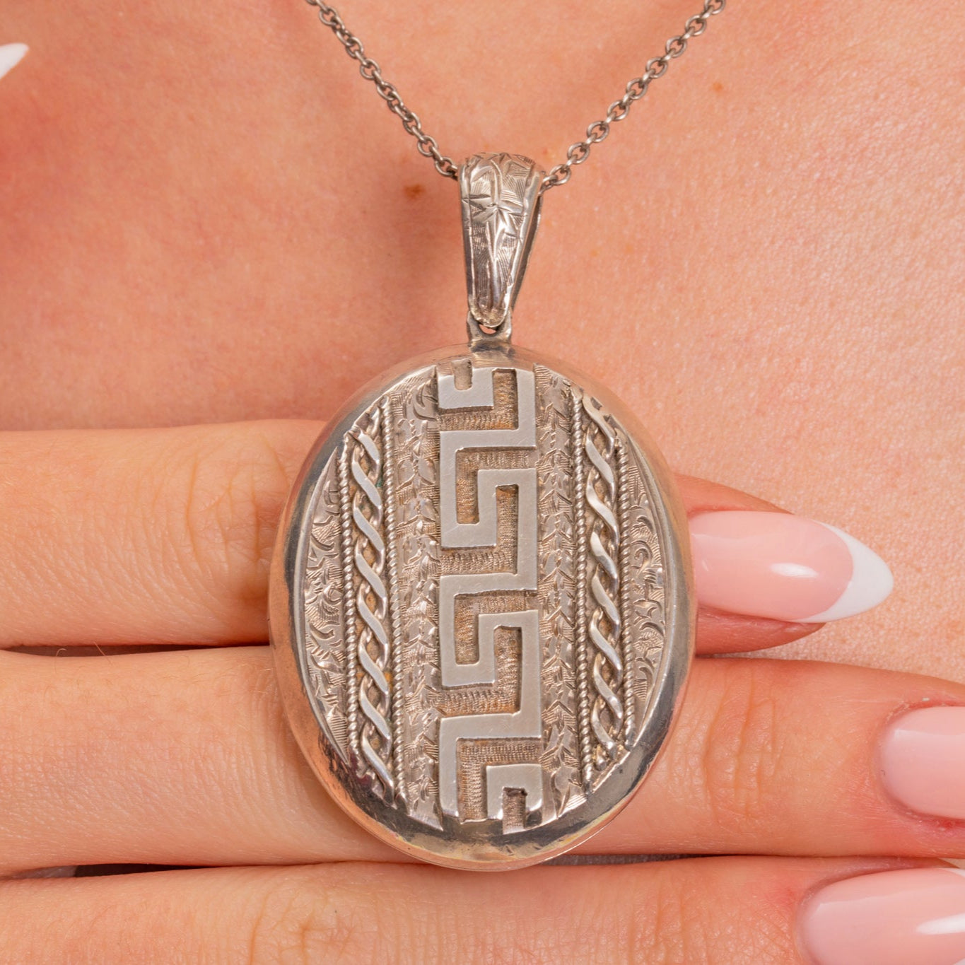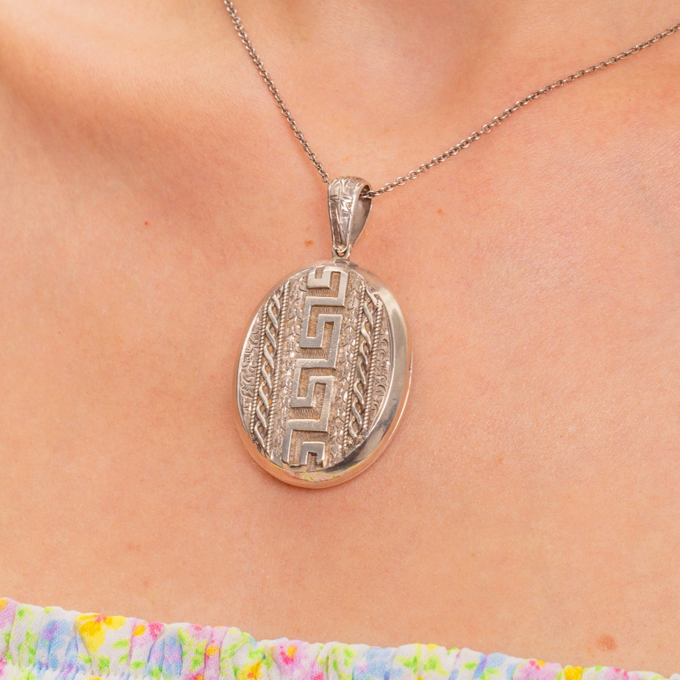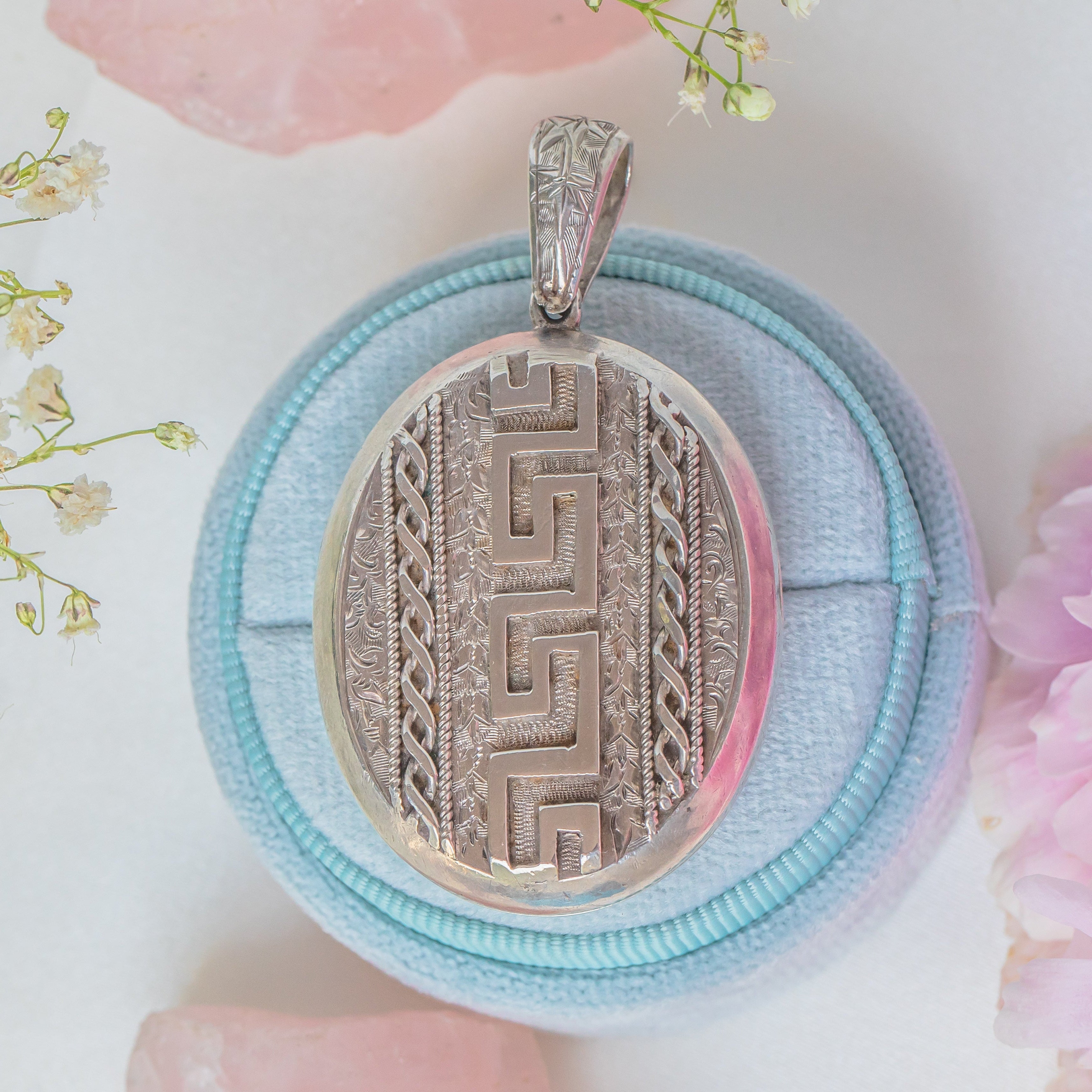 This antique Sterling Silver Greek key pattern locket has an exquisite Hellenistic design, with every inch of the front adorned with decorative detailing. A piece inspired by Ancient Greek history!