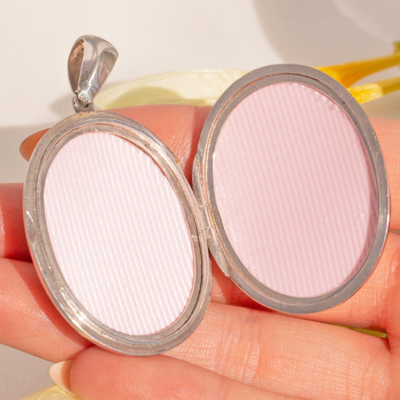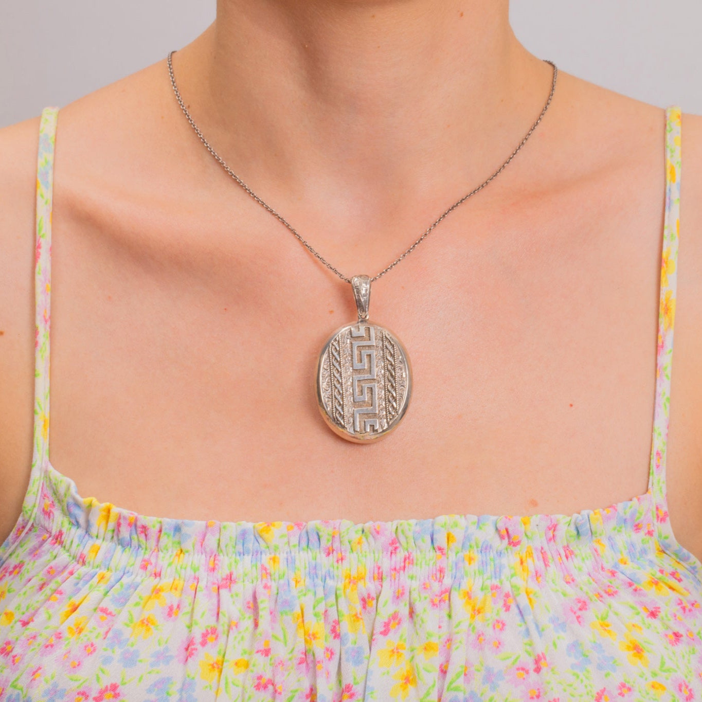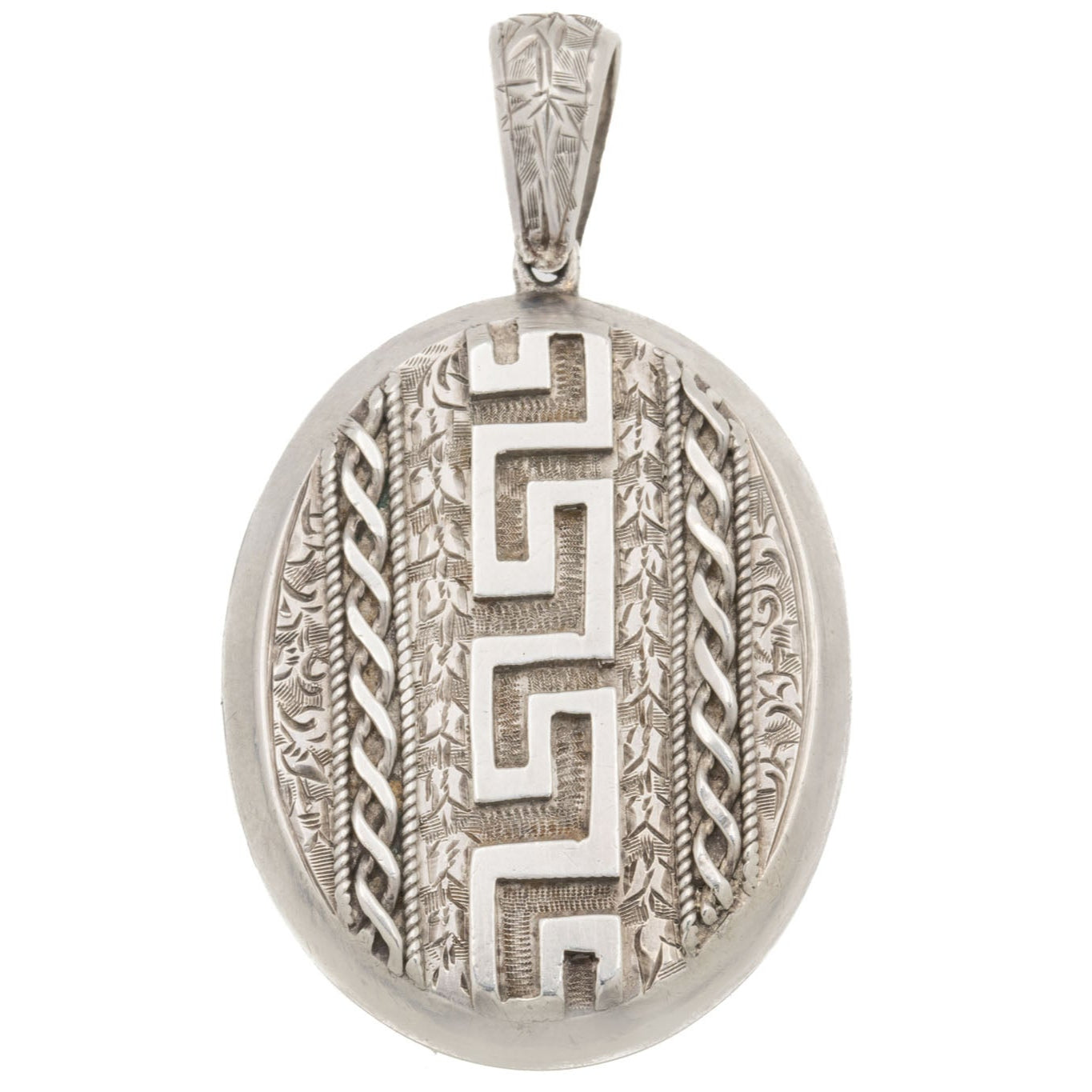 This antique Sterling Silver Greek key pattern locket has an exquisite Hellenistic design, with every inch of the front adorned with decorative detailing. A piece inspired by Ancient Greek history!