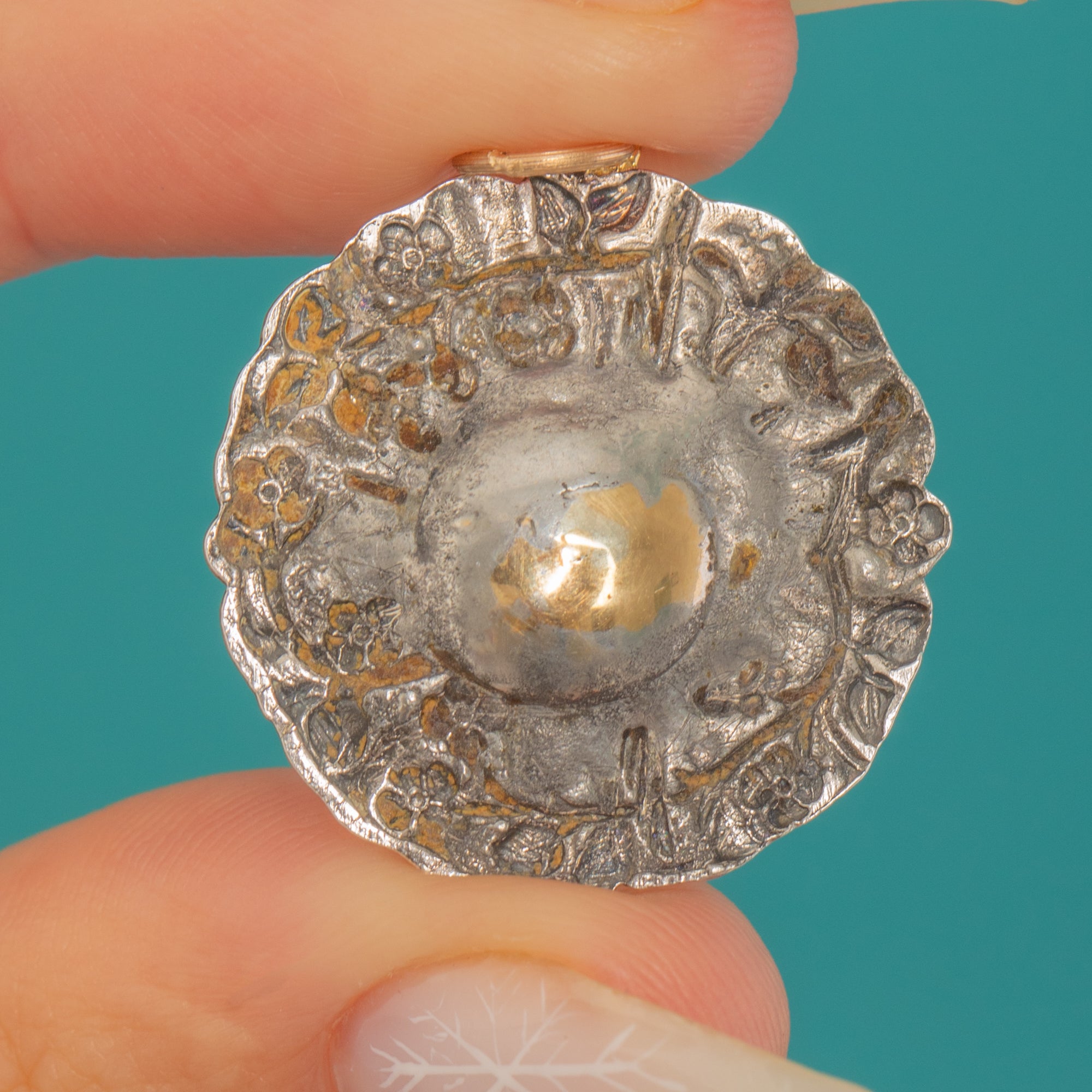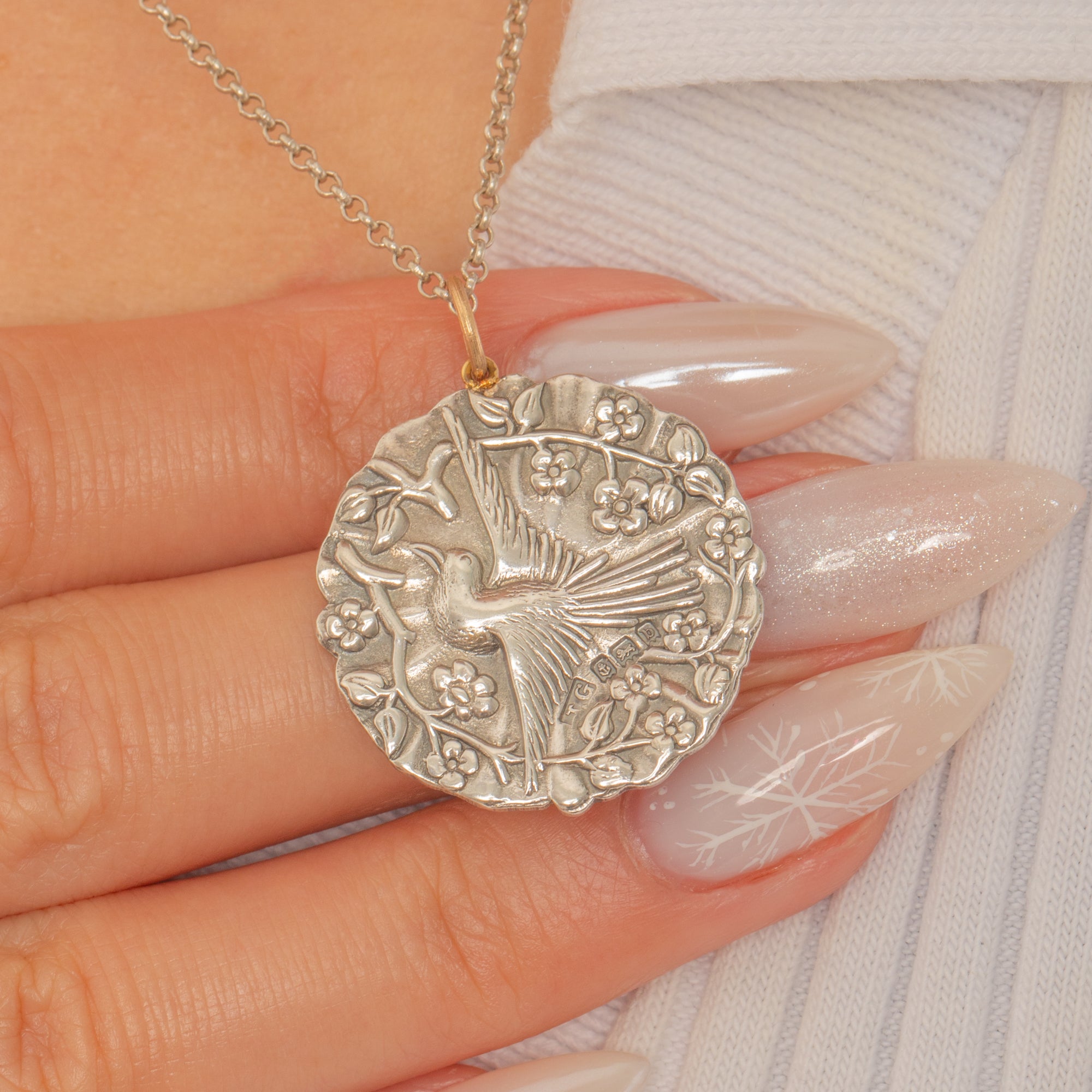 A lyrical Art Nouveau treasure, this Sterling Silver medallion depicts a Phoenix in high relief sweeping through blossom-laden branches, framed by a softly scalloped border. The flowing lines and naturalistic detailing are beautifully defined, with a gentle patina settled in the recesses to accentuate the sculptural design.