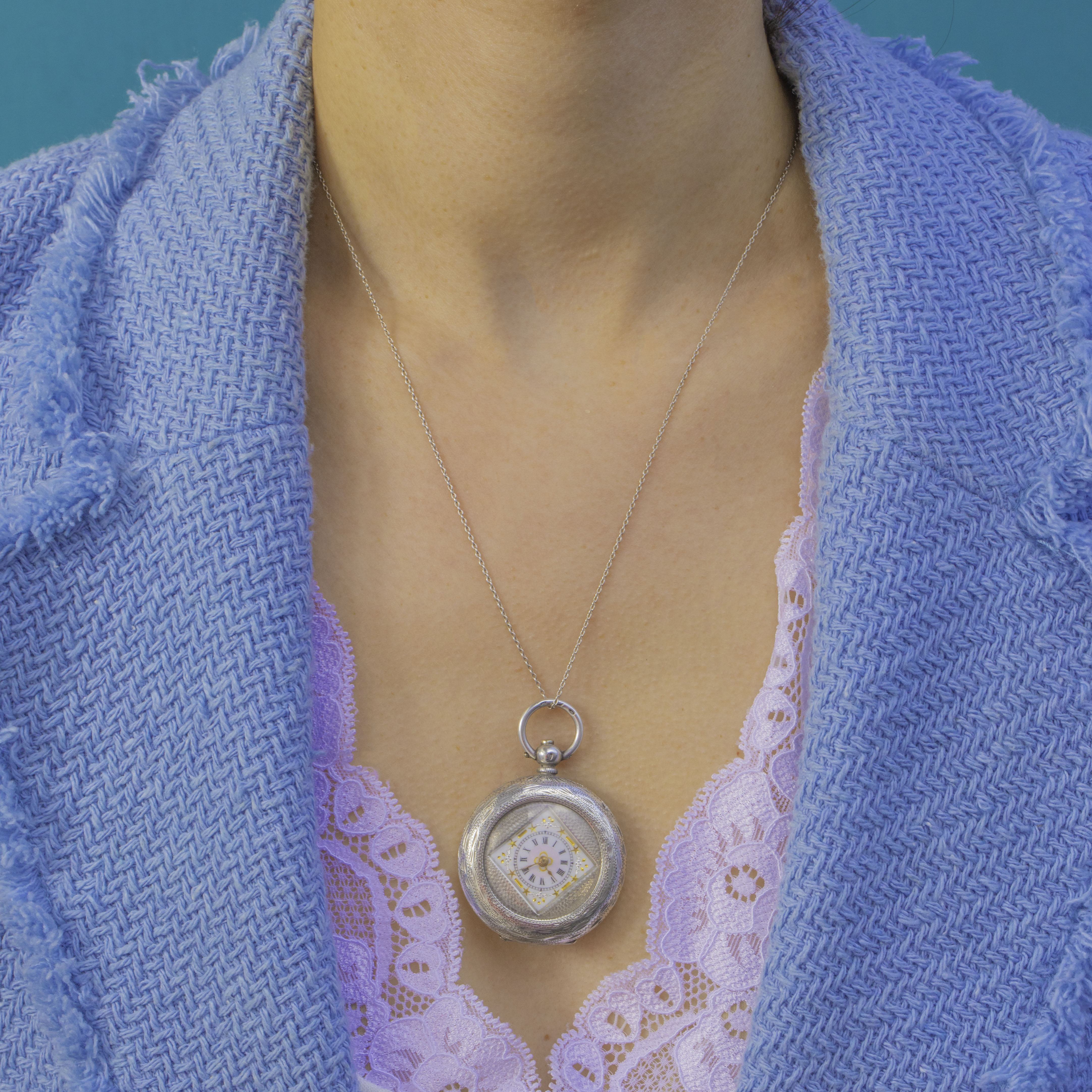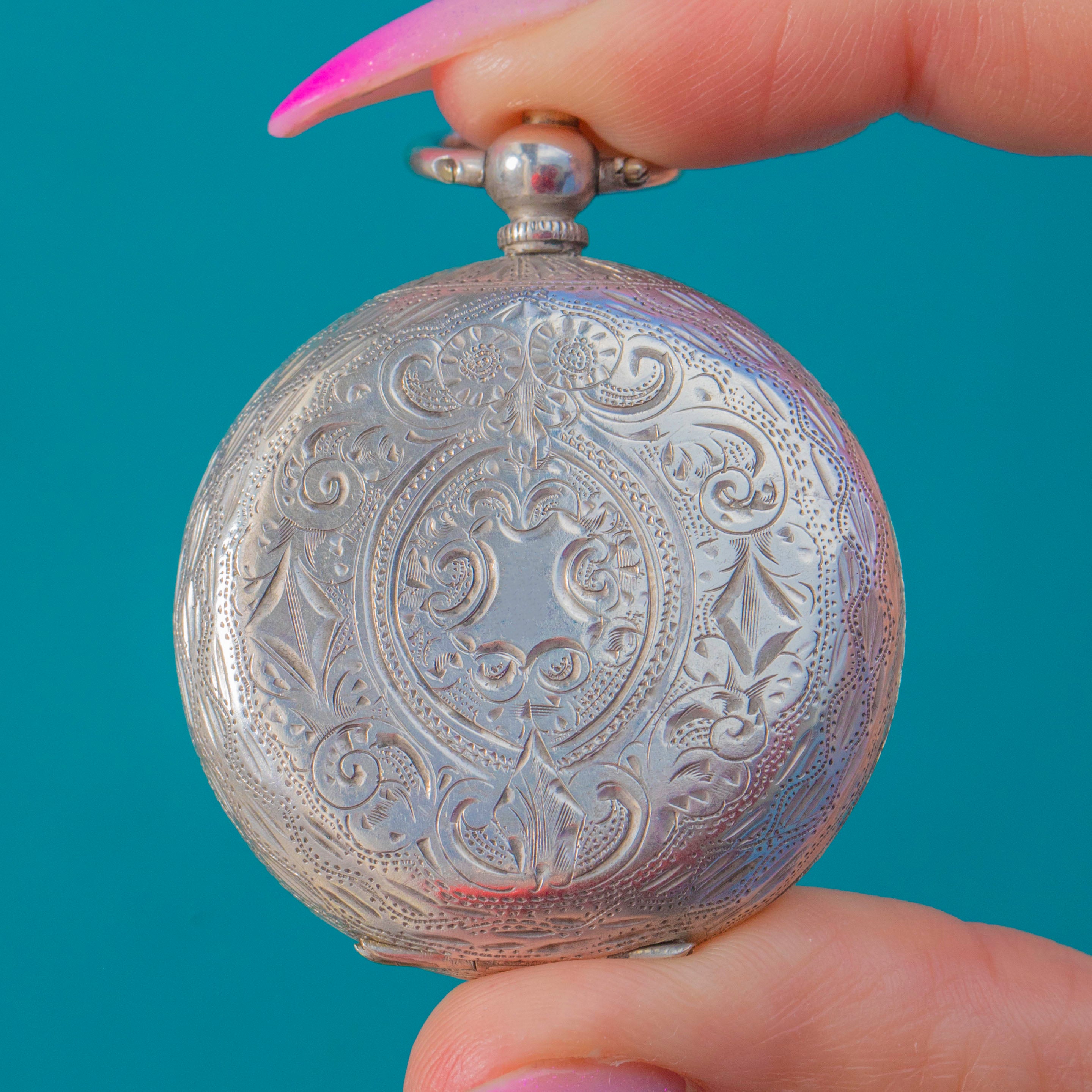 Stamped “930” for high-purity Swiss Silver, this charming key-wind, key-set watch comes complete with its original winding key. Press the top pusher to open the back for winding and setting. It ticks away nicely when wound and closes securely—an exquisite, wearable jewel of time.