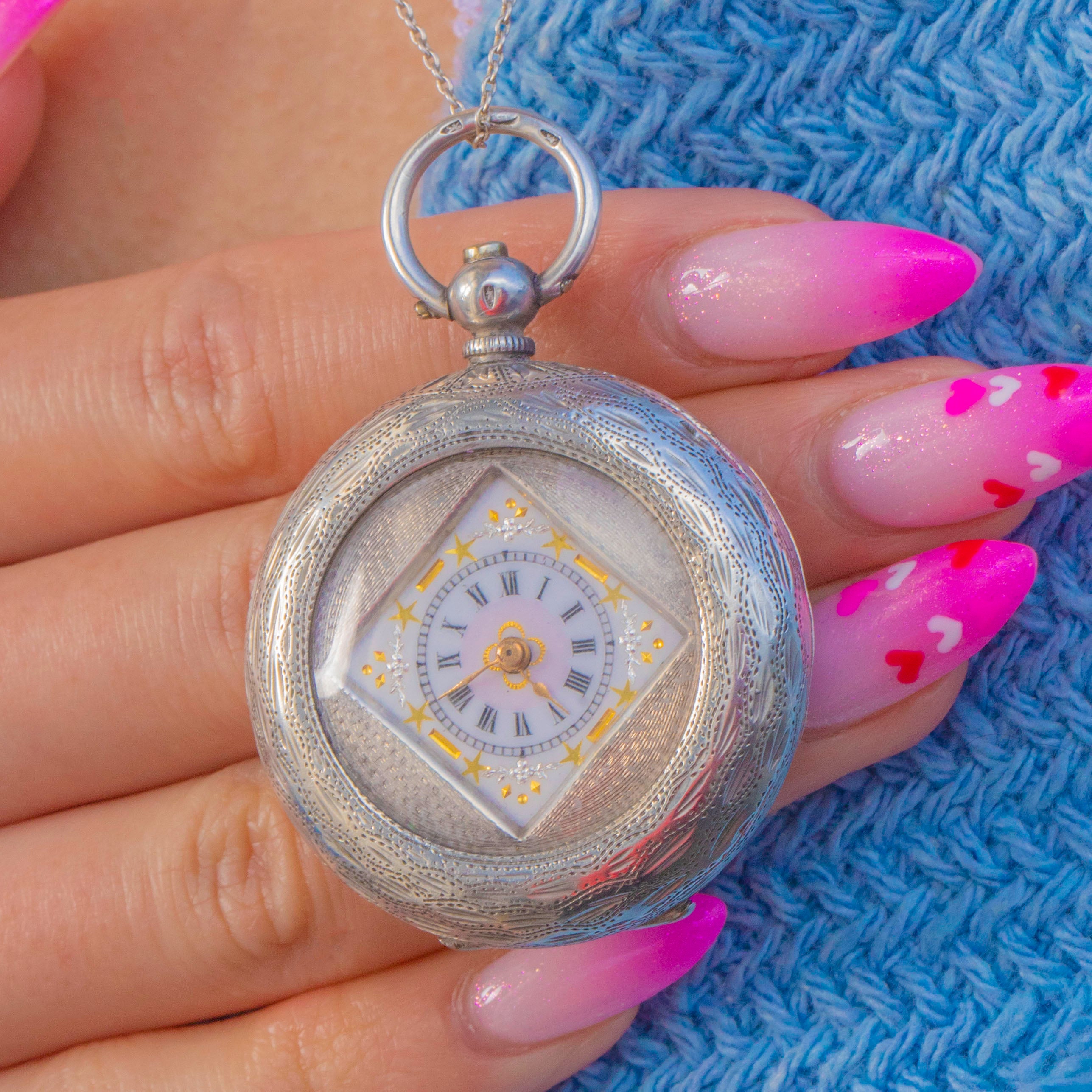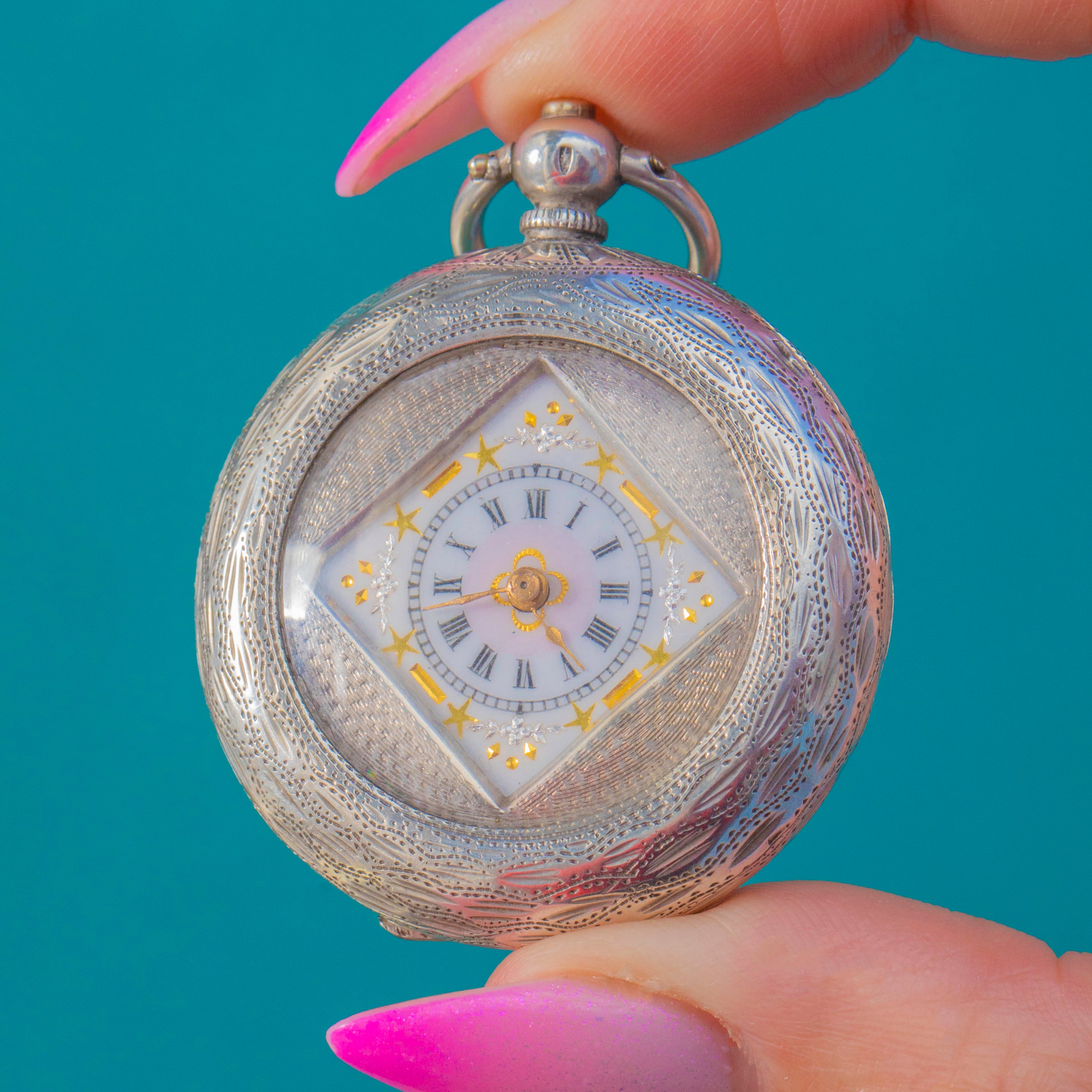A rare and beautifully ornate Edwardian Swiss Silver ladies’ fob watch, styled as a petite demi-hunter with a distinctive square glazed aperture. The case is richly detailed with engine-turned guilloché and elegant engravings, framing a pristine White Enamel dial with bold Black Roman Numerals and delicate Gold star and baton detailing.