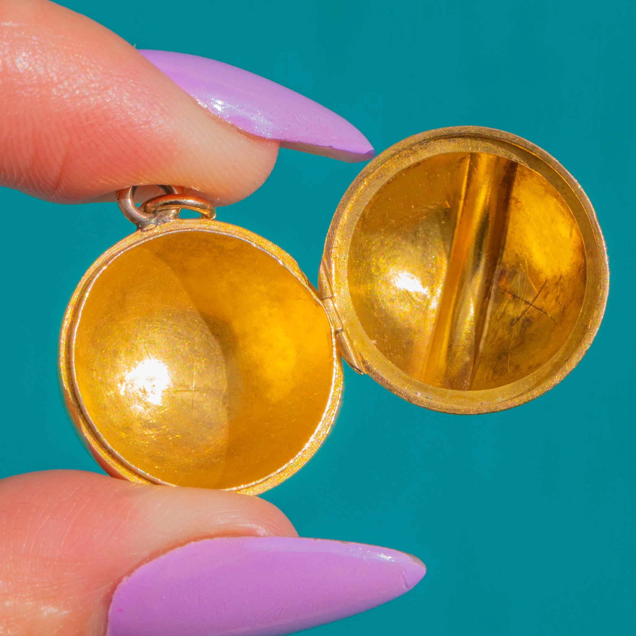 The pendant opens at the equator via a neat hinge and opposing catch, revealing a bright, reflective interior. A small integrated bail completes the silhouette, ready to style on your favourite chain. Understated yet luxurious, it’s a beautiful nod to Victorian design in a clean, contemporary-feeling form.