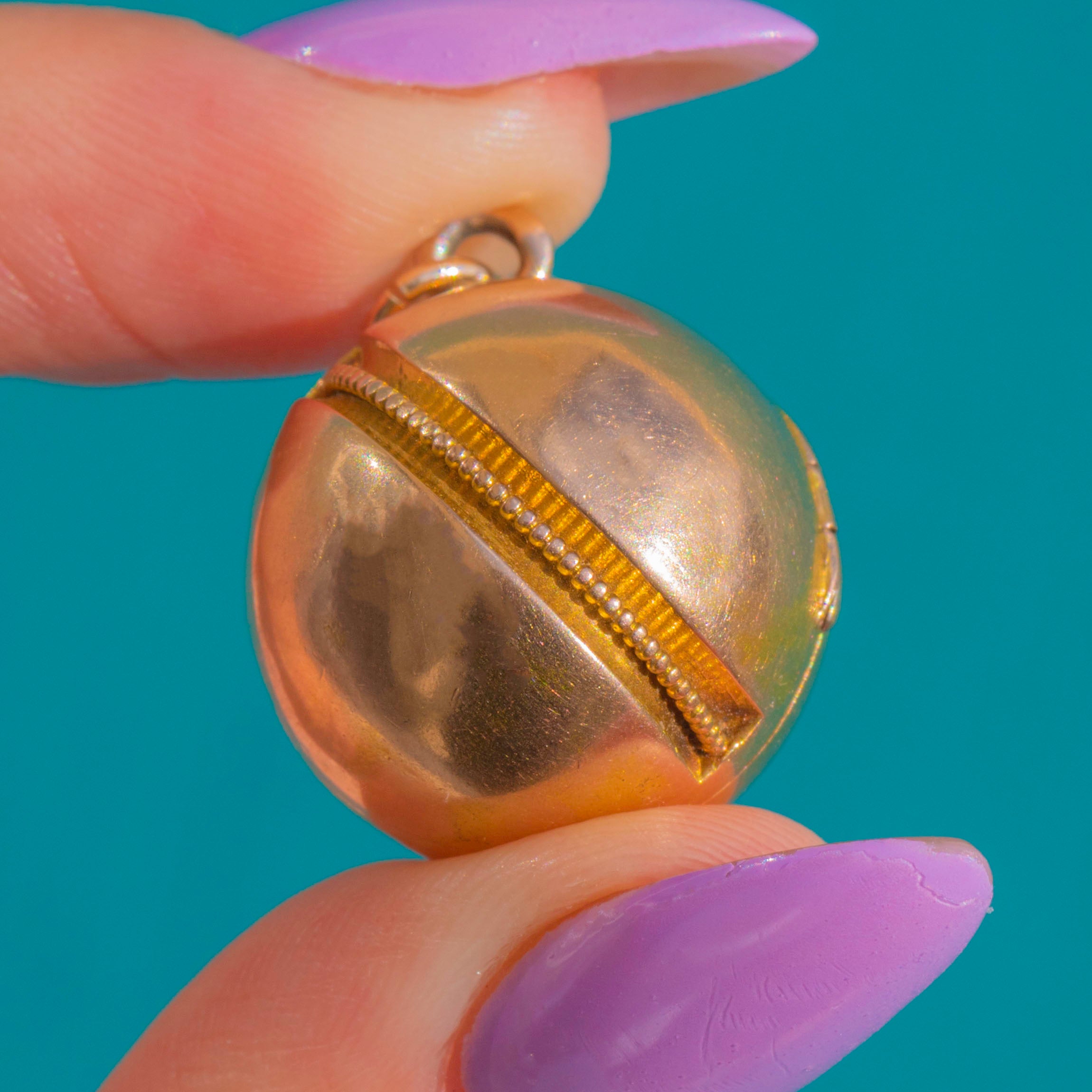 A charming Victorian 15ct Gold orb trinket pendant with timeless, sculptural simplicity. The smooth, high-domed sphere is encircled by a fine beaded milgrain band at the equator, adding delicate texture and definition to the glossy Gold surface.