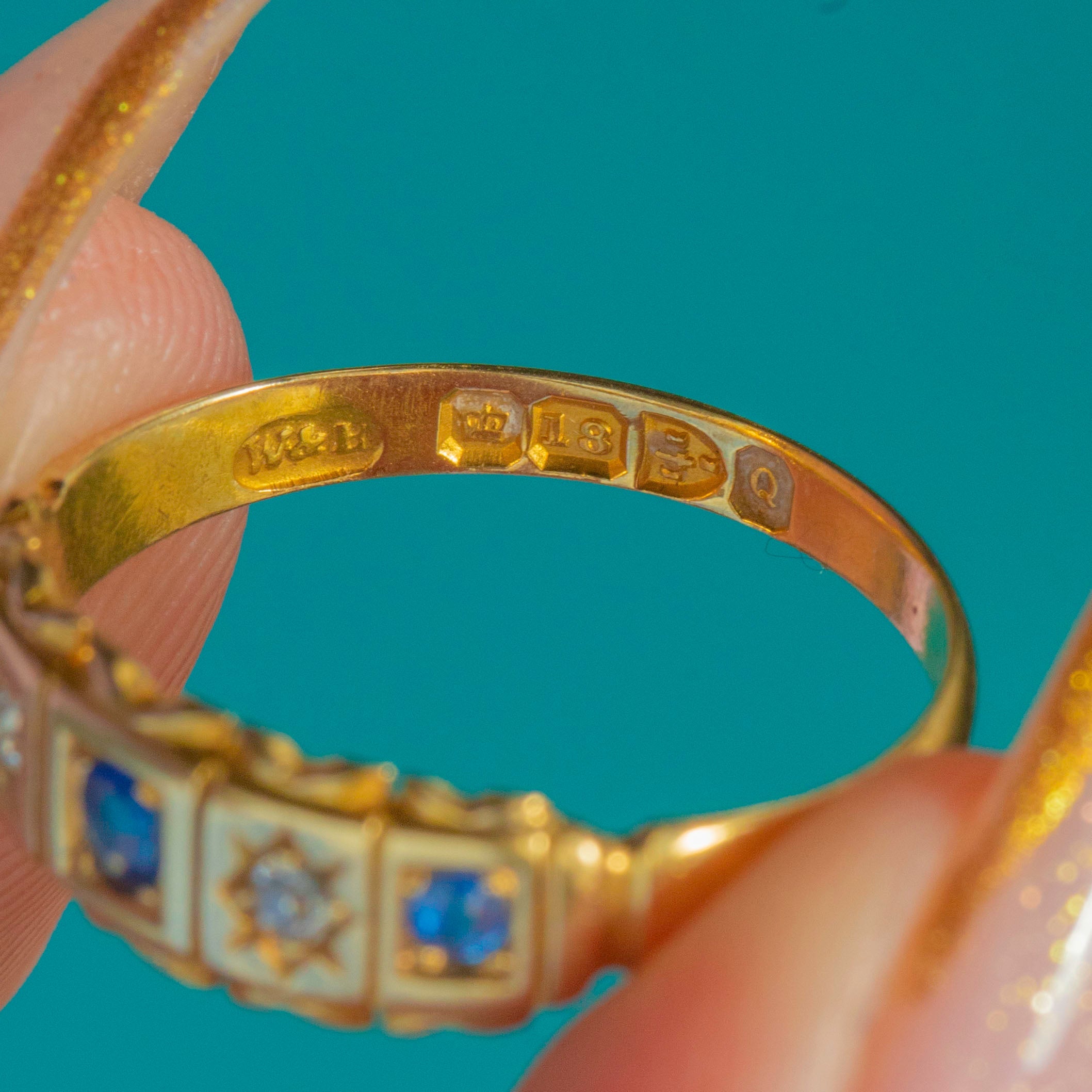 MATERIALS: Tests as 18ct Gold, Blue Sapphires, Diamonds.