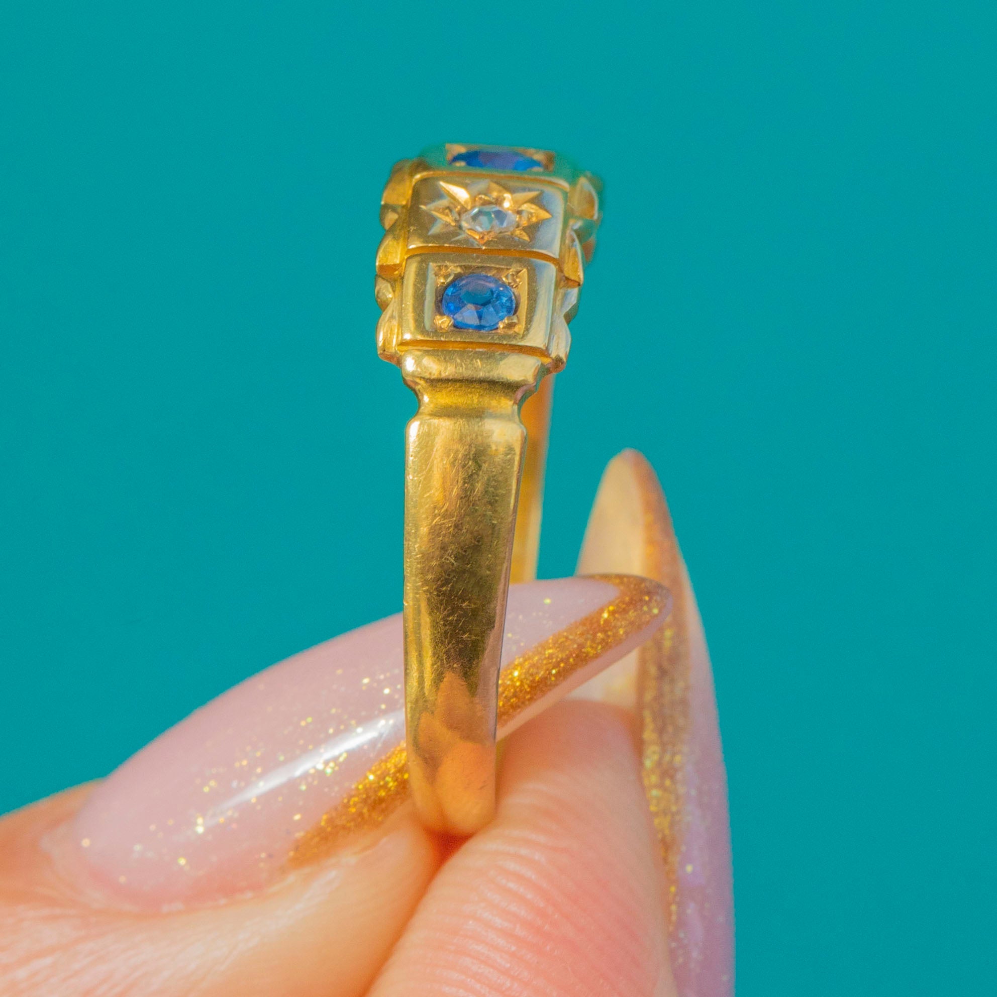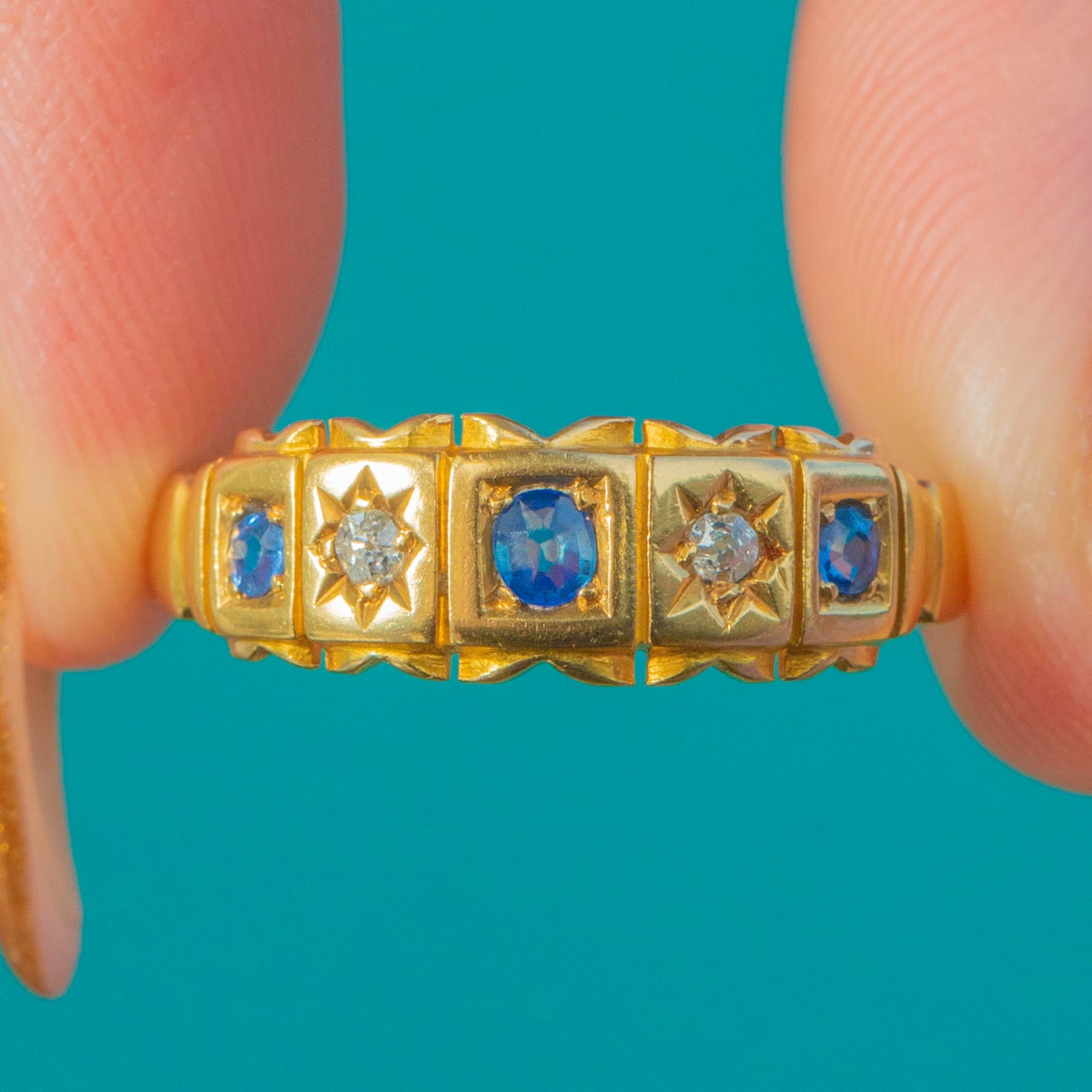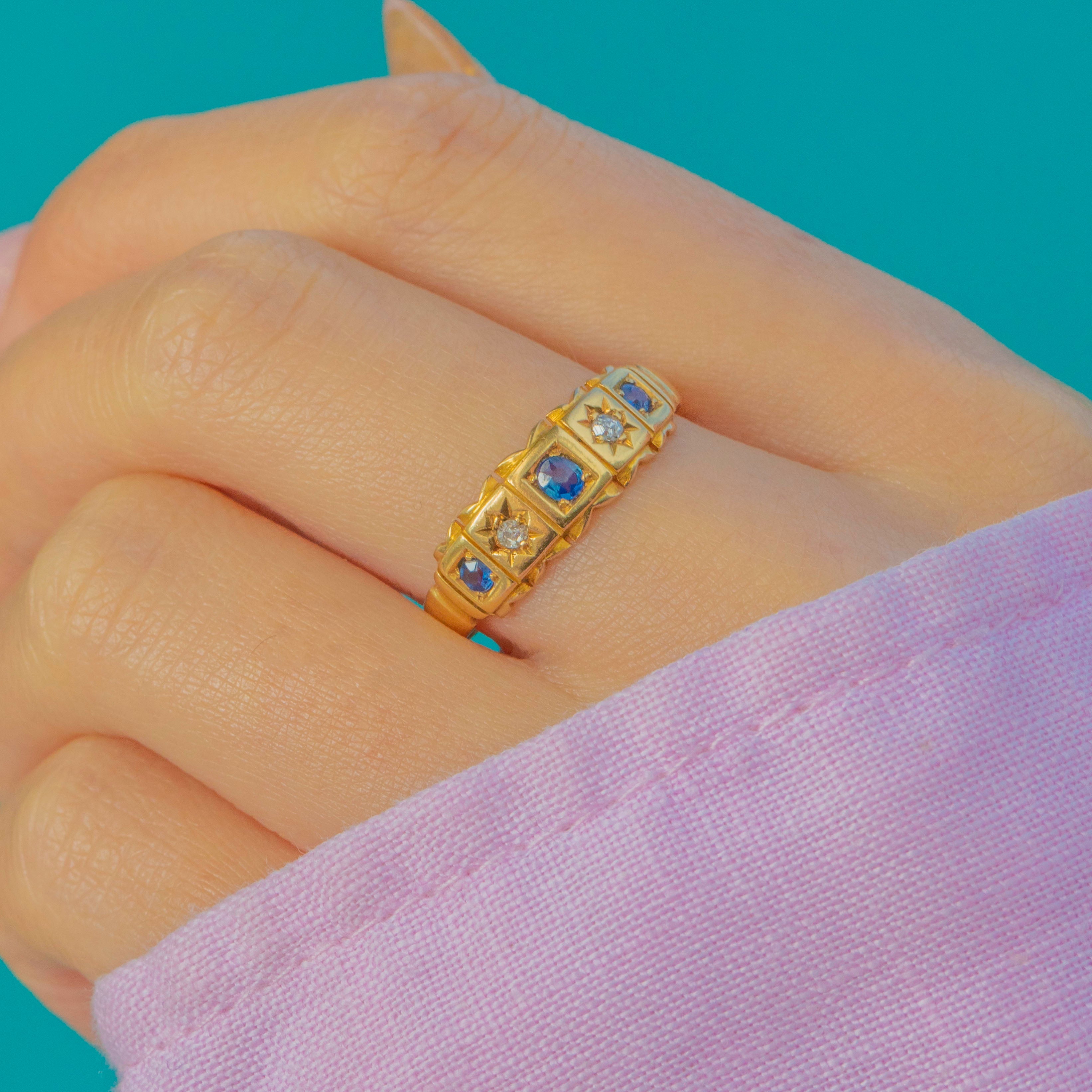 A wonderful late Victorian 18ct Gold gypsy ring set with natural Blue Sapphires and sparkling old mine cut Diamonds, fully hallmarked for Chester, 1899. The ring features alternating square and star-shaped settings, each gemstone framed in crisp, deeply engraved details—an iconic Victorian design that is both charming and effortlessly wearable.